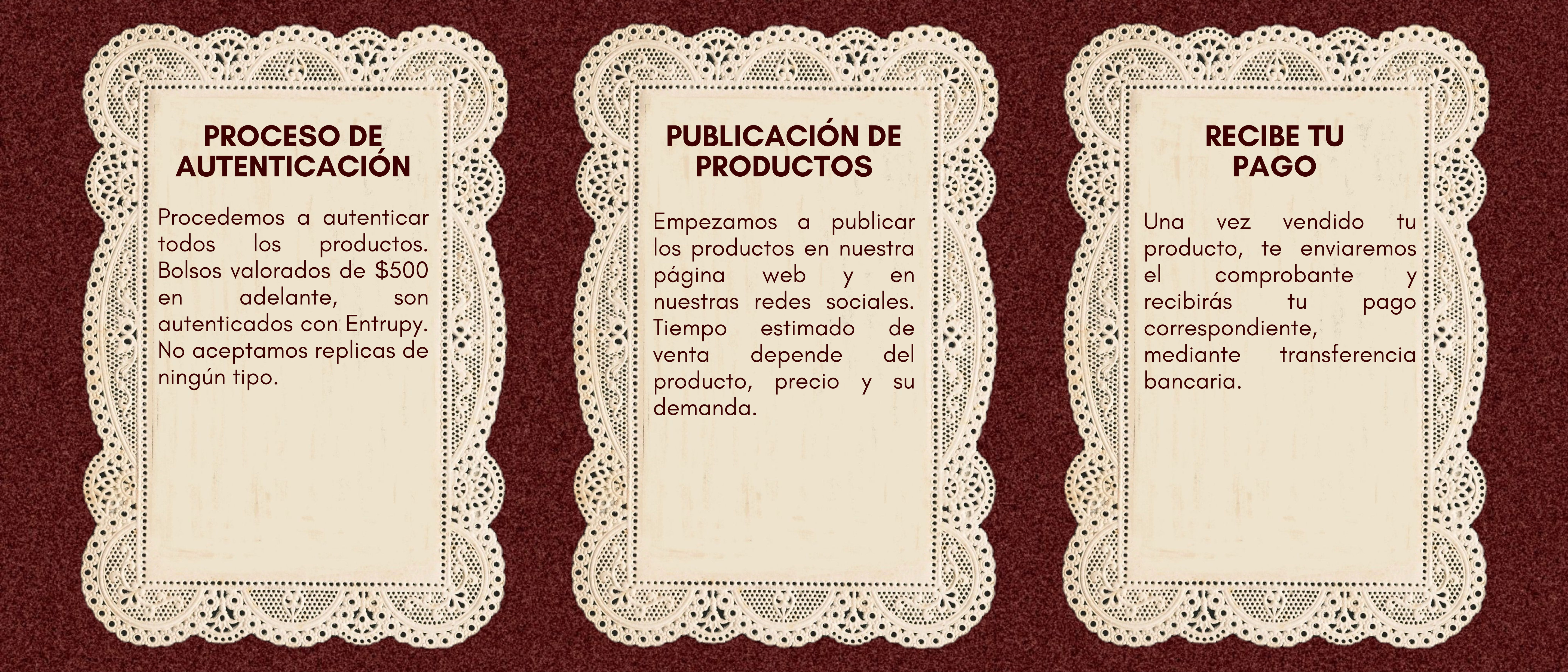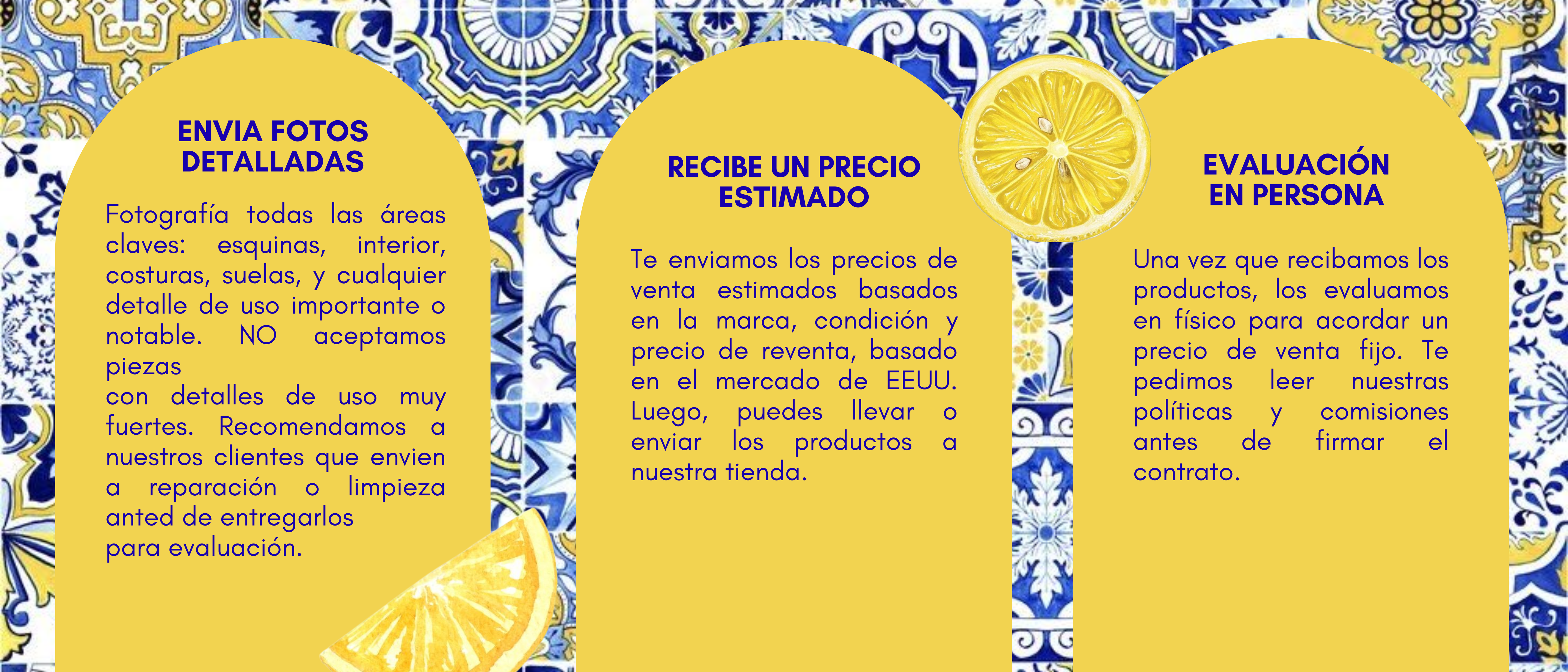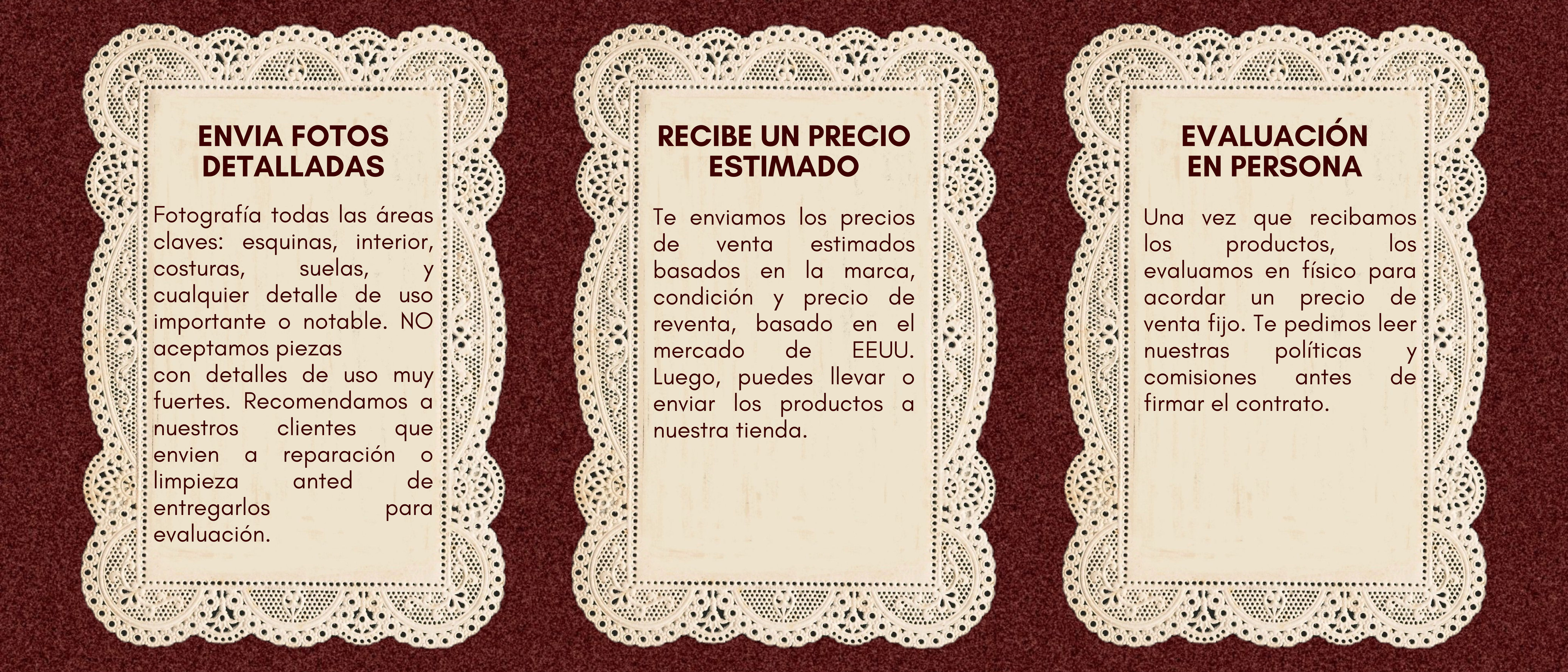 Aceptamos un poco de todo, nuestro enfoque es productos de dama, por ejemplo; calzado, bolsos, relojes, lentes de sol, etc. Desde marcas de alta gama como Chanel, Dior, y Louis Vuitton, hasta media gama como Michael Kors, Kate Spade, Steve Madden. Las piezas tienen que cumplir ciertos requisitos para ser aceptadas... Toca aqui para mas información