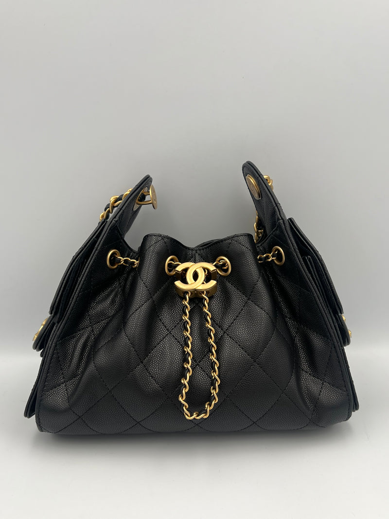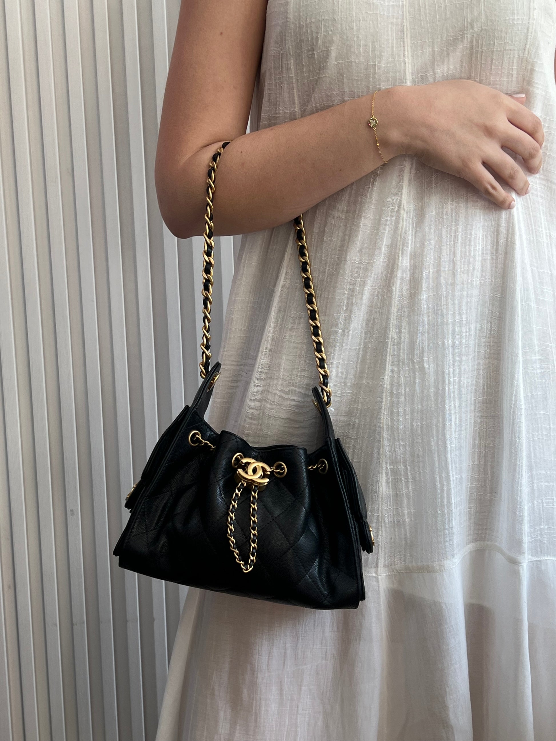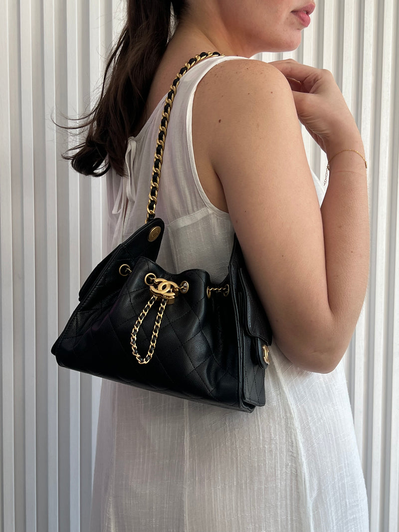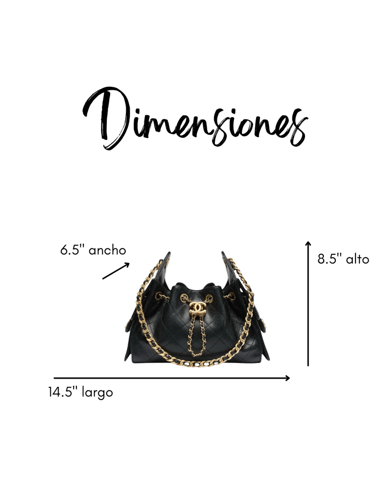 Elaborada en cuero de becerro graneado, combinada con herrajes en metal dorado. Presenta una estructura suave tipo hobo, con el icónico acolchado en rombos, cierre de cordón con logo CC y correa de cuero entrelazado con cadena, ofreciendo un interior forrado en tela con bolsillos funcionales para un uso práctico y elegante.