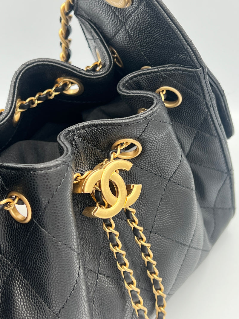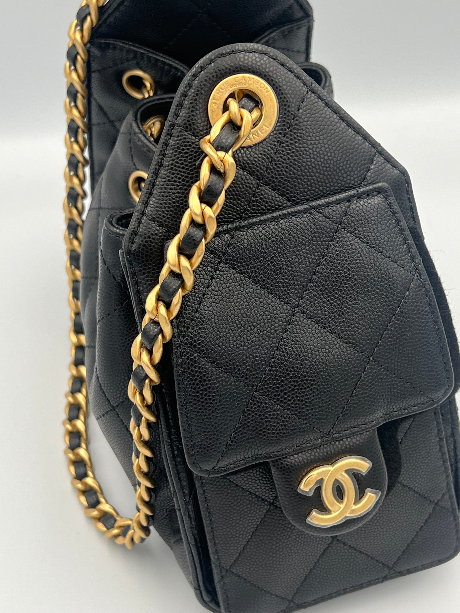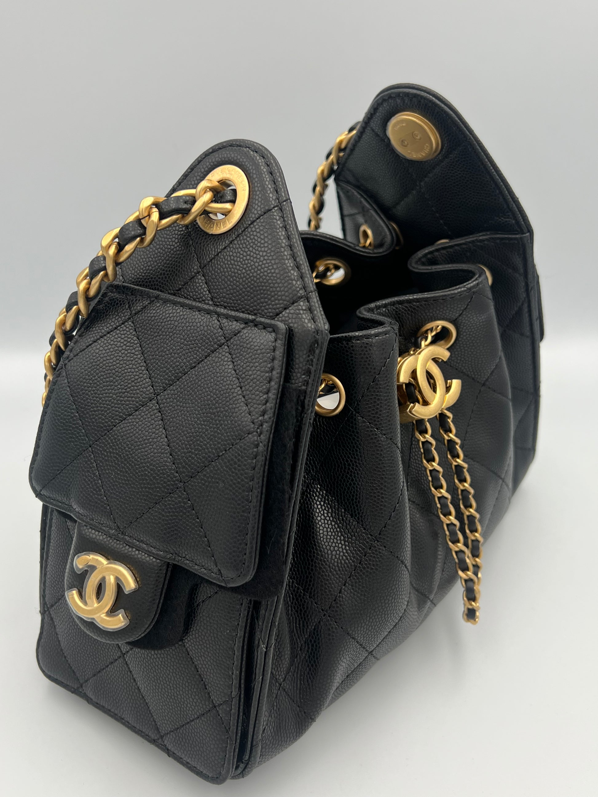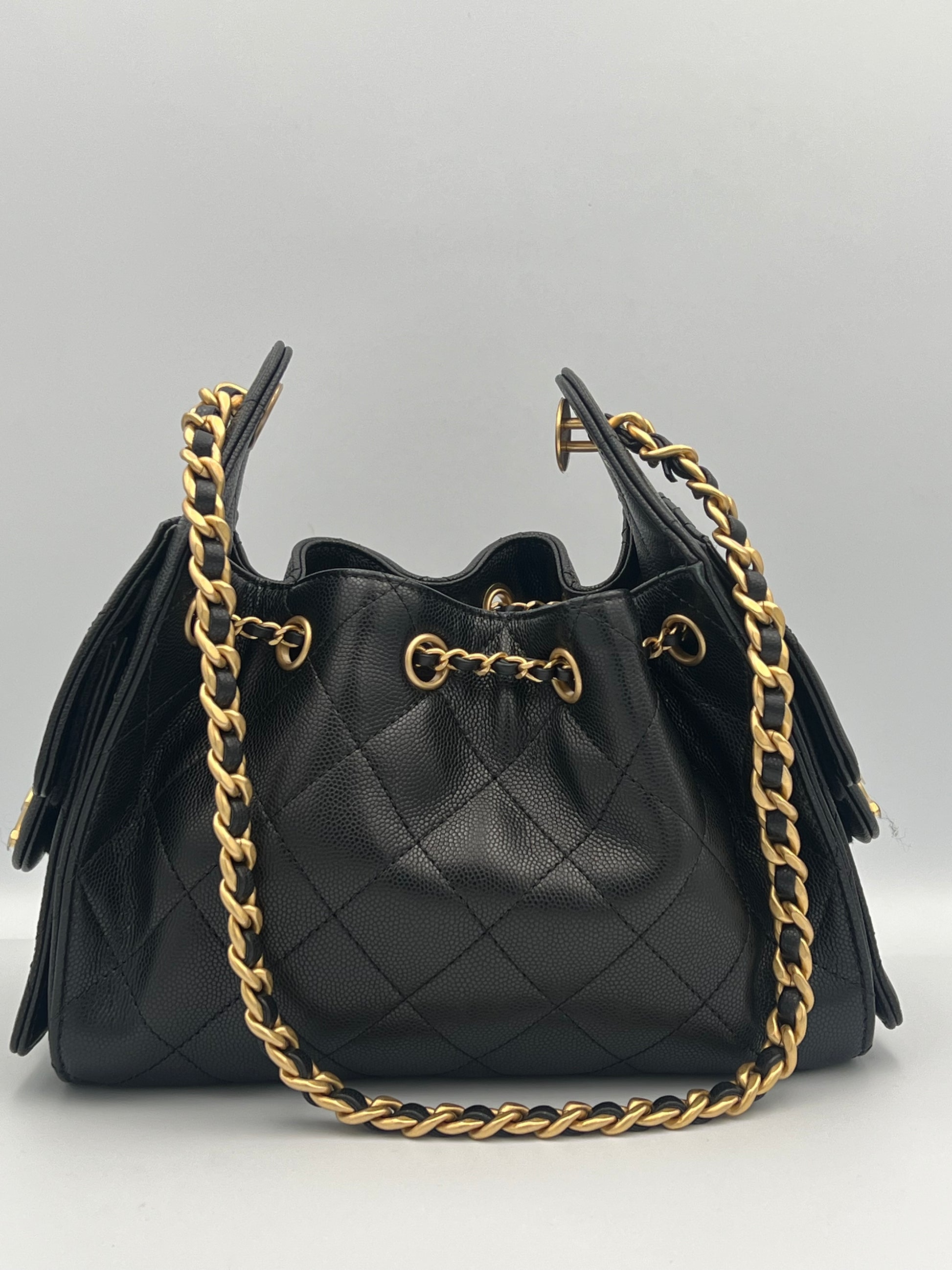 Elaborada en cuero de becerro graneado, combinada con herrajes en metal dorado. Presenta una estructura suave tipo hobo, con el icónico acolchado en rombos, cierre de cordón con logo CC y correa de cuero entrelazado con cadena, ofreciendo un interior forrado en tela con bolsillos funcionales para un uso práctico y elegante.