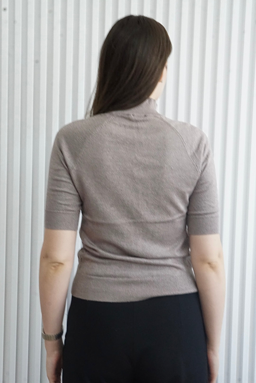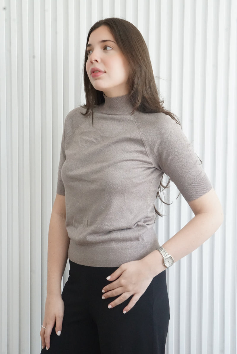 Este top estilo suéter cuenta con cuello de tortuga y mangas cortas. Cuenta con detalles de brillitos.