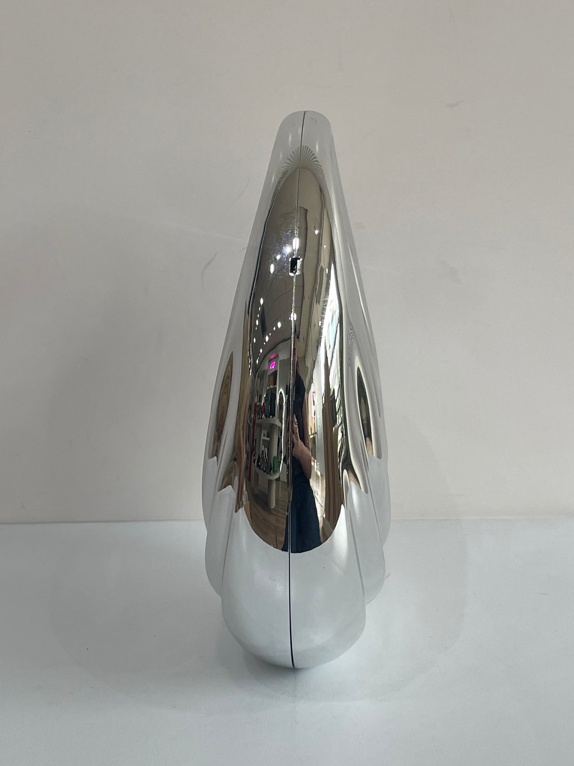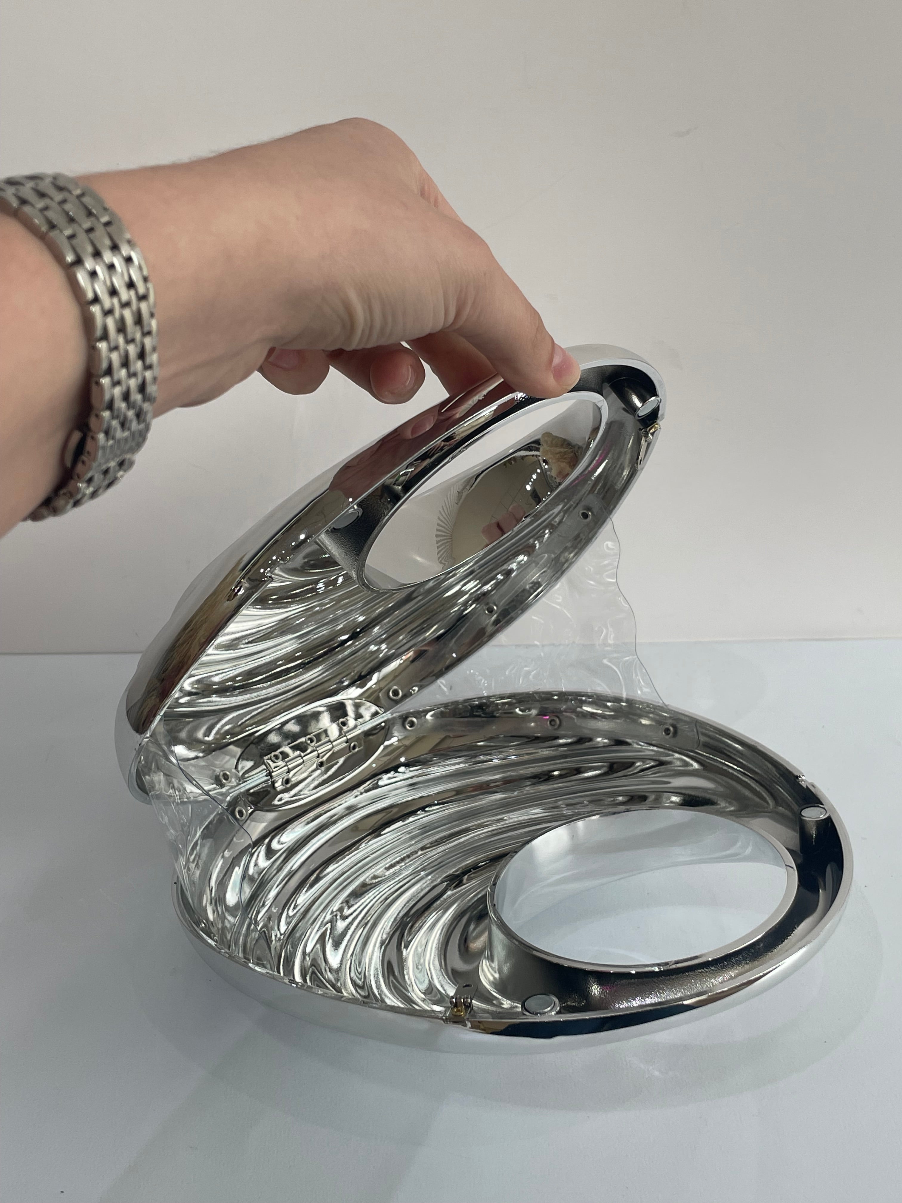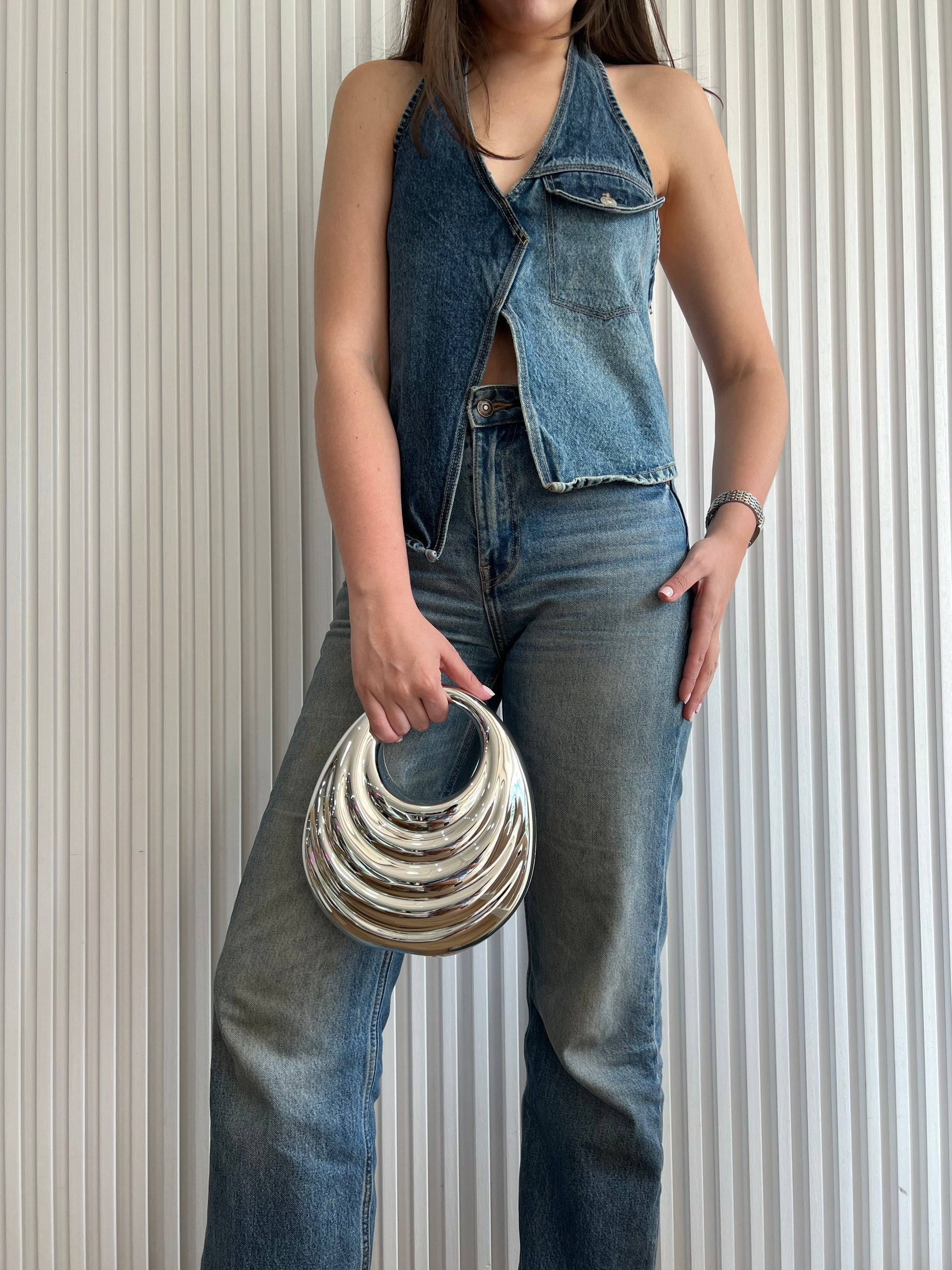 Bolso rígido de acrílico con forma de concha, con líneas curvas que reproducen la silueta del caparazón. Presenta cierre superior tipo clip y acabado brillante