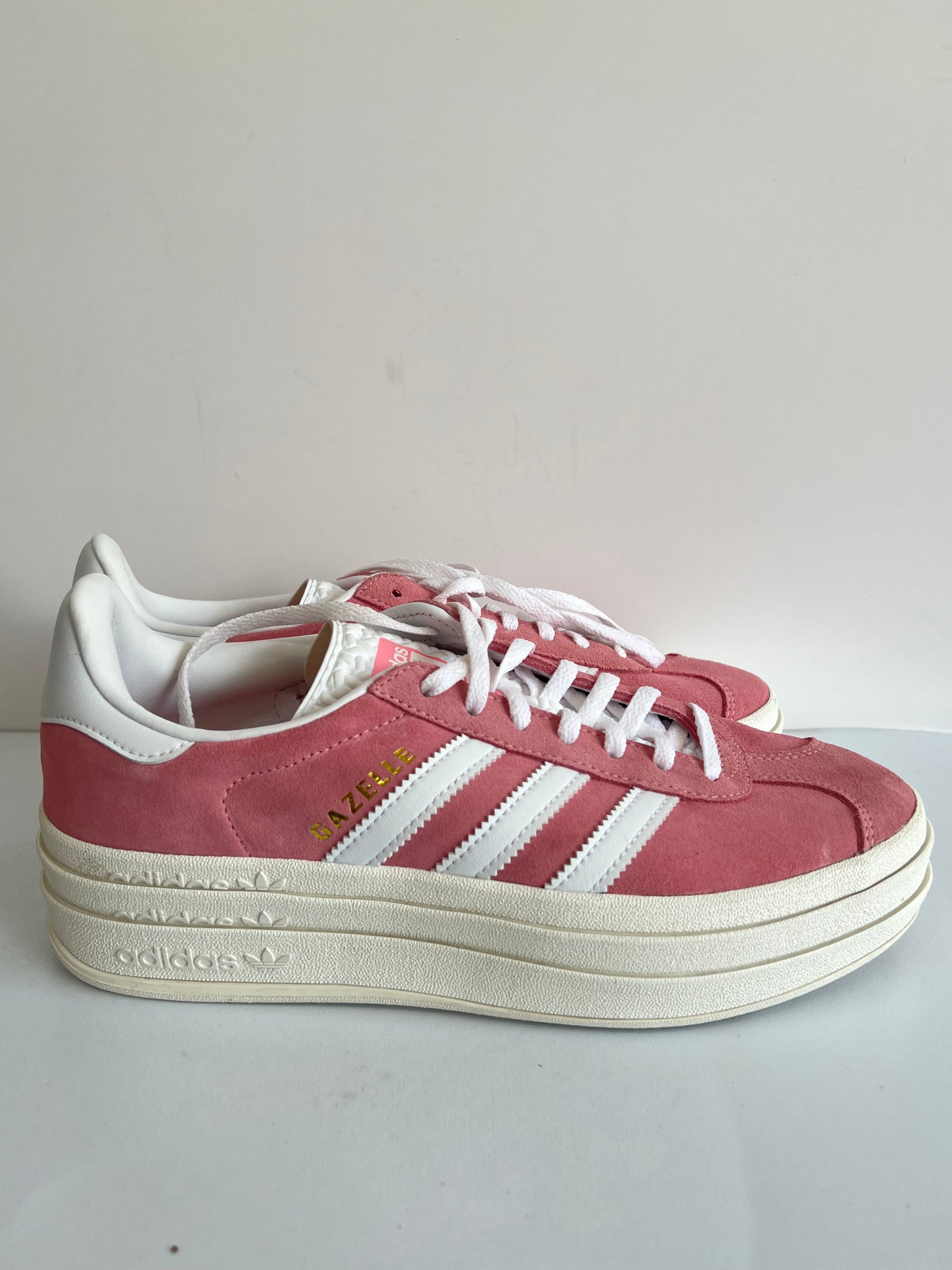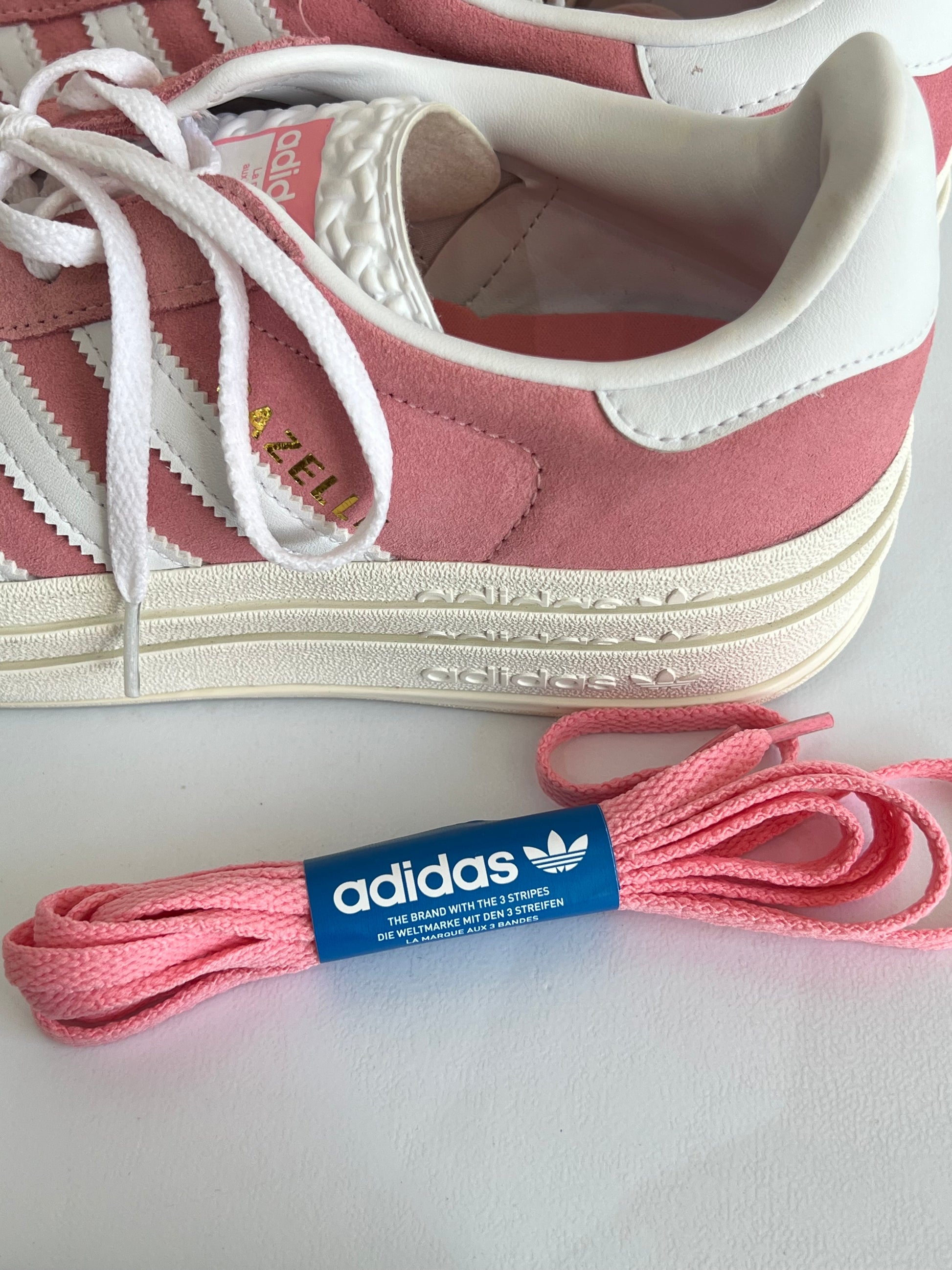 Adidas Gazelle en ante rosa empolvado con las tres franjas y talonera en blanco, detalle de logo dorado en el lateral y suela de goma clásica. Incluye cordones rosados.