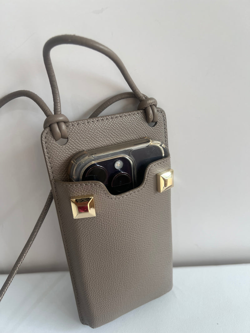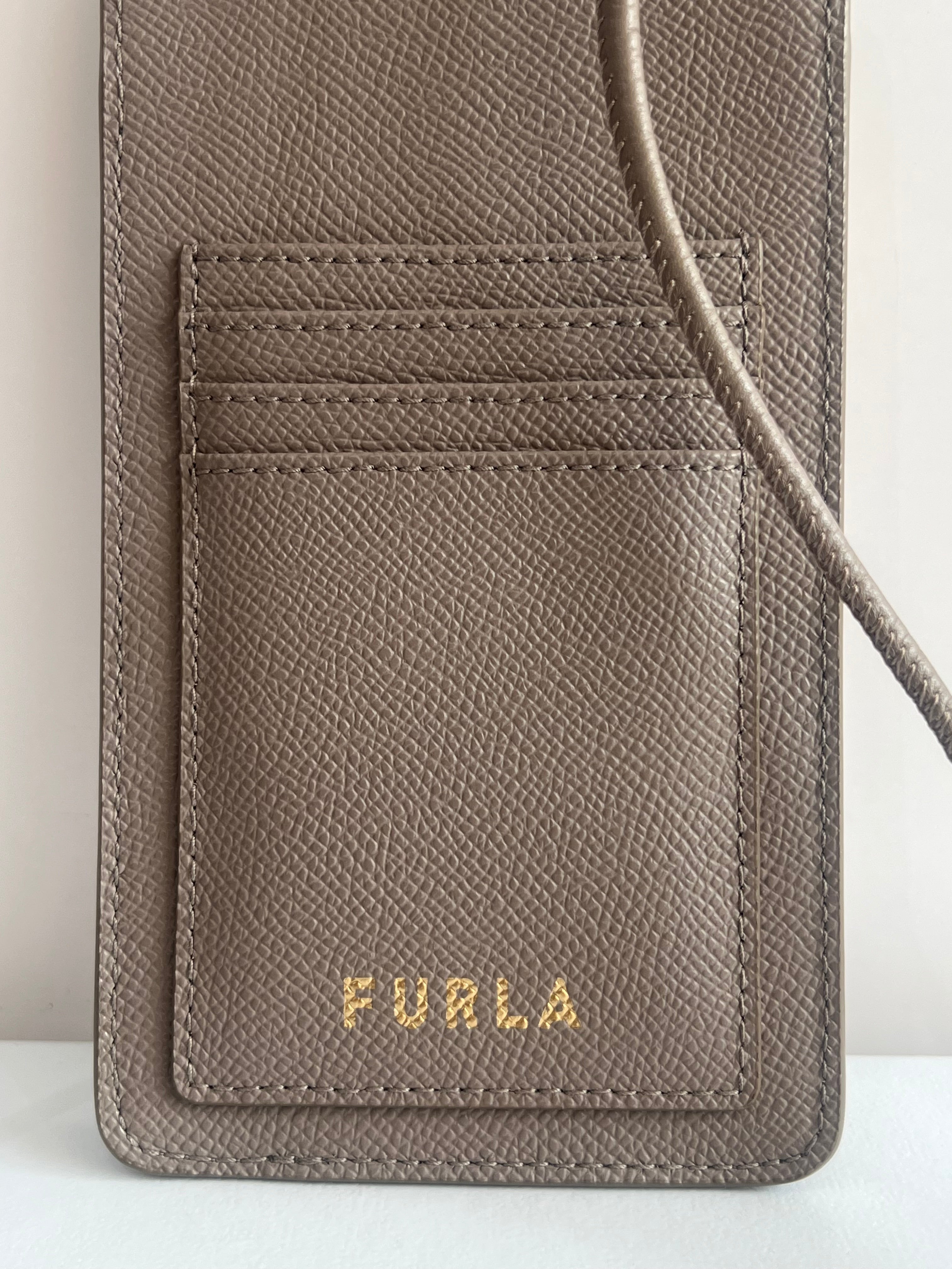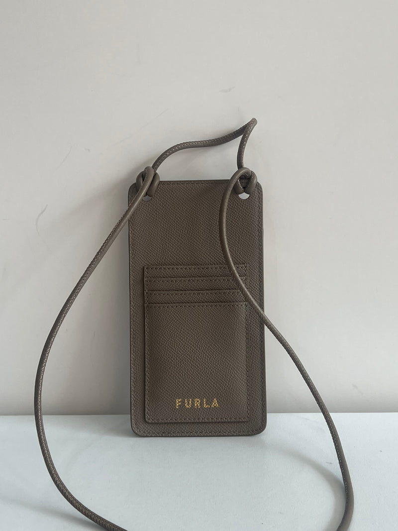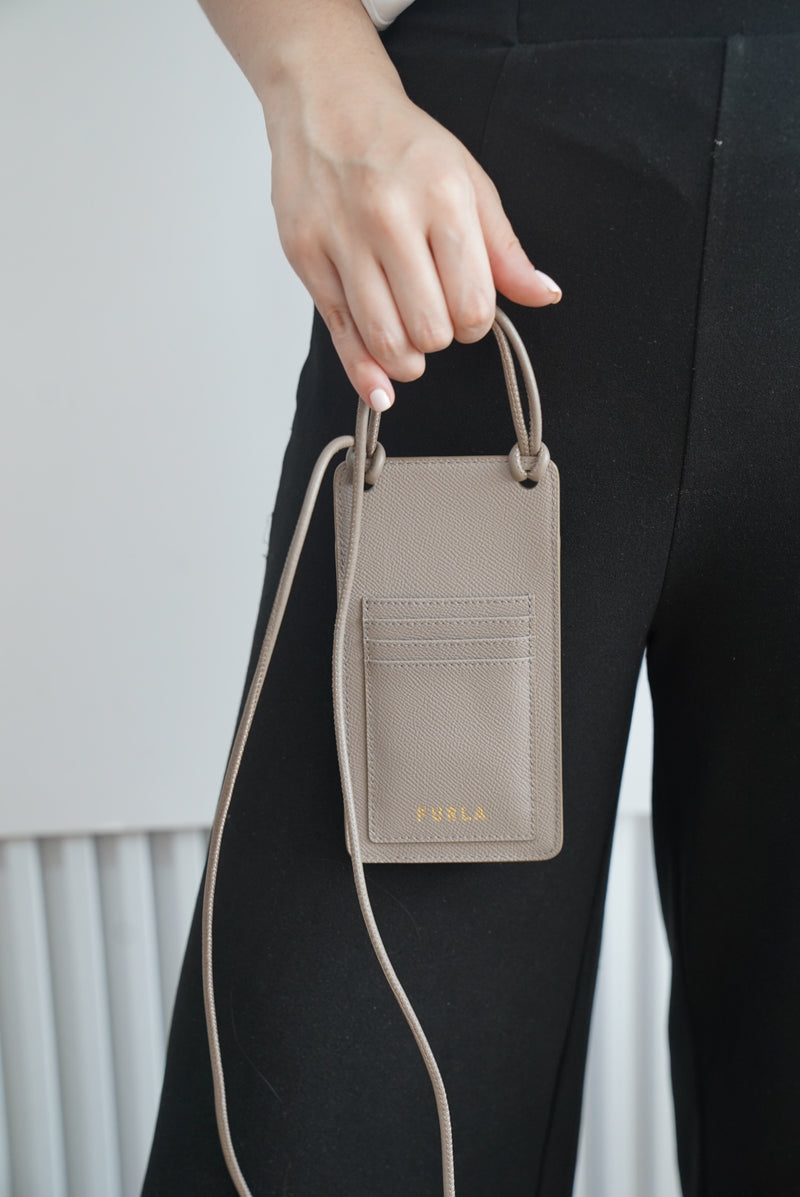 Diseño en piel con acabado liso, formato vertical tipo minibolso, con logo de Furla y correa larga ajustable para llevar cruzado o al hombro. Compartimentos para organizador de tarjetas.