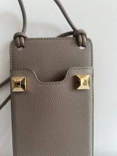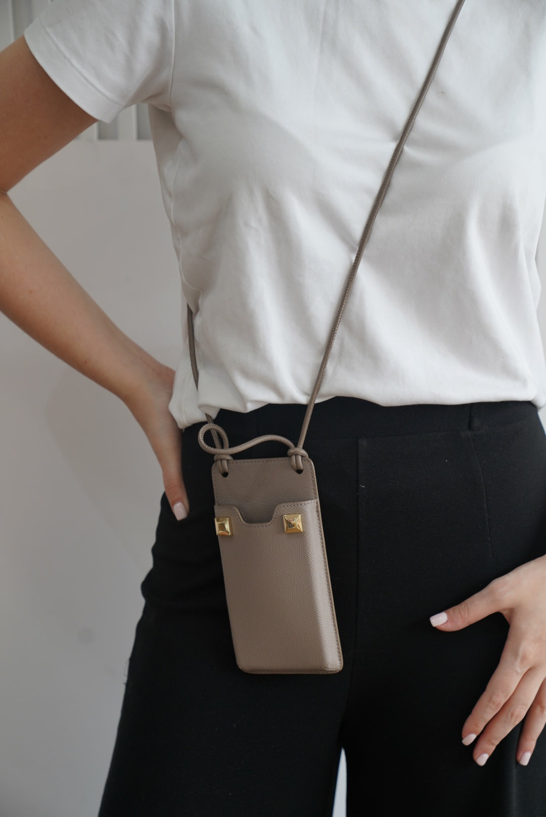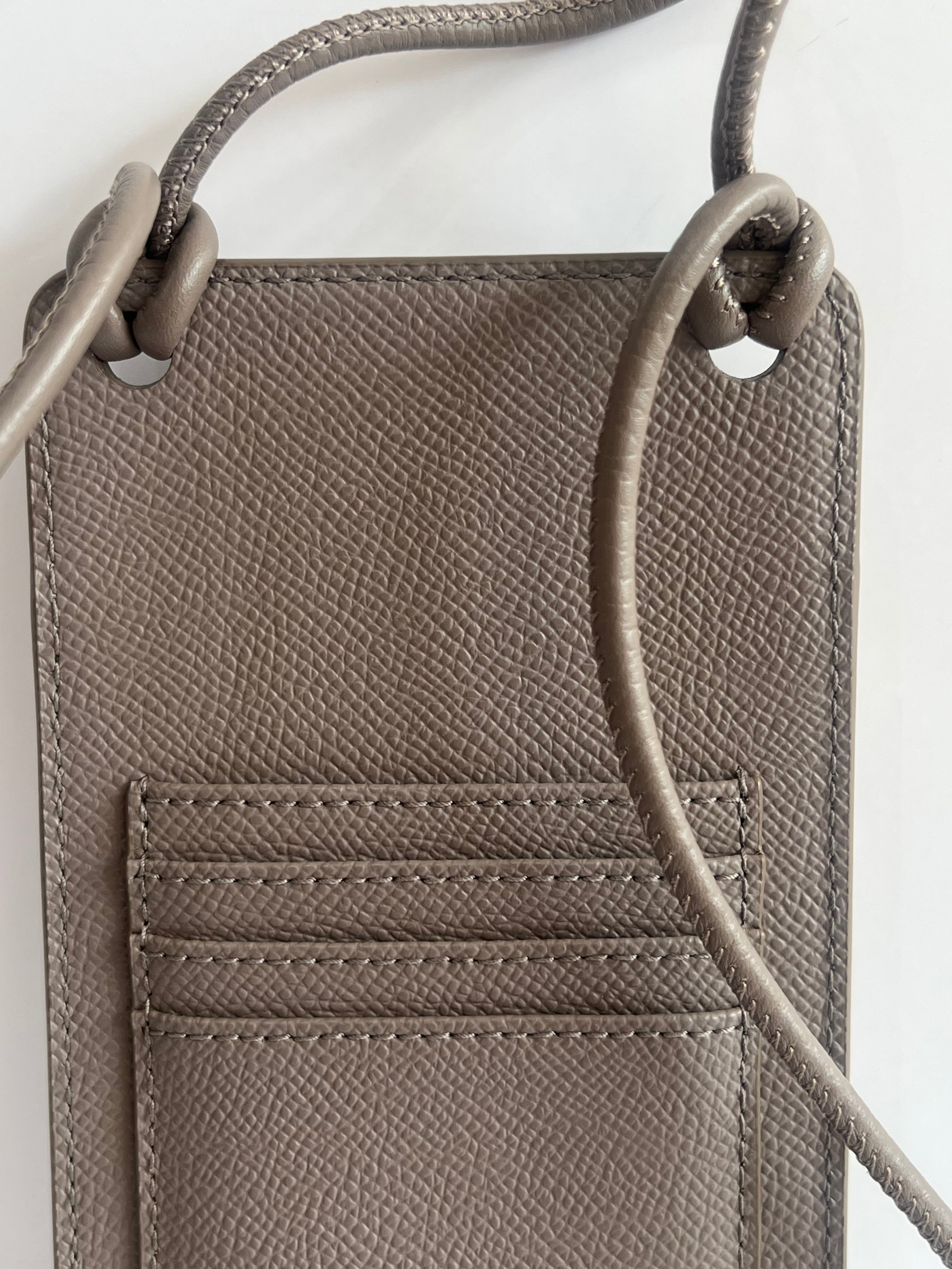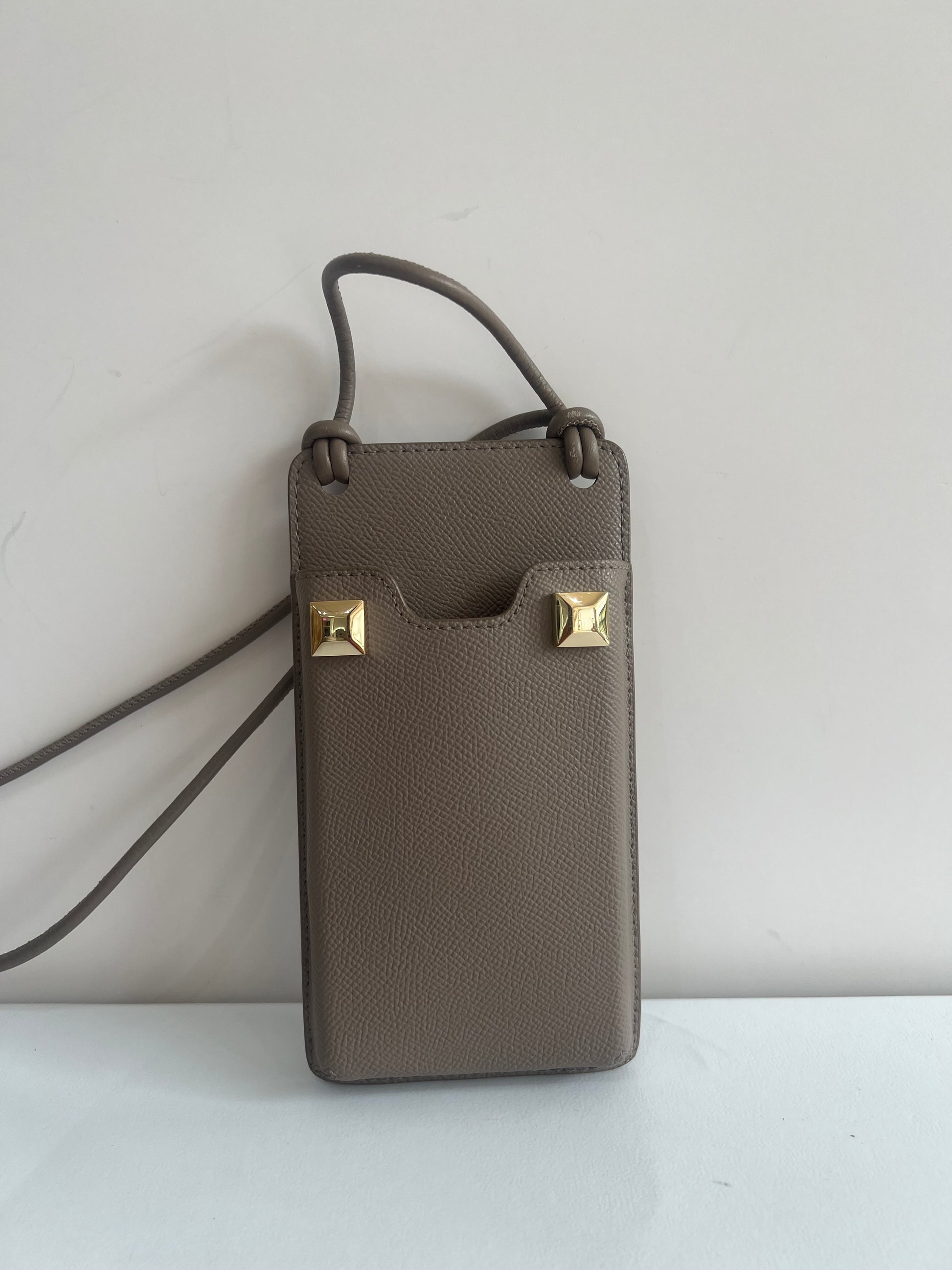 Diseño en piel con acabado liso, formato vertical tipo minibolso, con logo de Furla y correa larga ajustable para llevar cruzado o al hombro. Compartimentos para organizador de tarjetas.