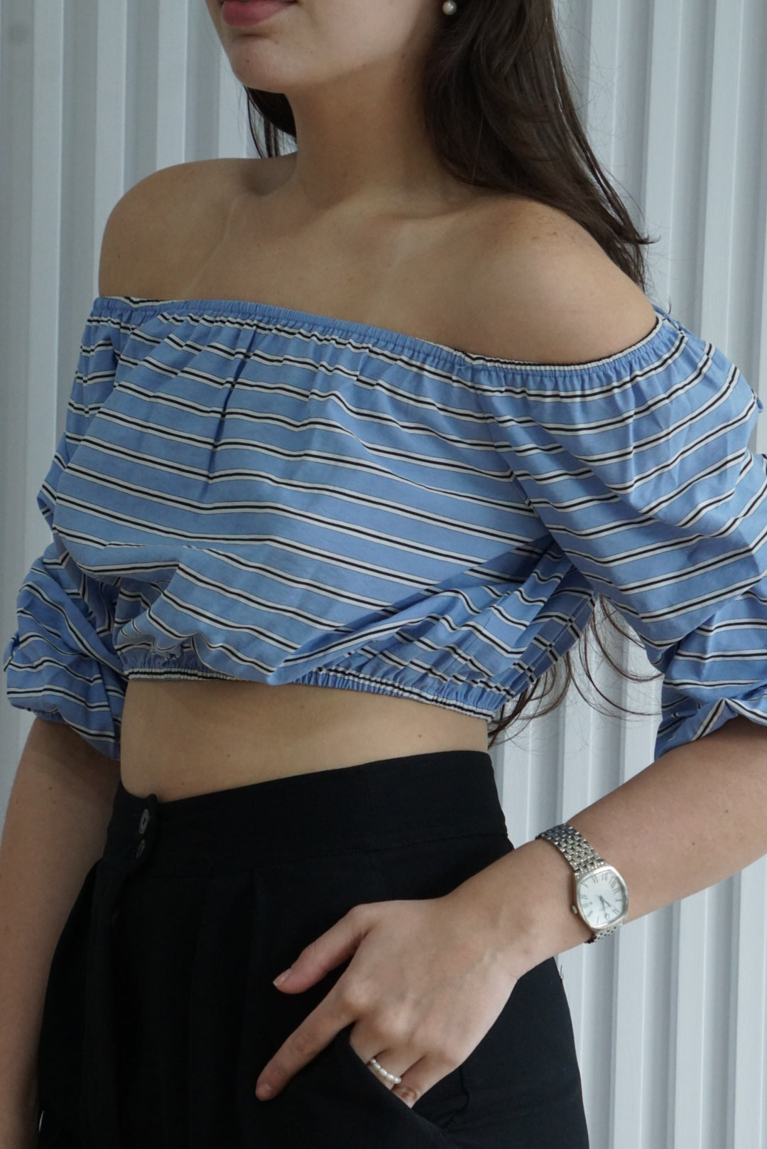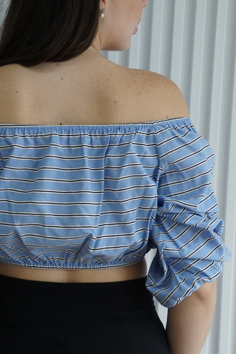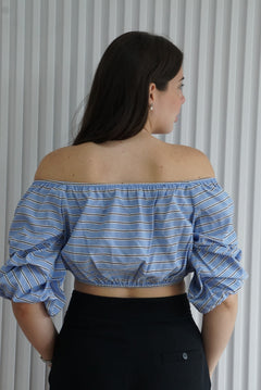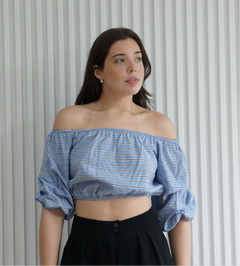 Croptop de tela rayada, elaborada con media mangas. Esta blusa trae elastico en los hombros y en la cintura.