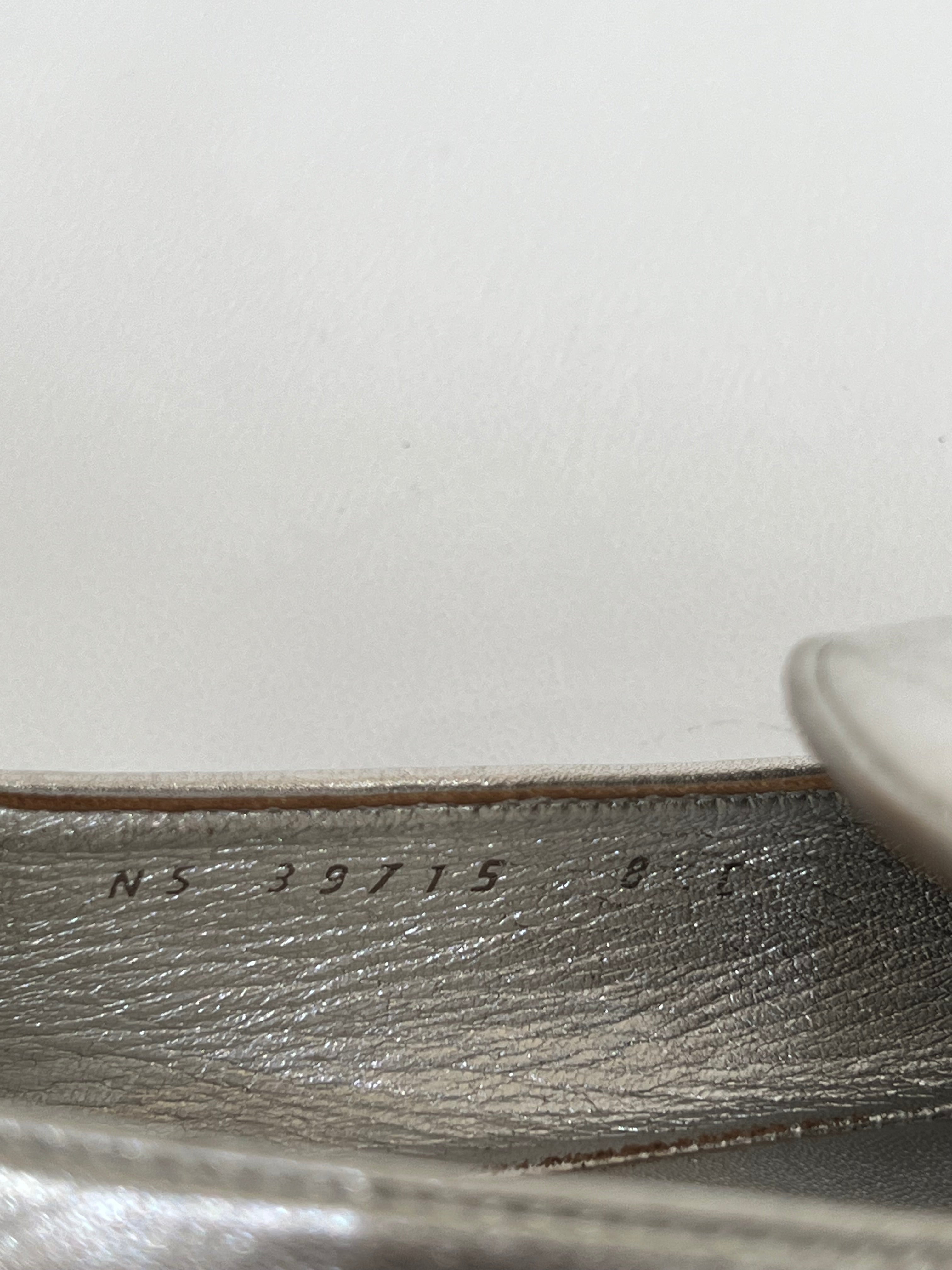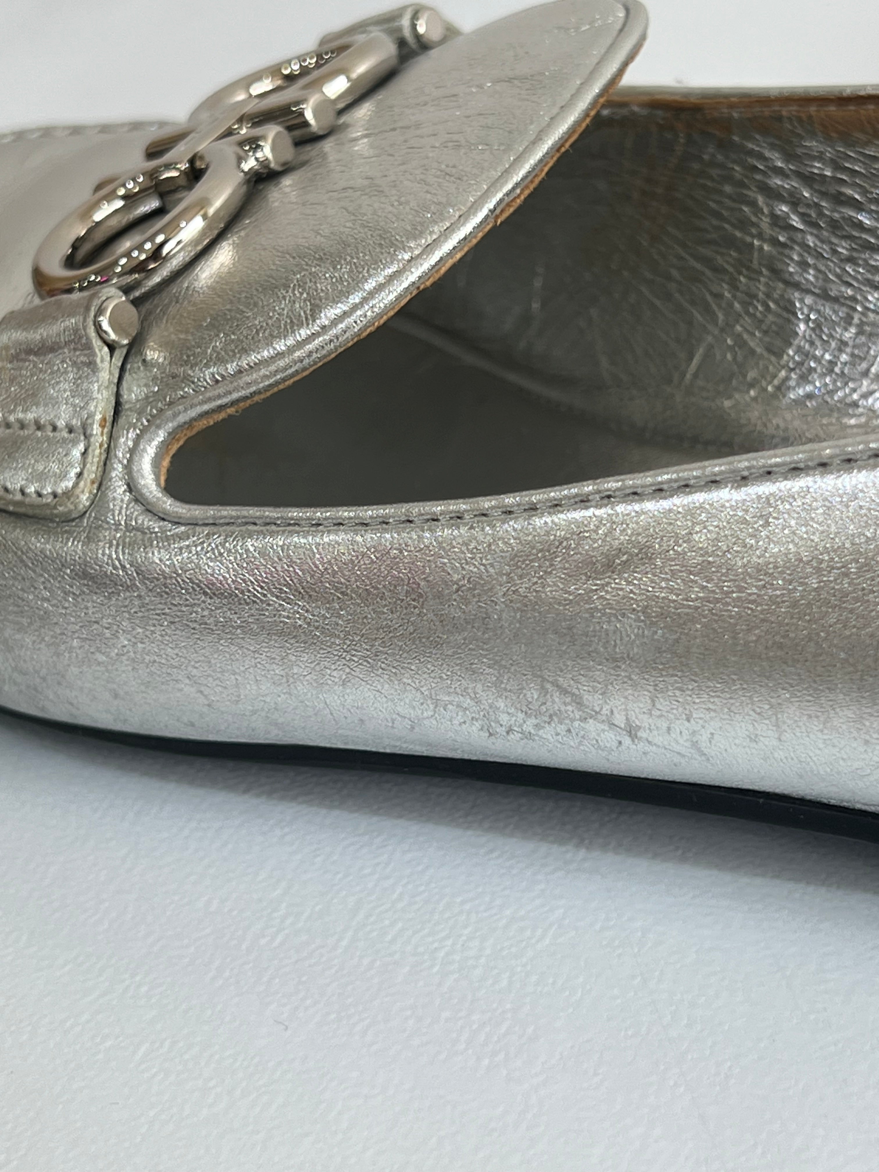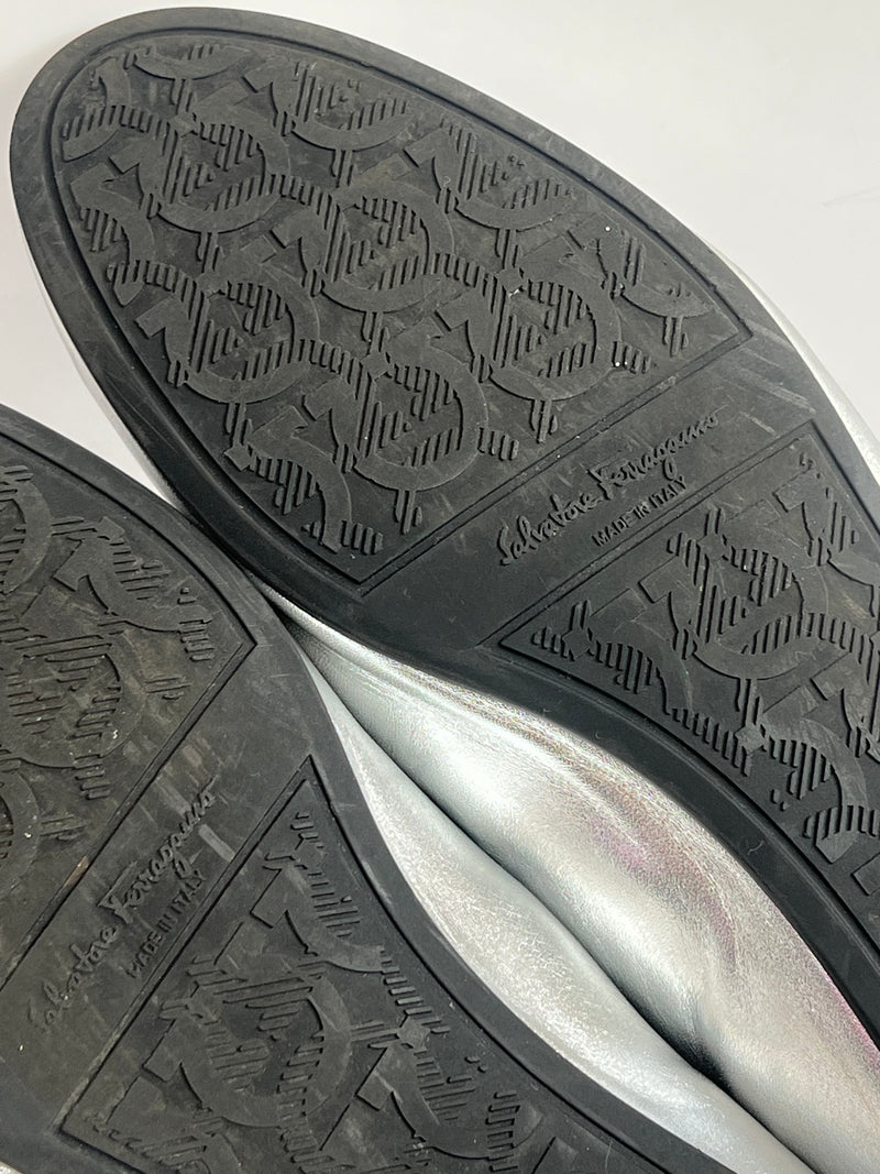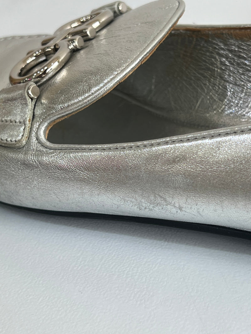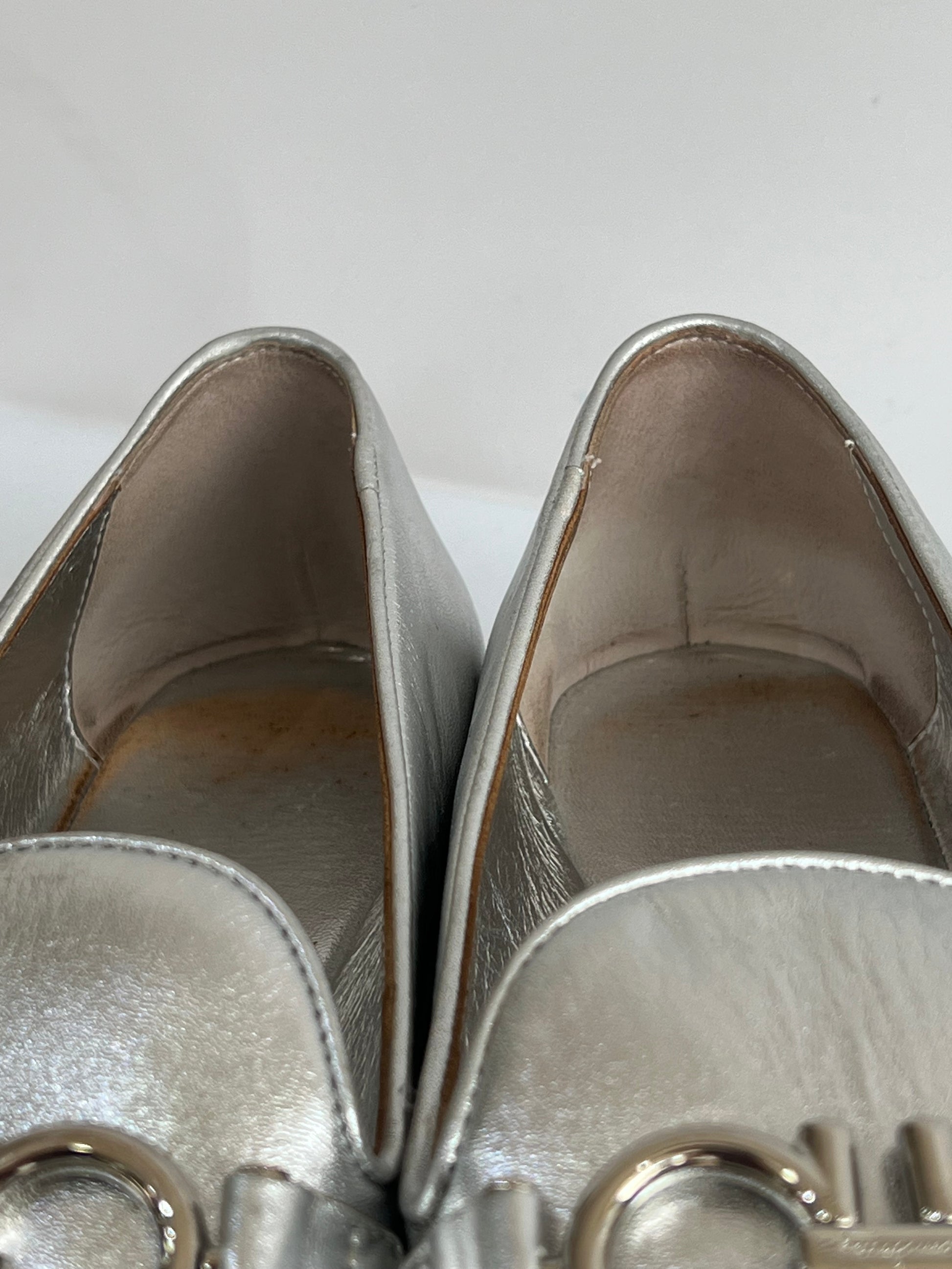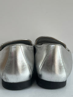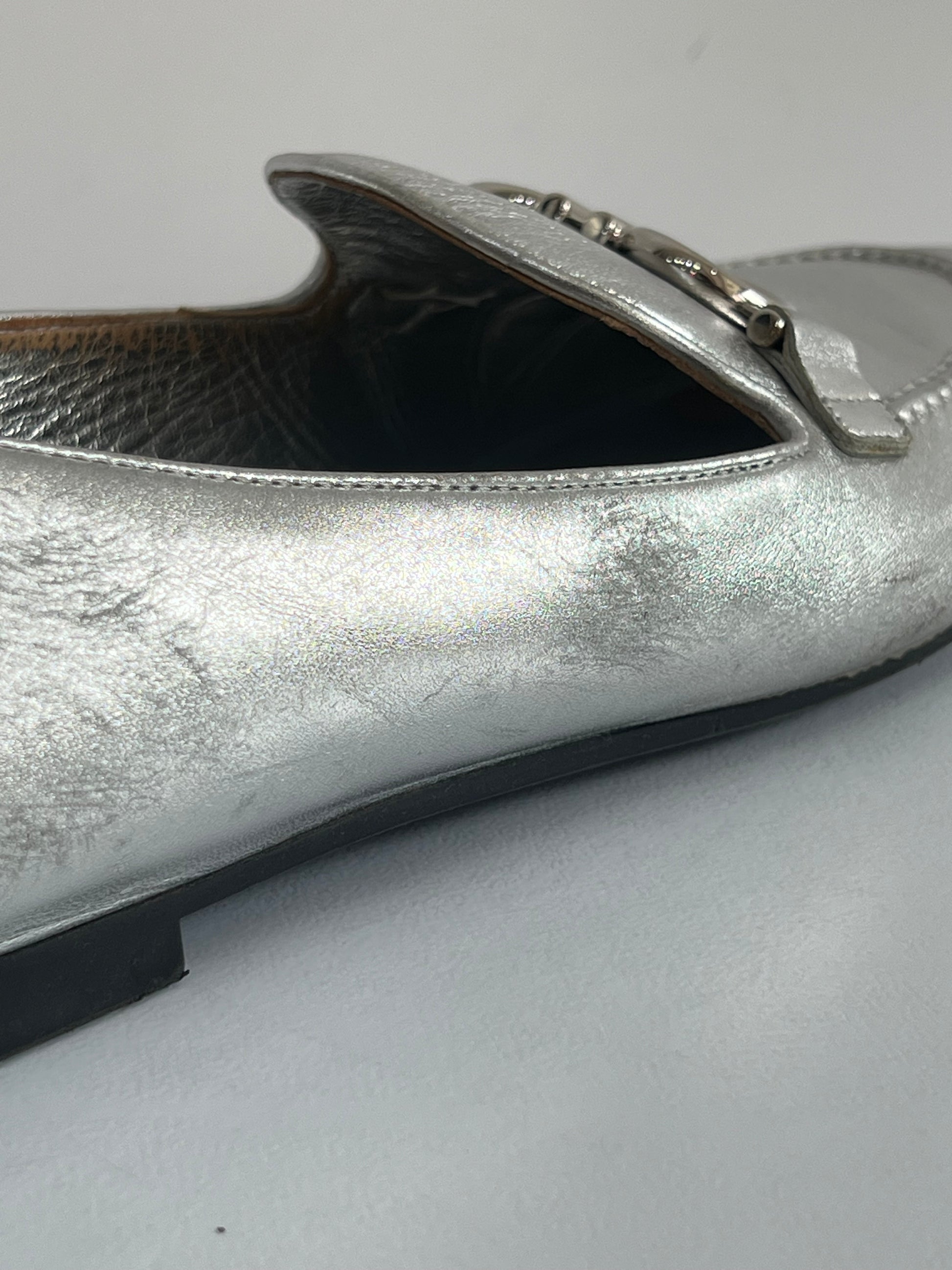 Están confeccionados en cuero liso con acabado metálico. Presentan diseño tipo mocasín con punta redondeada, detallado con el logo en el empeine. El interior es de cuero con plantilla acolchada.