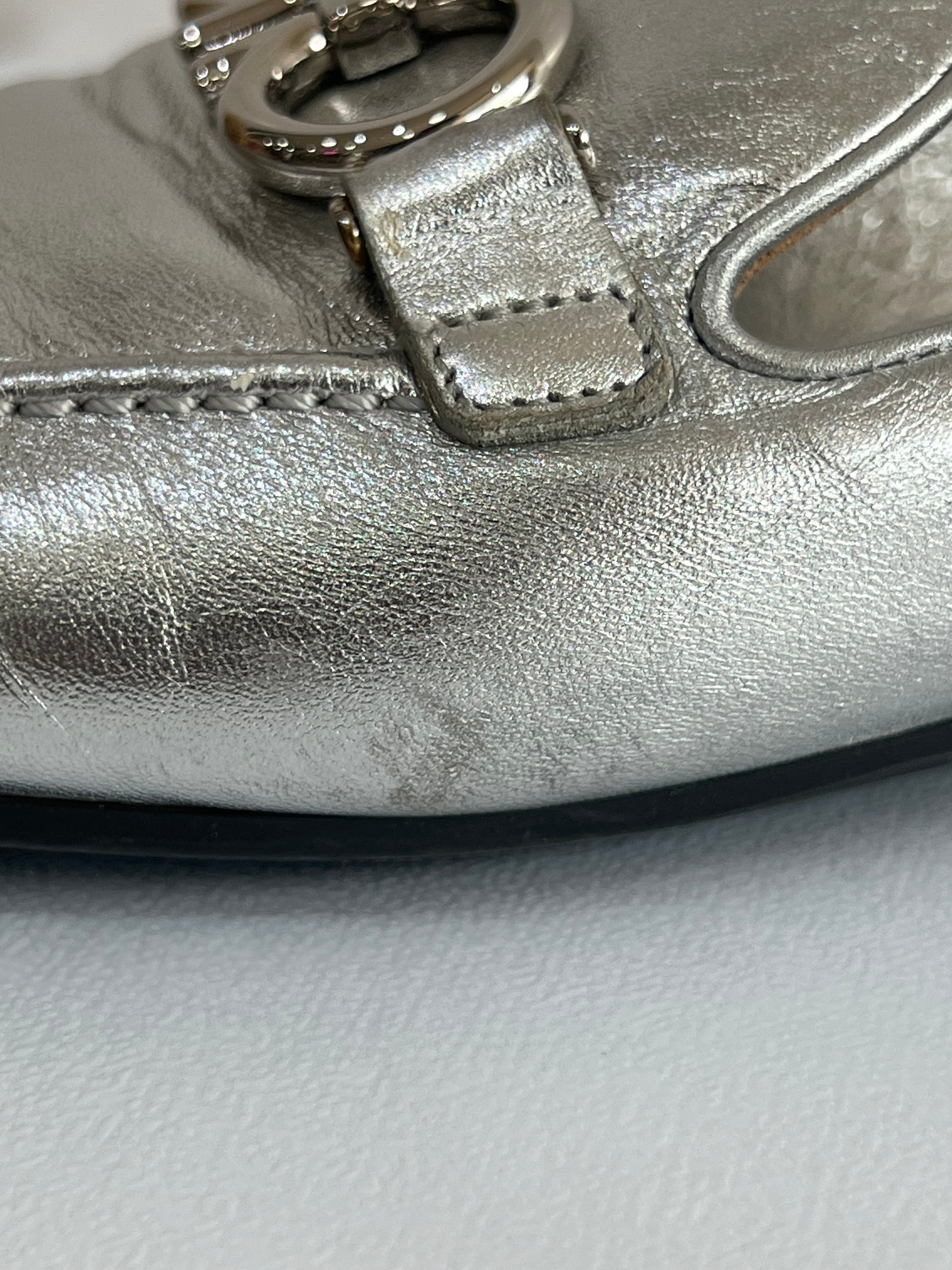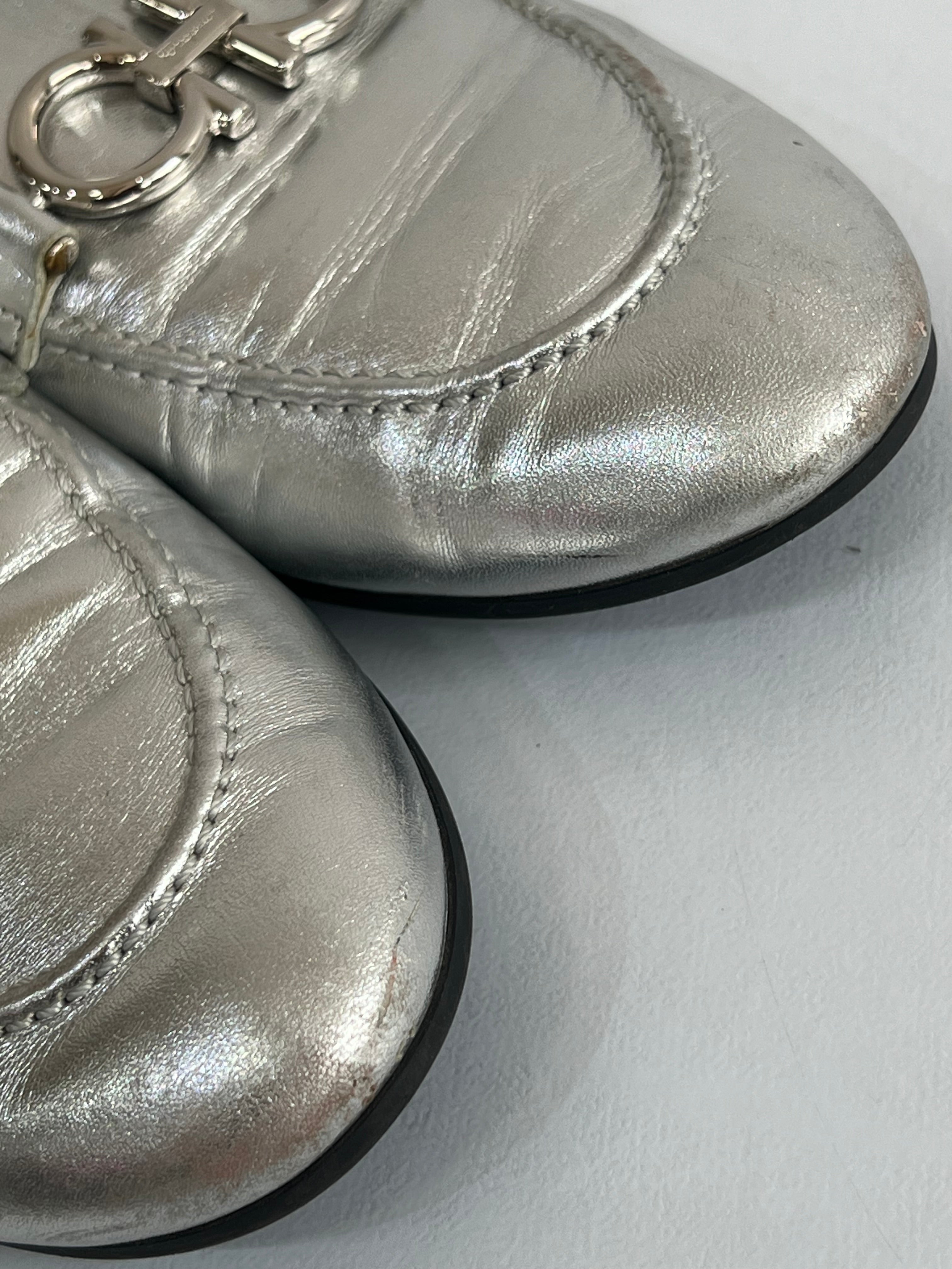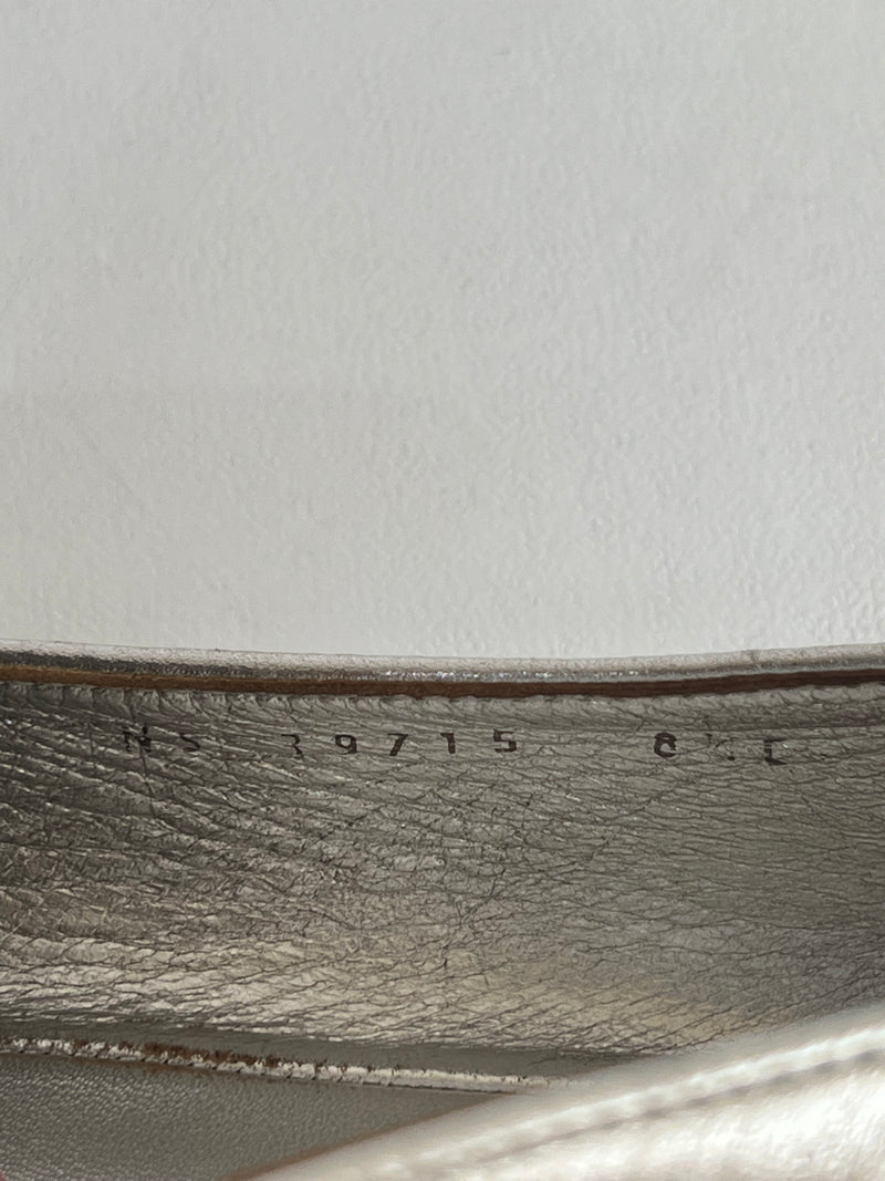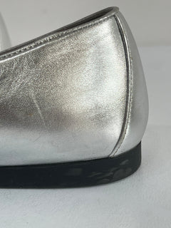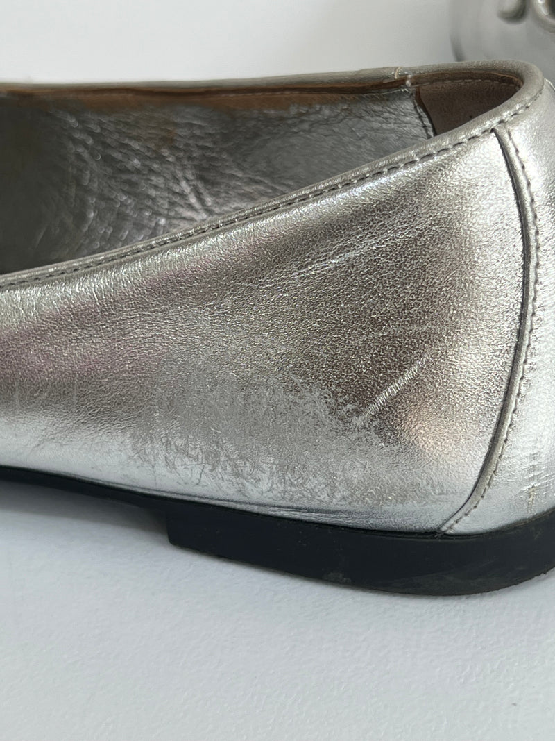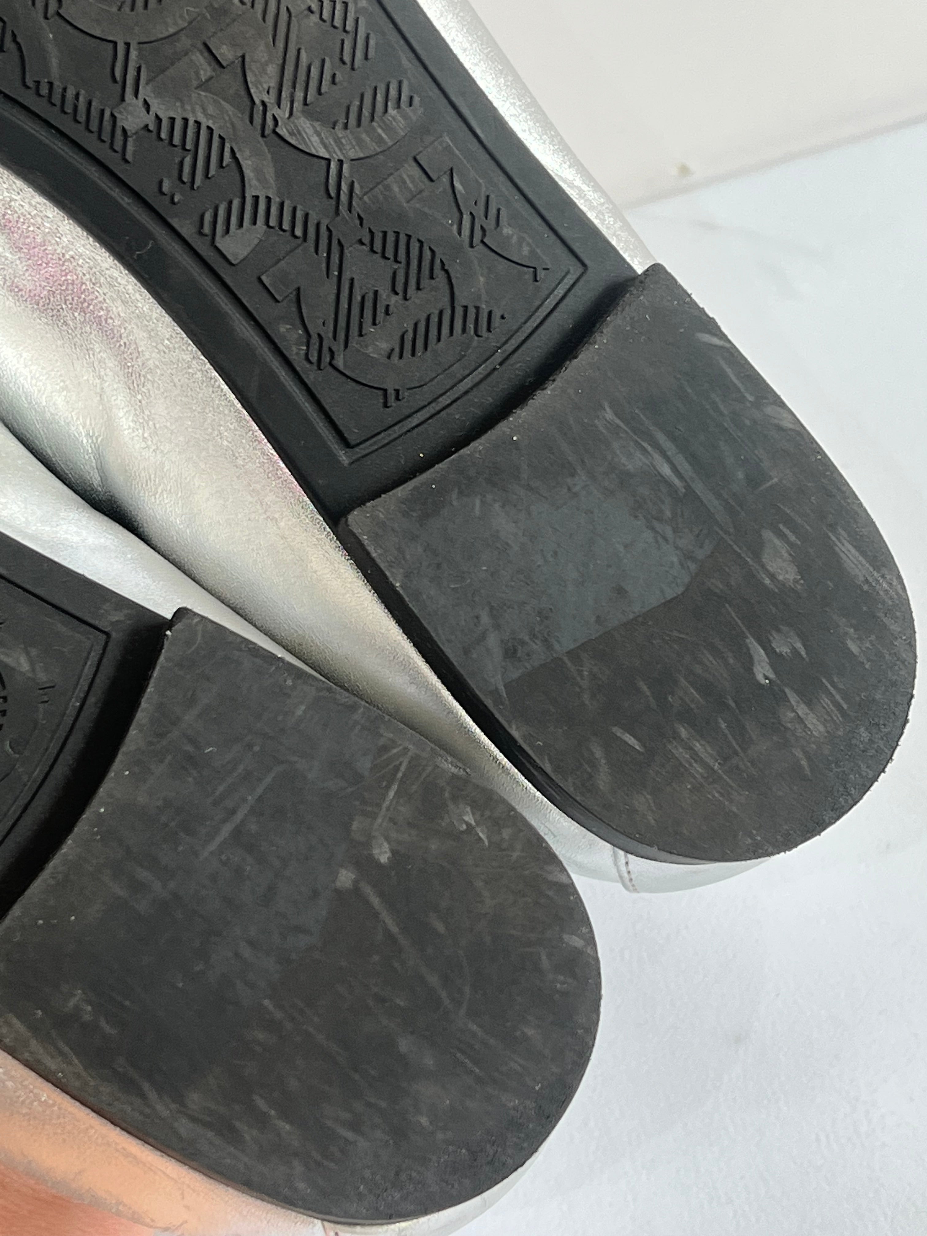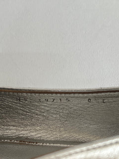 Están confeccionados en cuero liso con acabado metálico. Presentan diseño tipo mocasín con punta redondeada, detallado con el logo en el empeine. El interior es de cuero con plantilla acolchada.