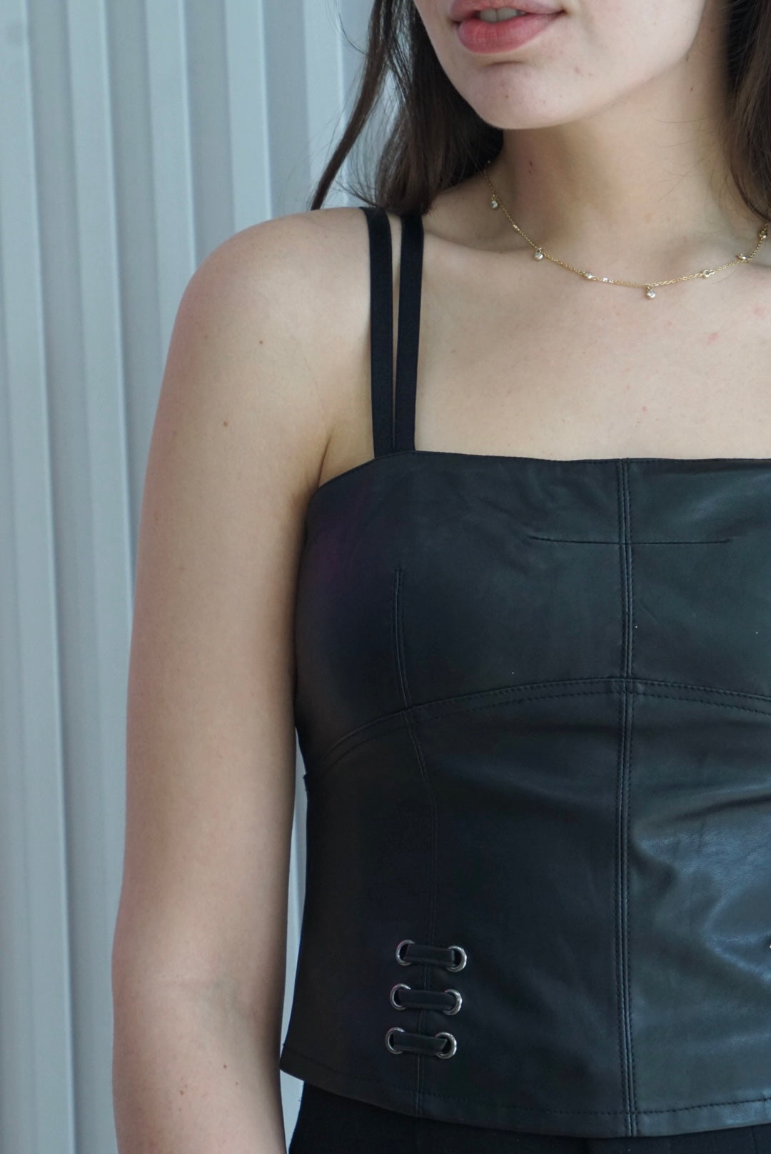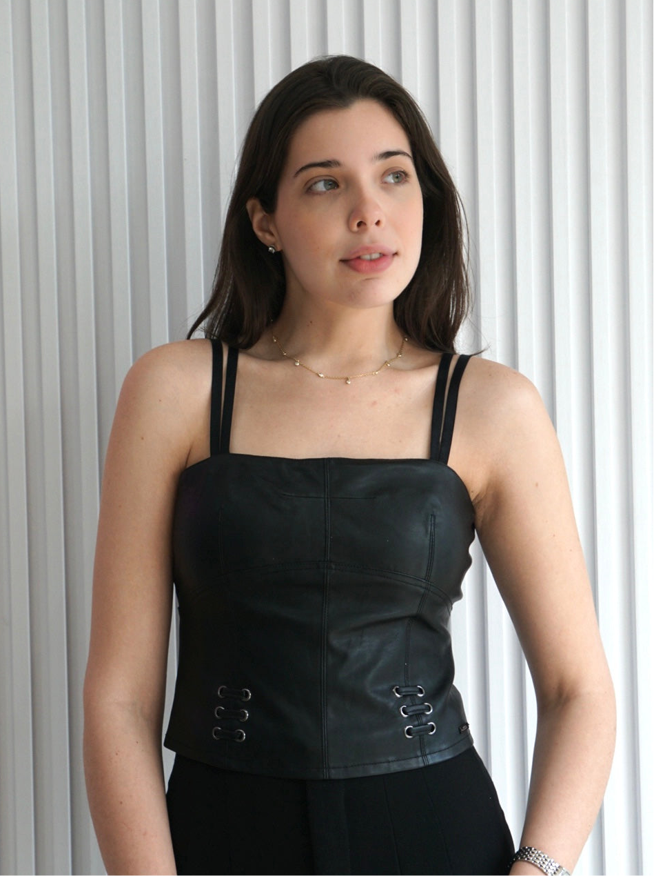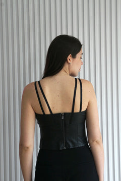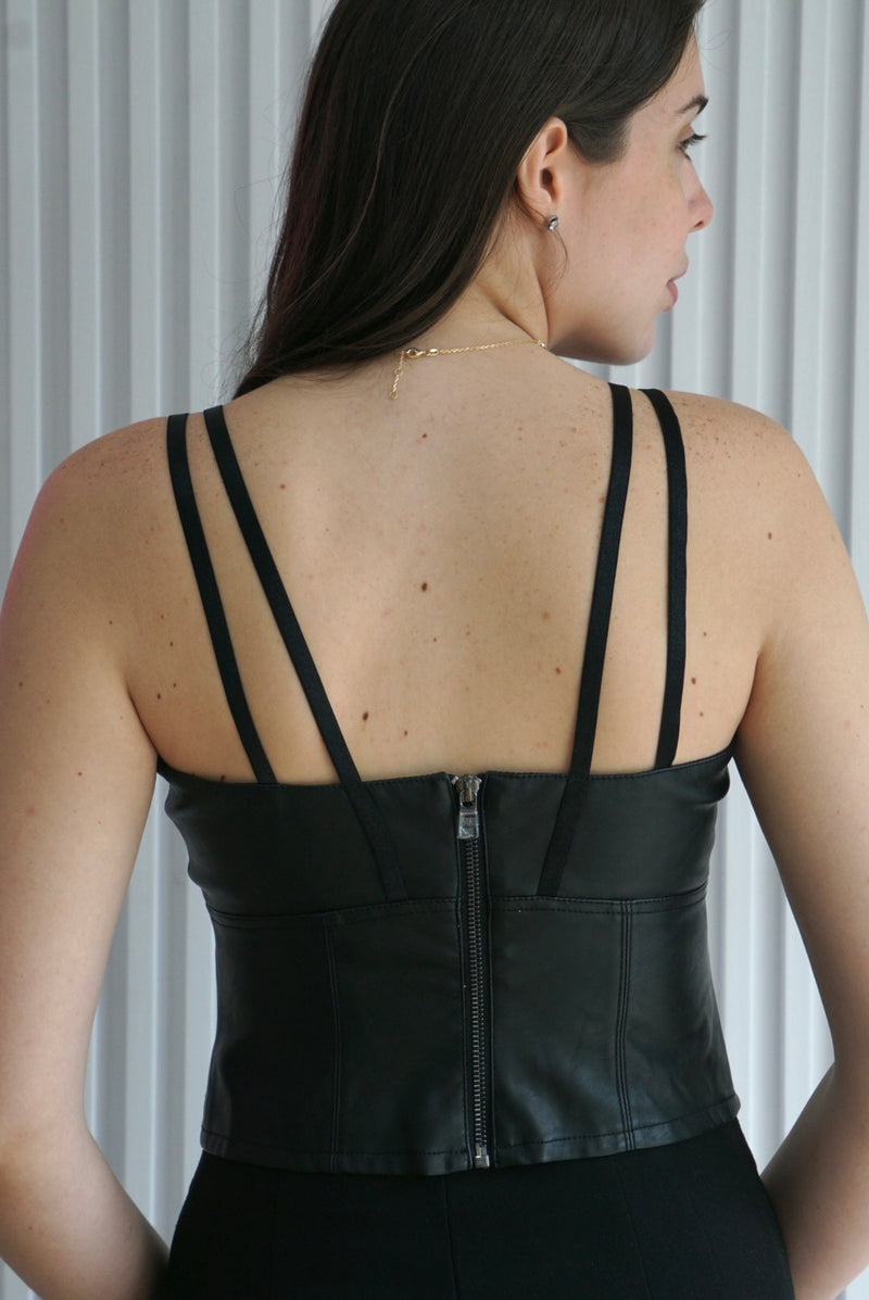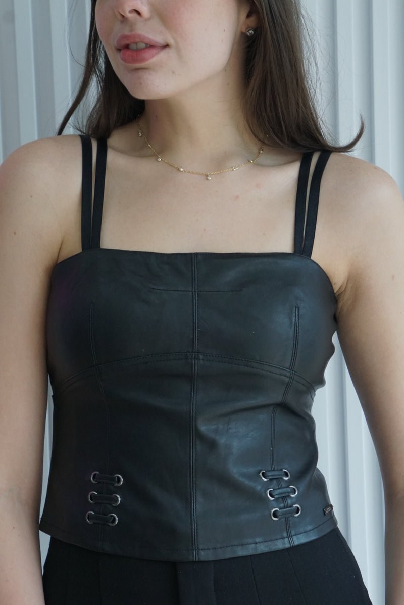 Top elaborado en cuero, con tirantes, marca Armani Exchange. El top viene con soporte en la parte de el busto, no es necesario utilizar brasier. Zipper en la espalda. Ideal para una ocasión de noche.