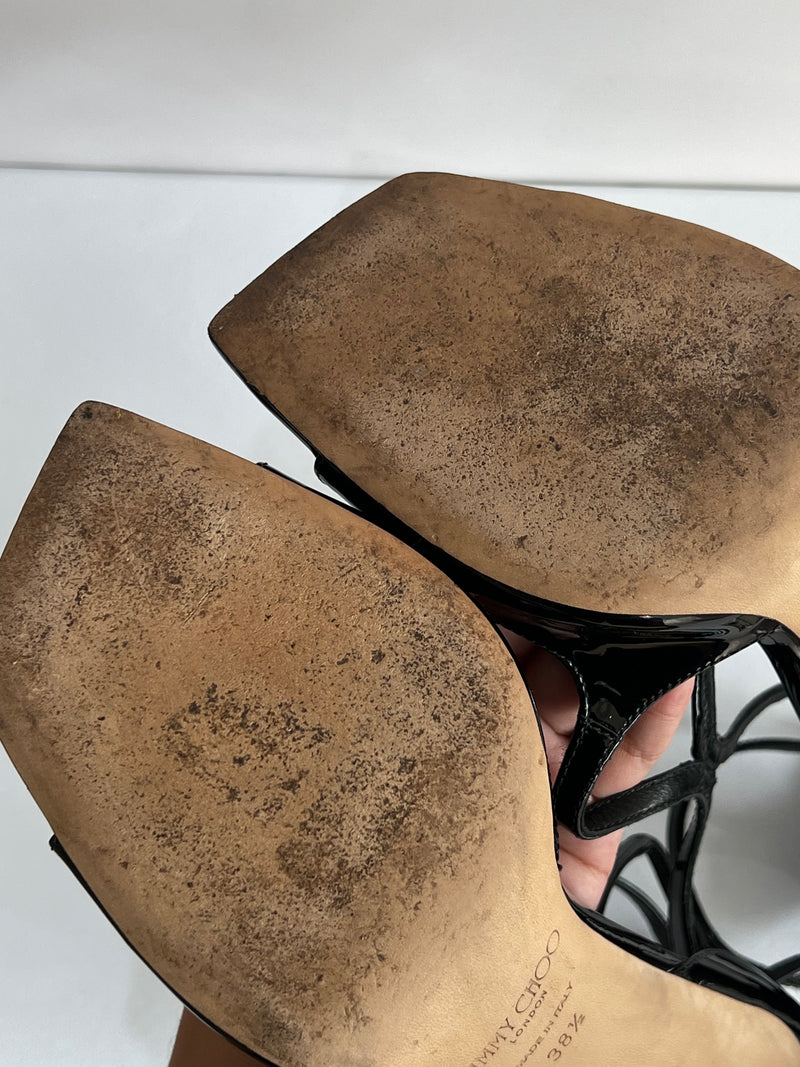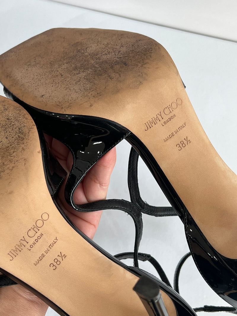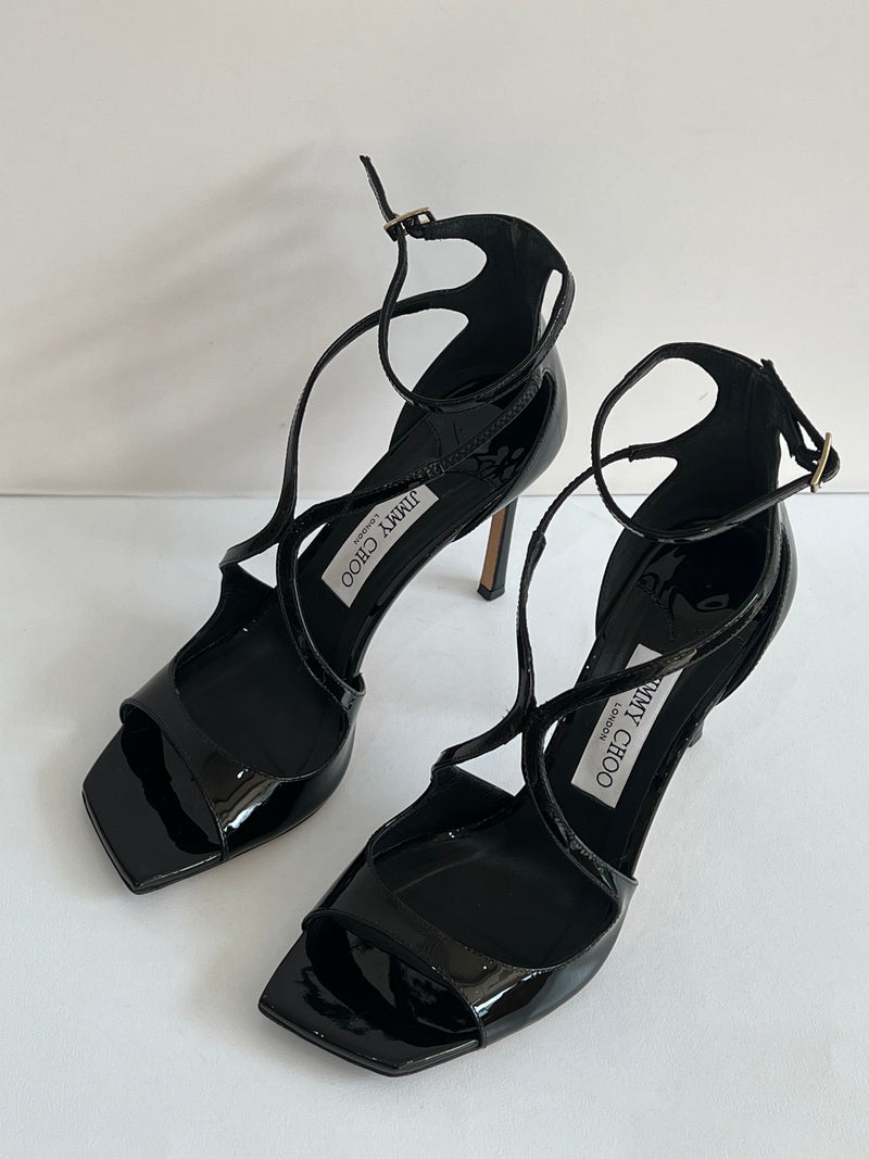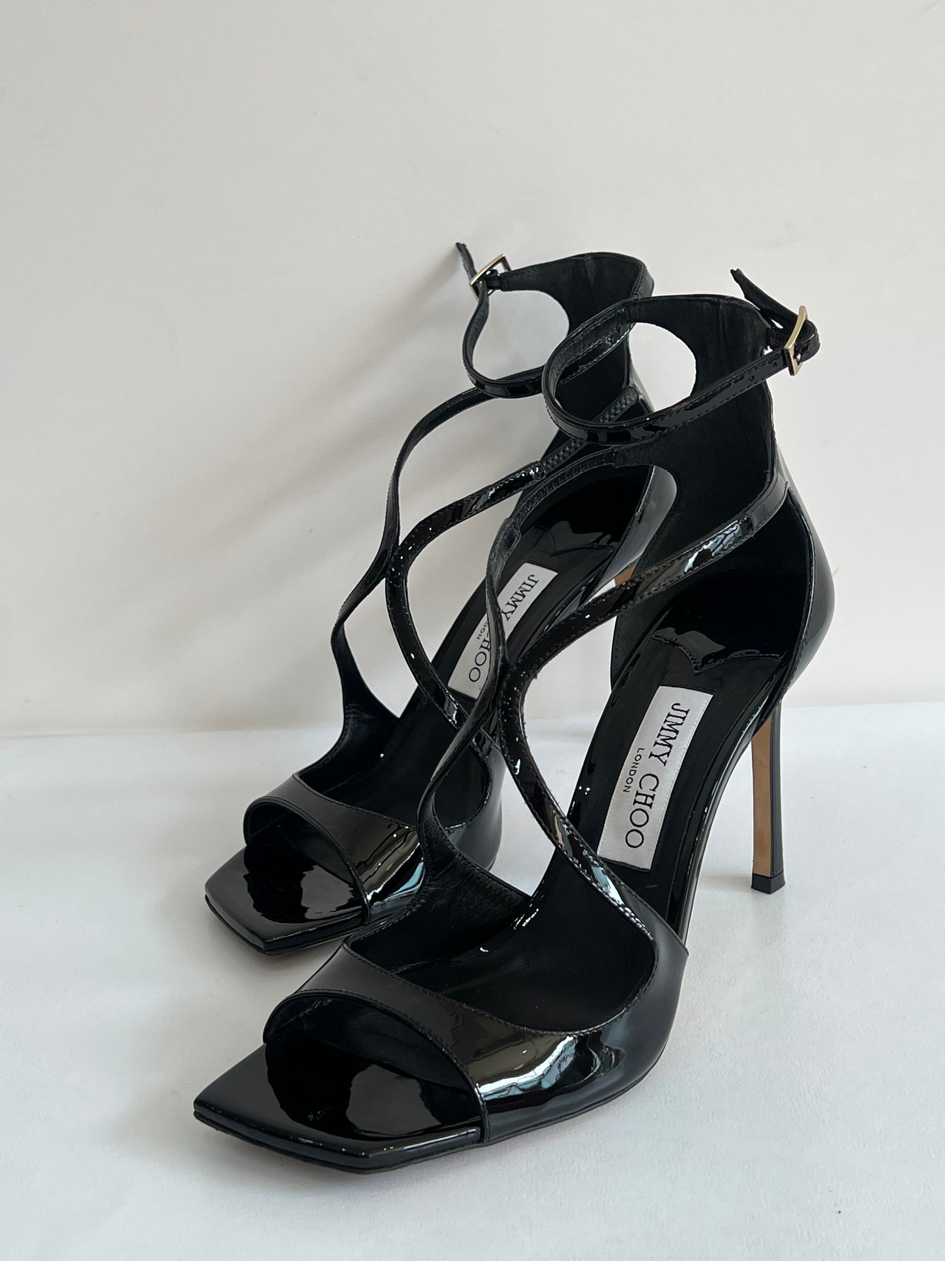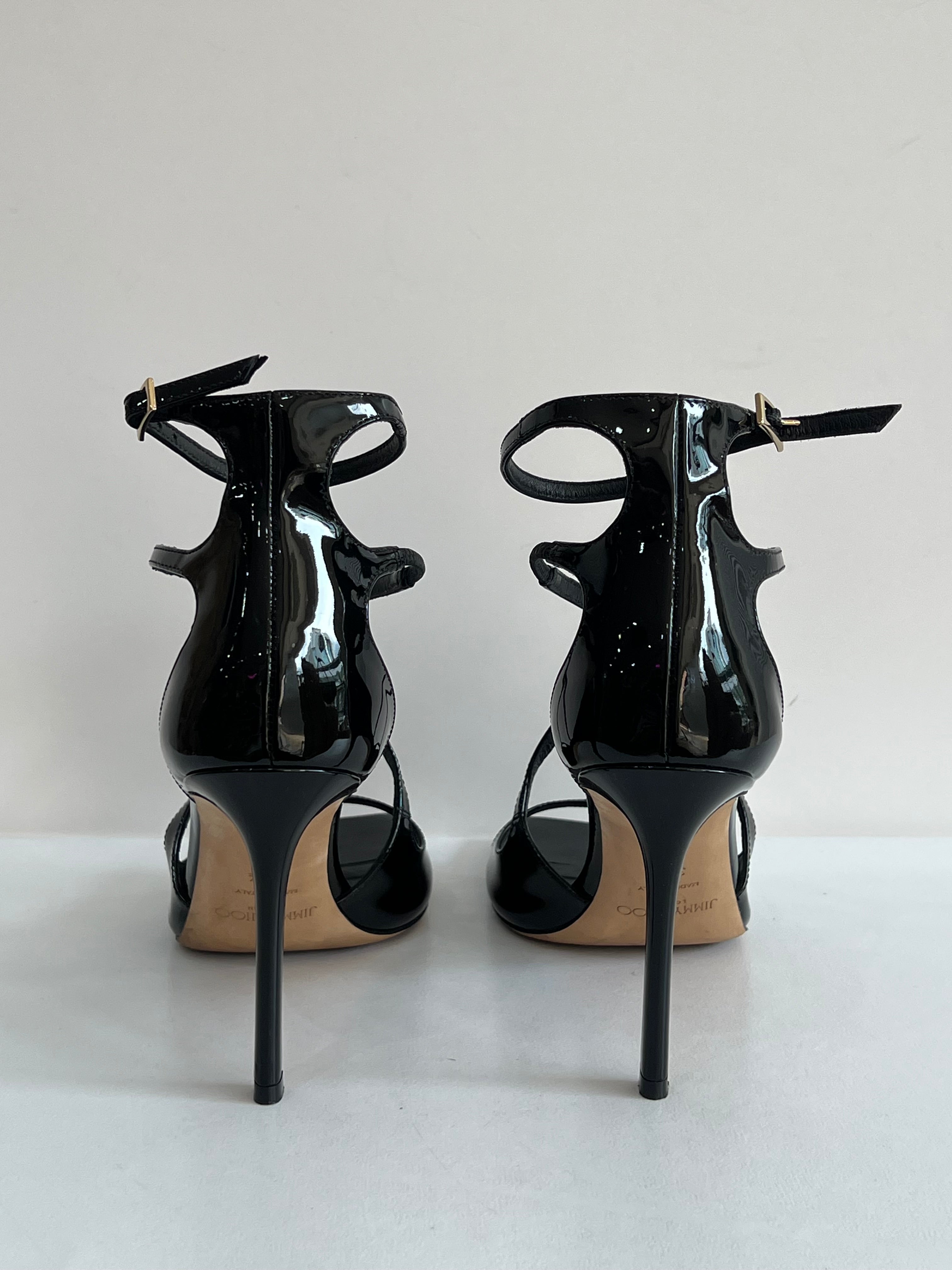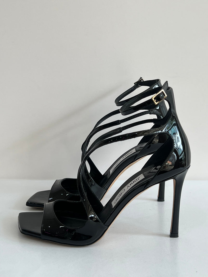 Sandalias de tacón alto confeccionadas en cuero patentado, con diseño de tiras. Portan una altura de 95mm.