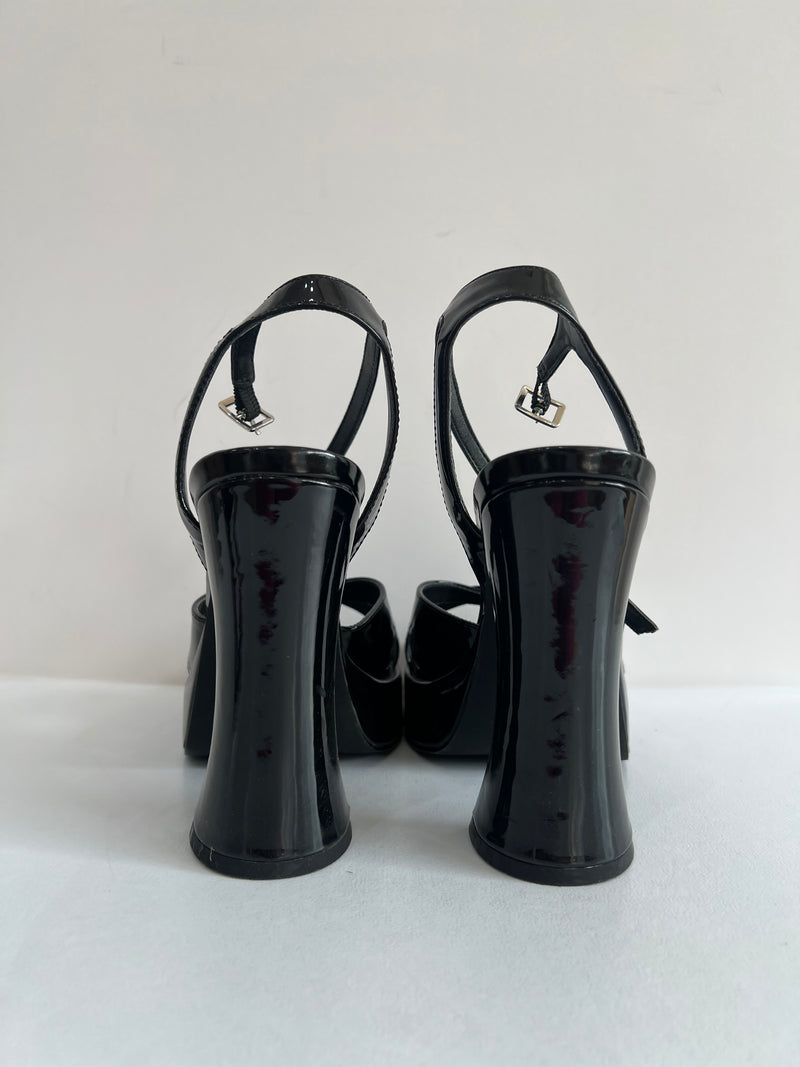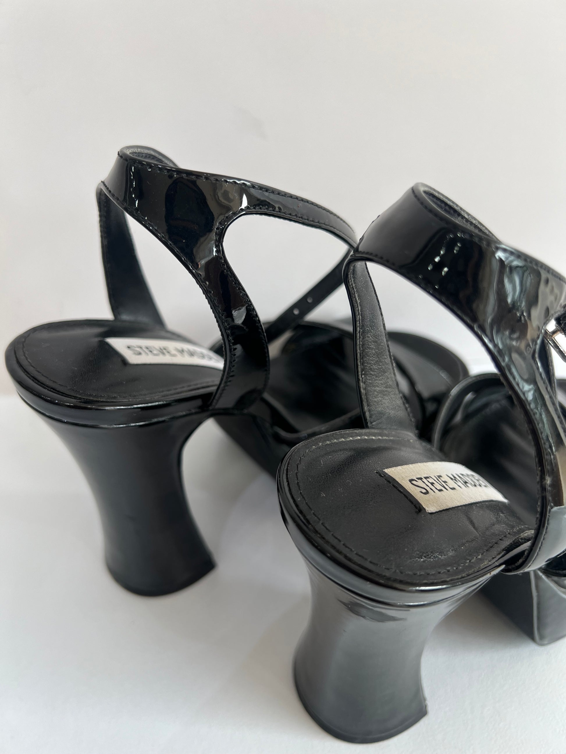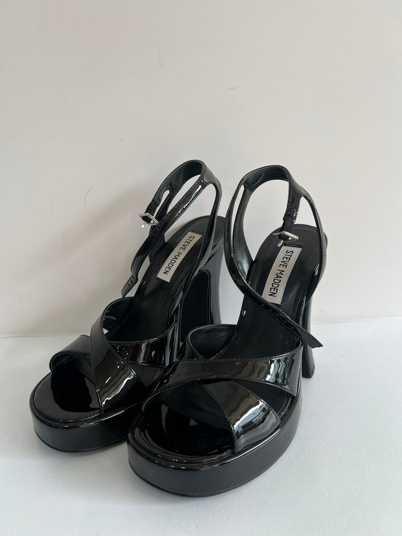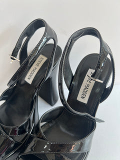Tacones altos Steve Madden en charol negro brillante, con acabado lustroso. Presentan silueta estilizada con punta semi cuadrada y tacón.