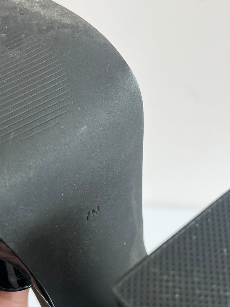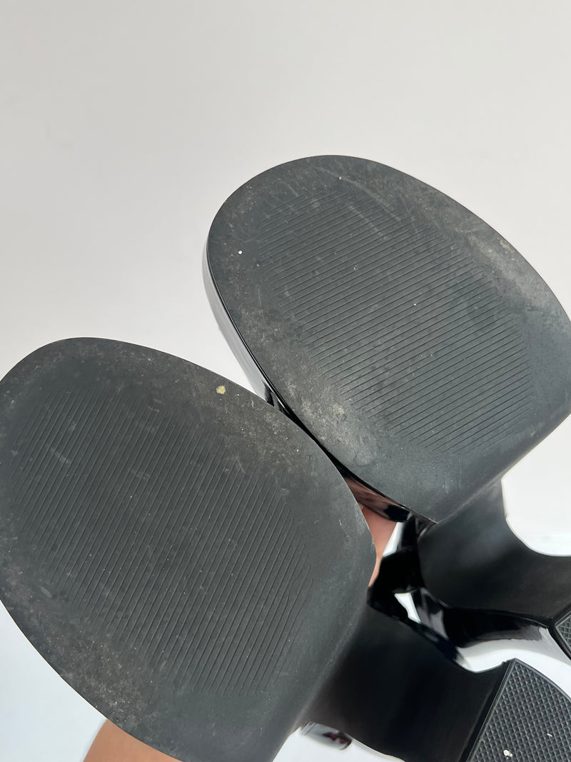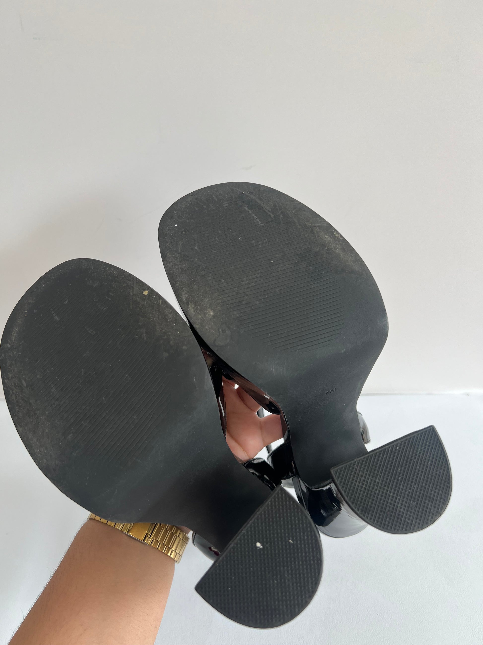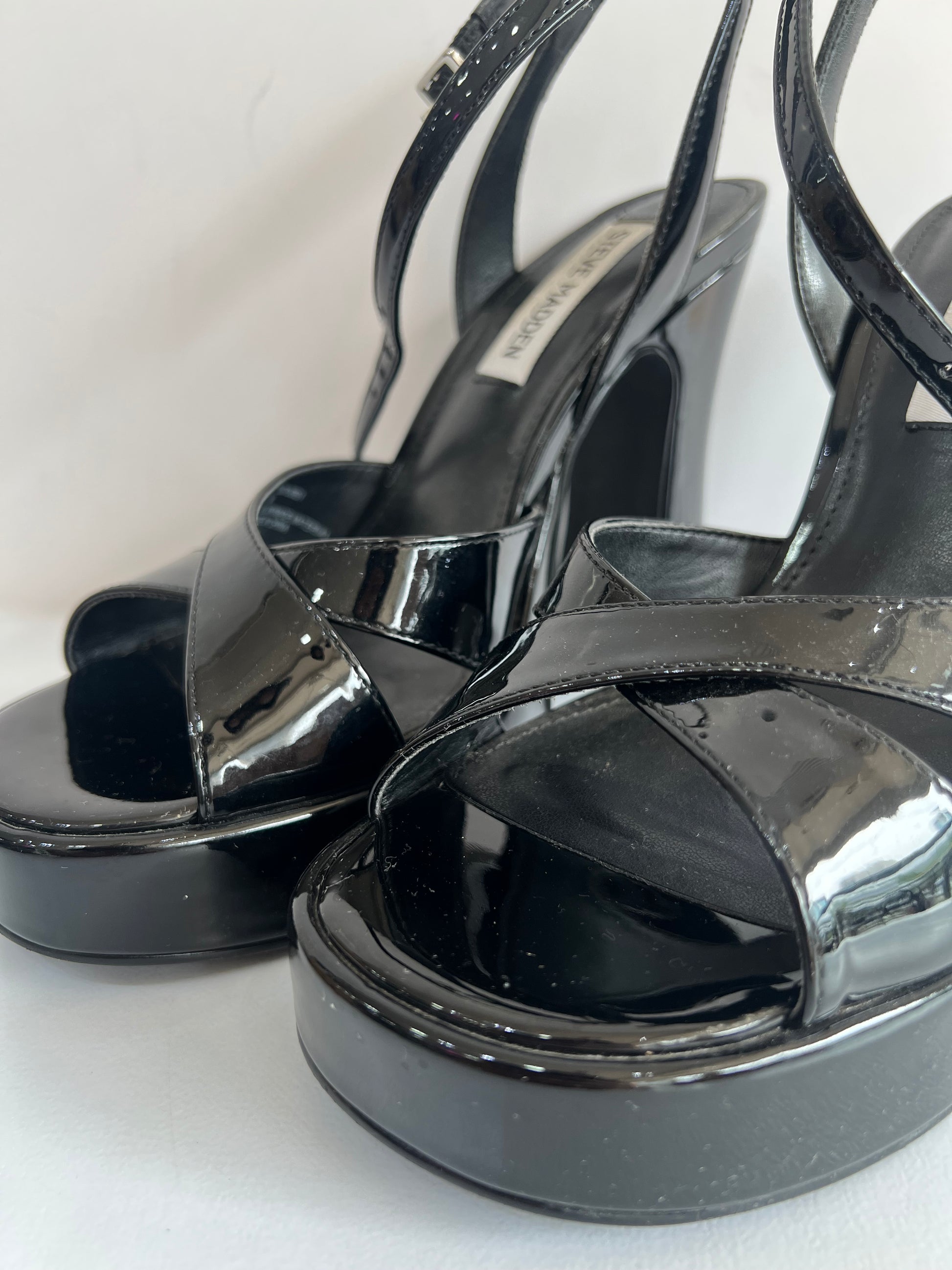 Tacones altos Steve Madden en charol negro brillante, con acabado lustroso. Presentan silueta estilizada con punta semi cuadrada y tacón.