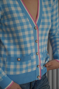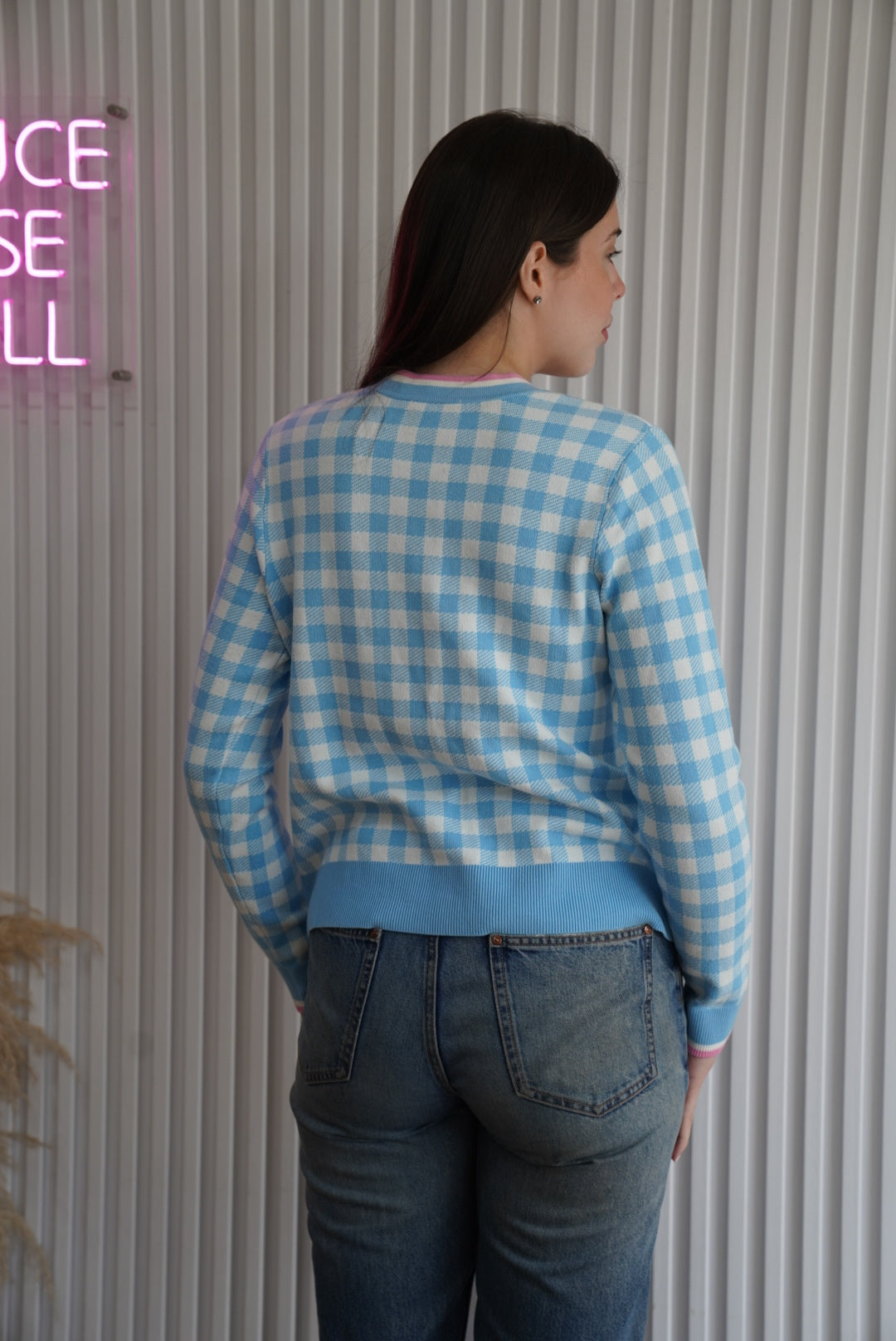 Este suéter con cuello en corte en V , cuenta con cierre de botones y dos bolsillos frontales.