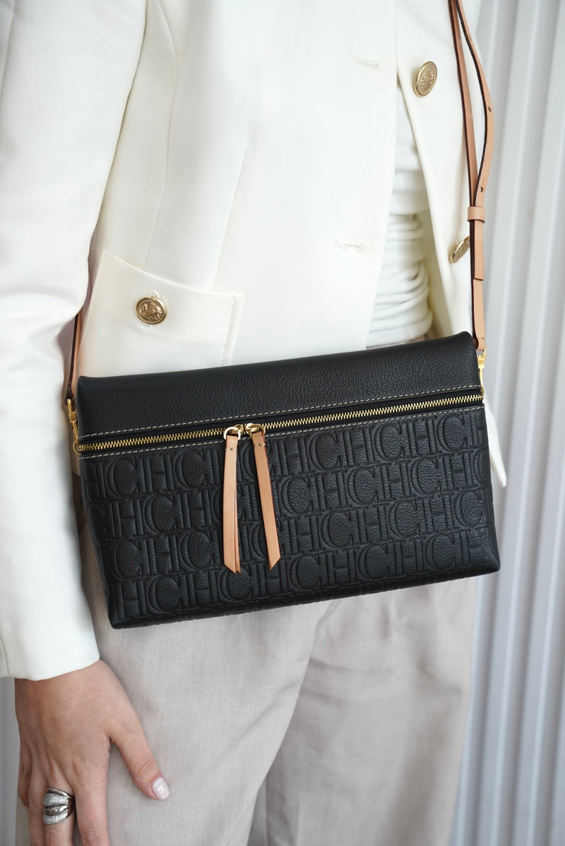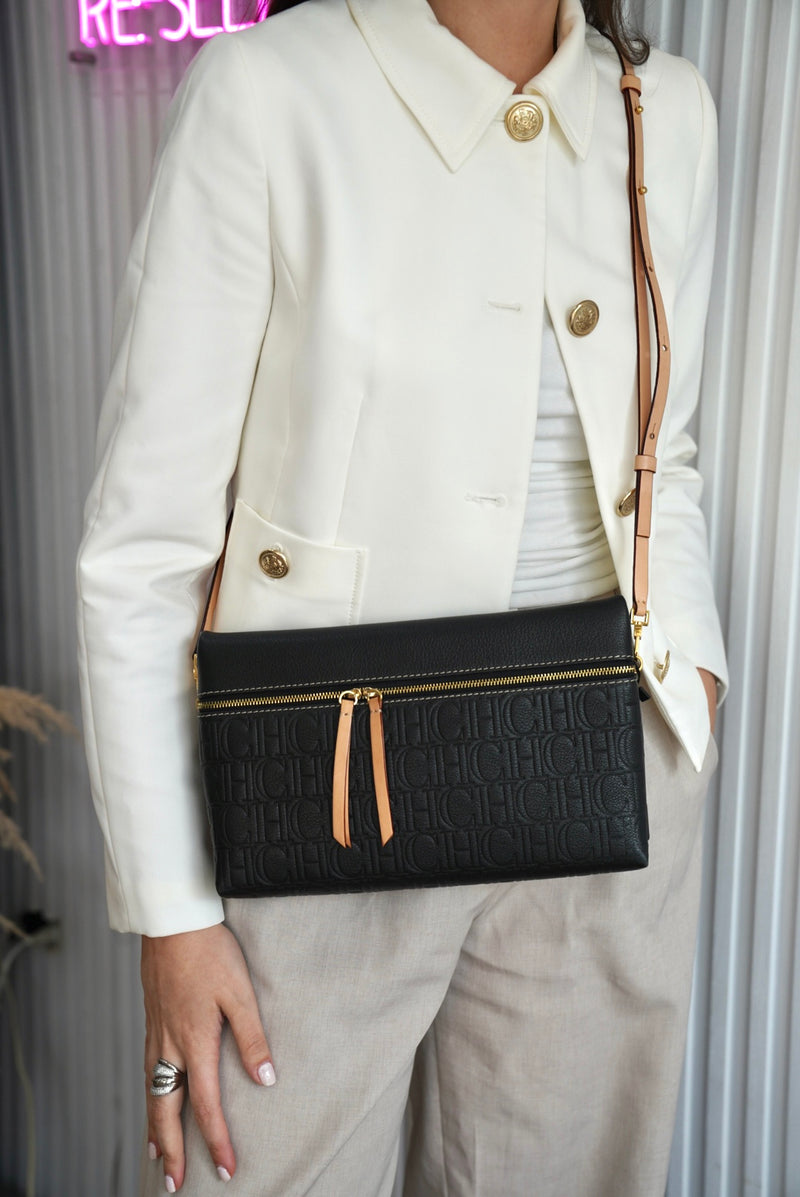 Esta crossbody bag cuenta con una correa de cuero ajustable y desmontable. Su cierre es de zipper y el cuero presenta detalles grabados con el logo 'CH'. En el interior, incluye un bolsillo abierto.