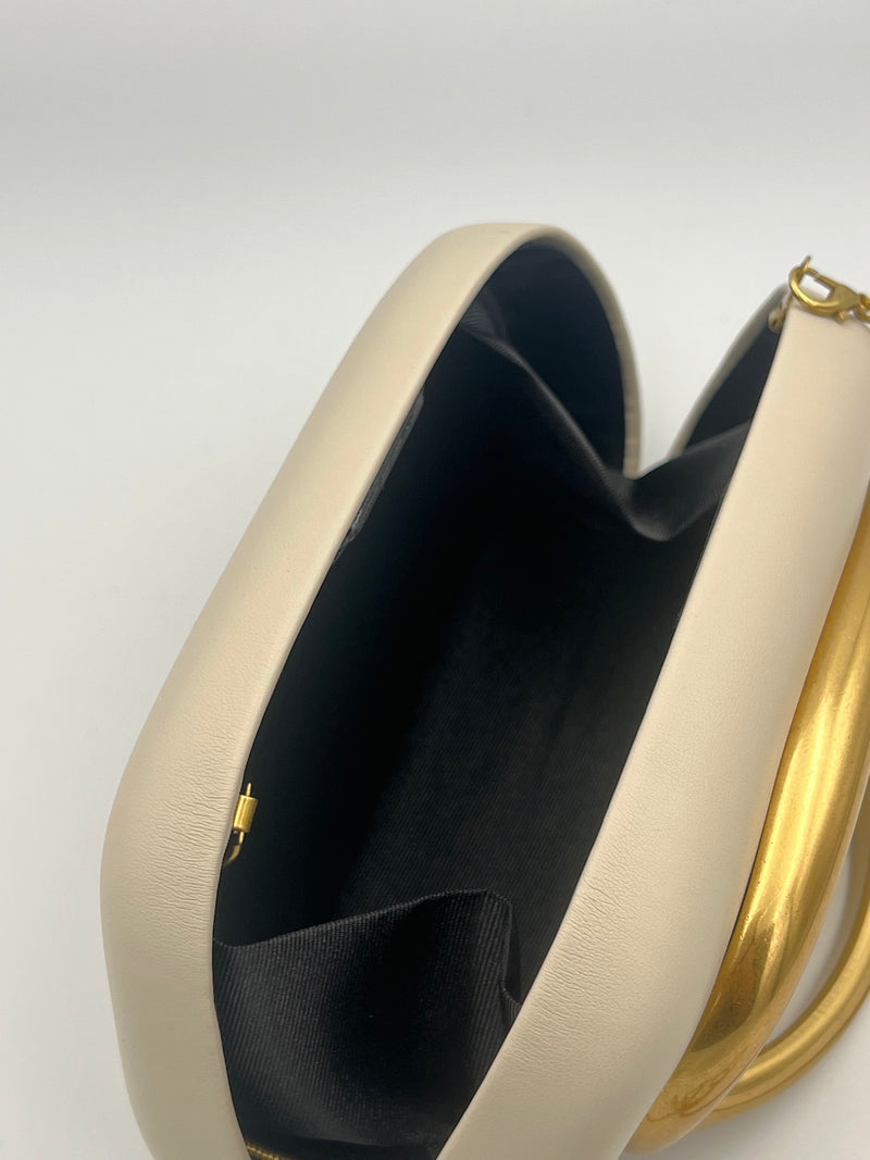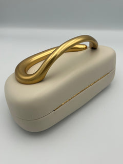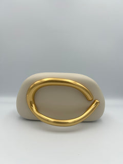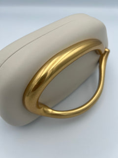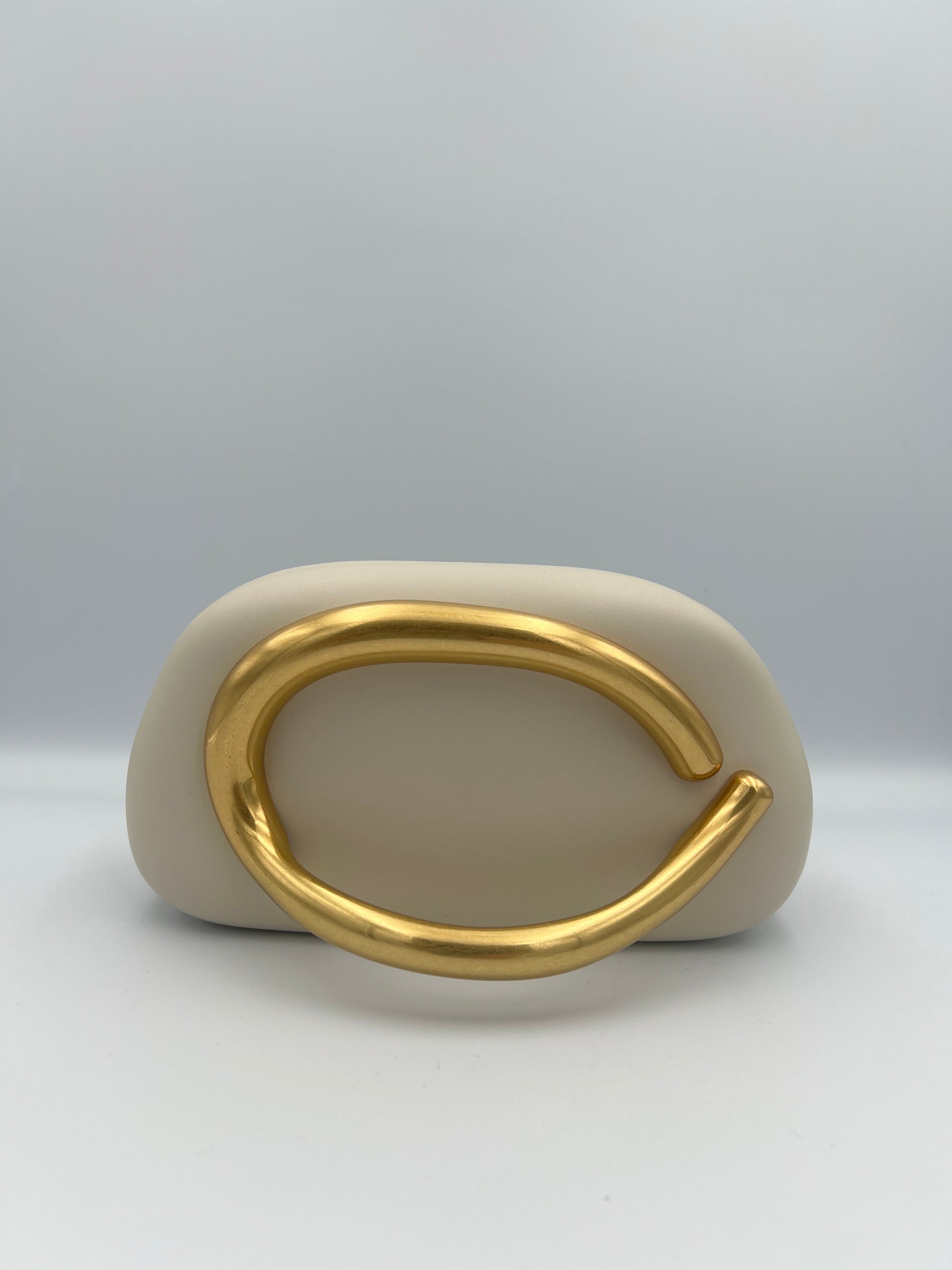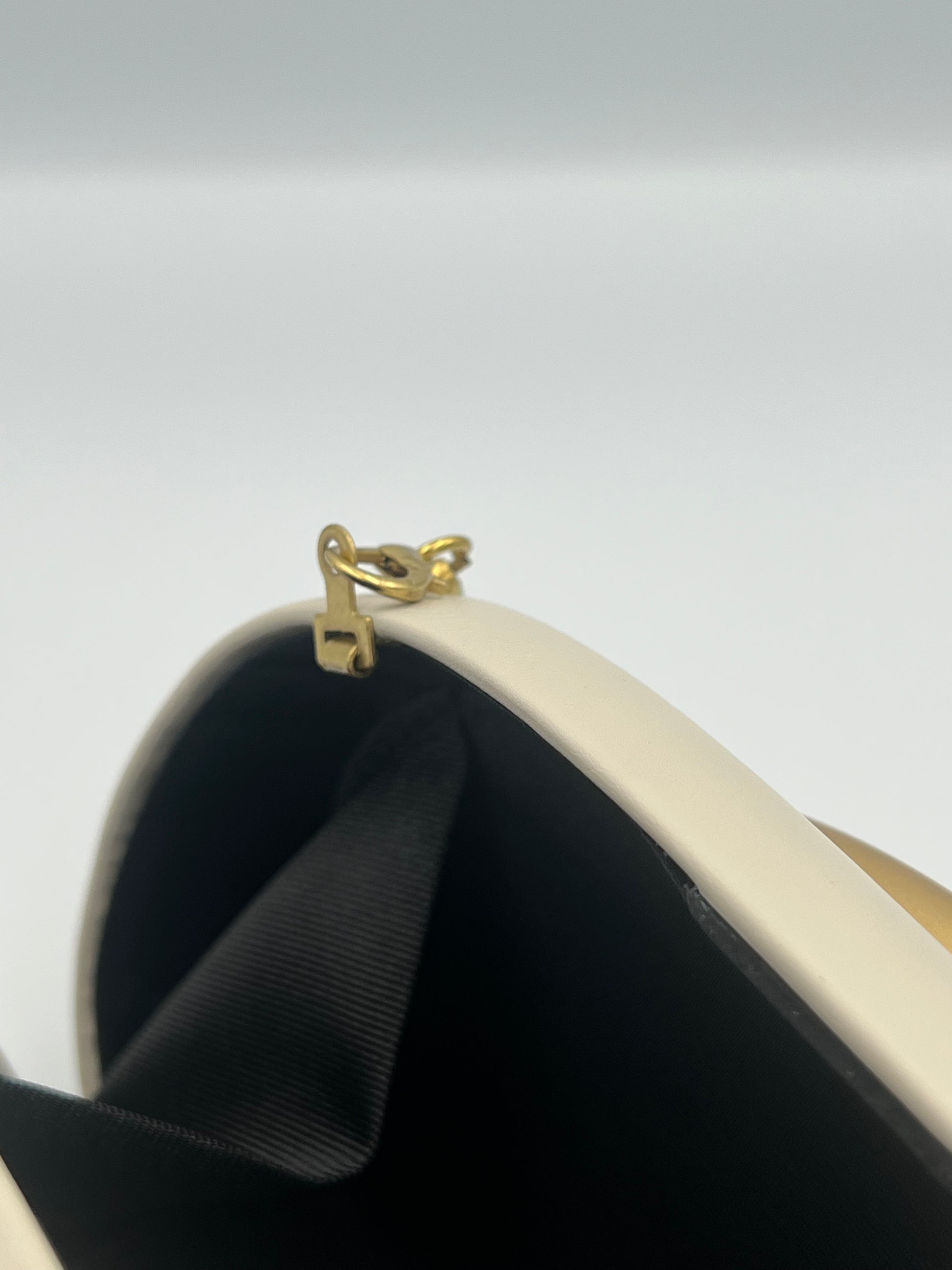 Bolso tipo clutch, estructura rígida. Cuenta con cierre superior de imán con agarradera dorada tridimensional. Incluye cadena desmontable para llevar cruzada.