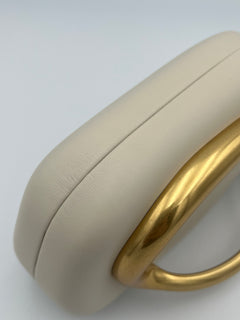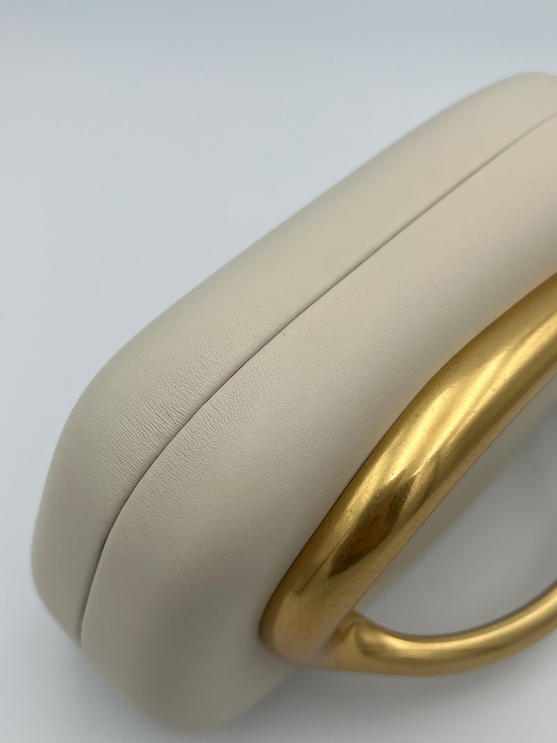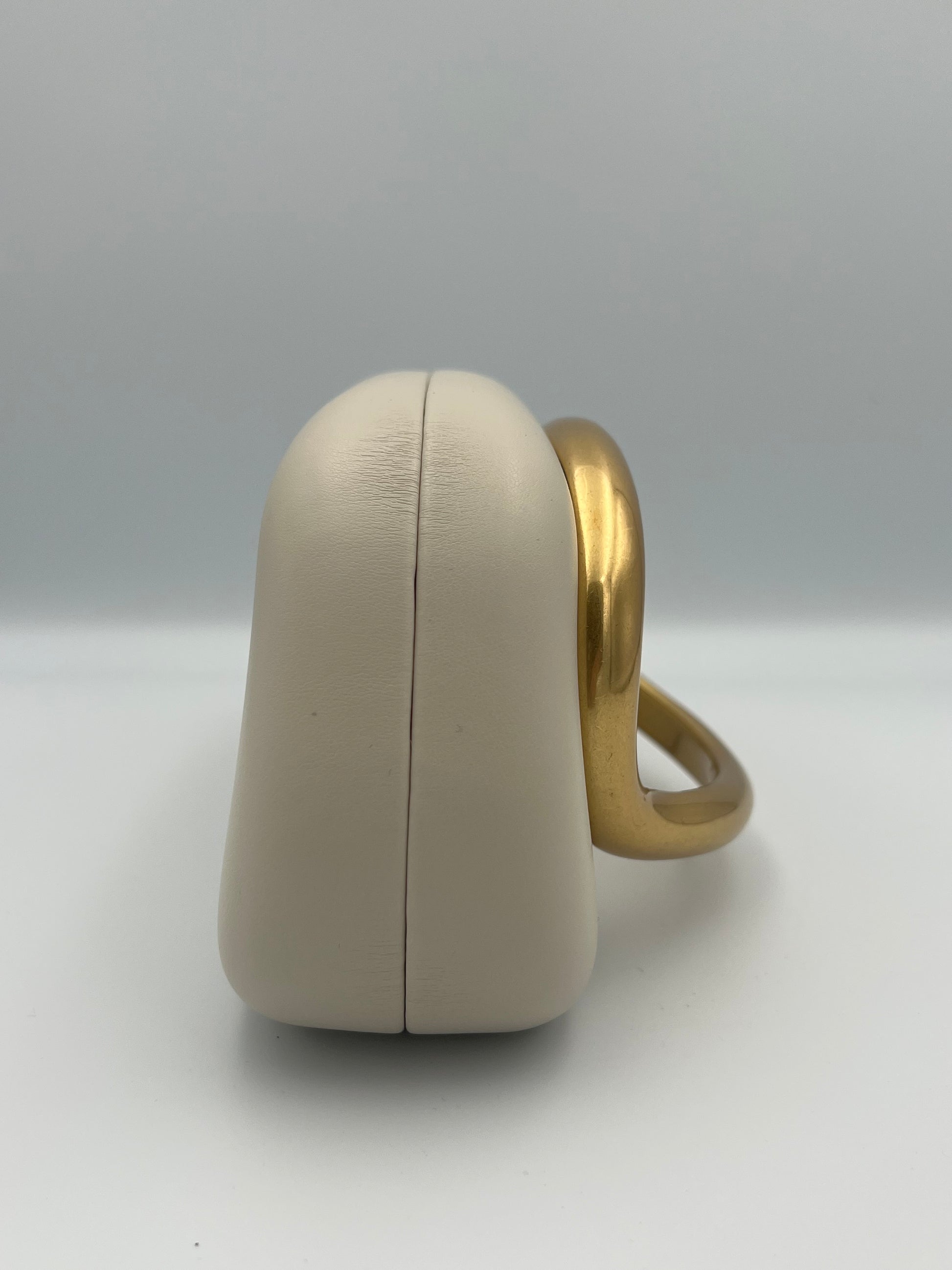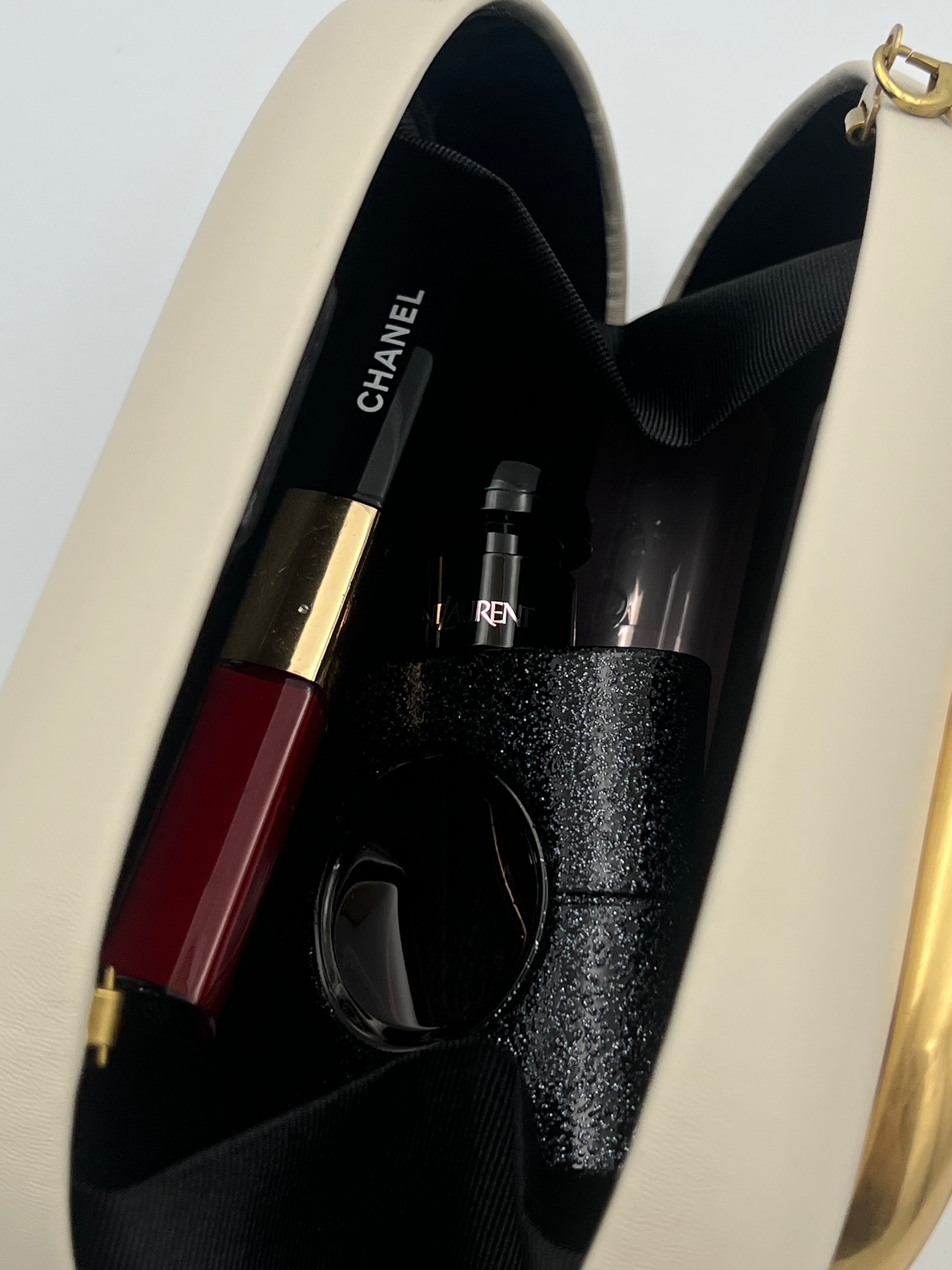 Bolso tipo clutch, estructura rígida. Cuenta con cierre superior de imán con agarradera dorada tridimensional. Incluye cadena desmontable para llevar cruzada.