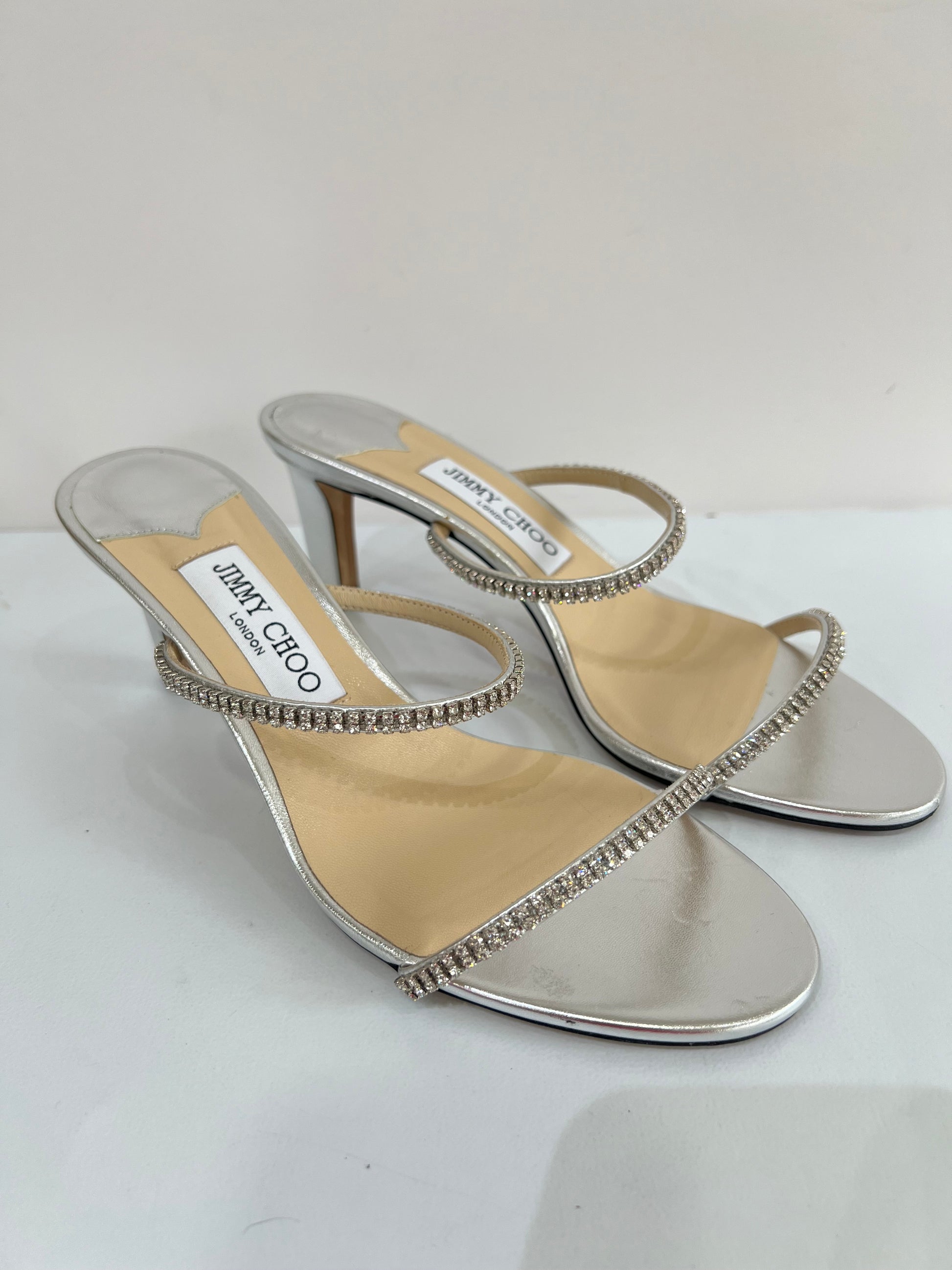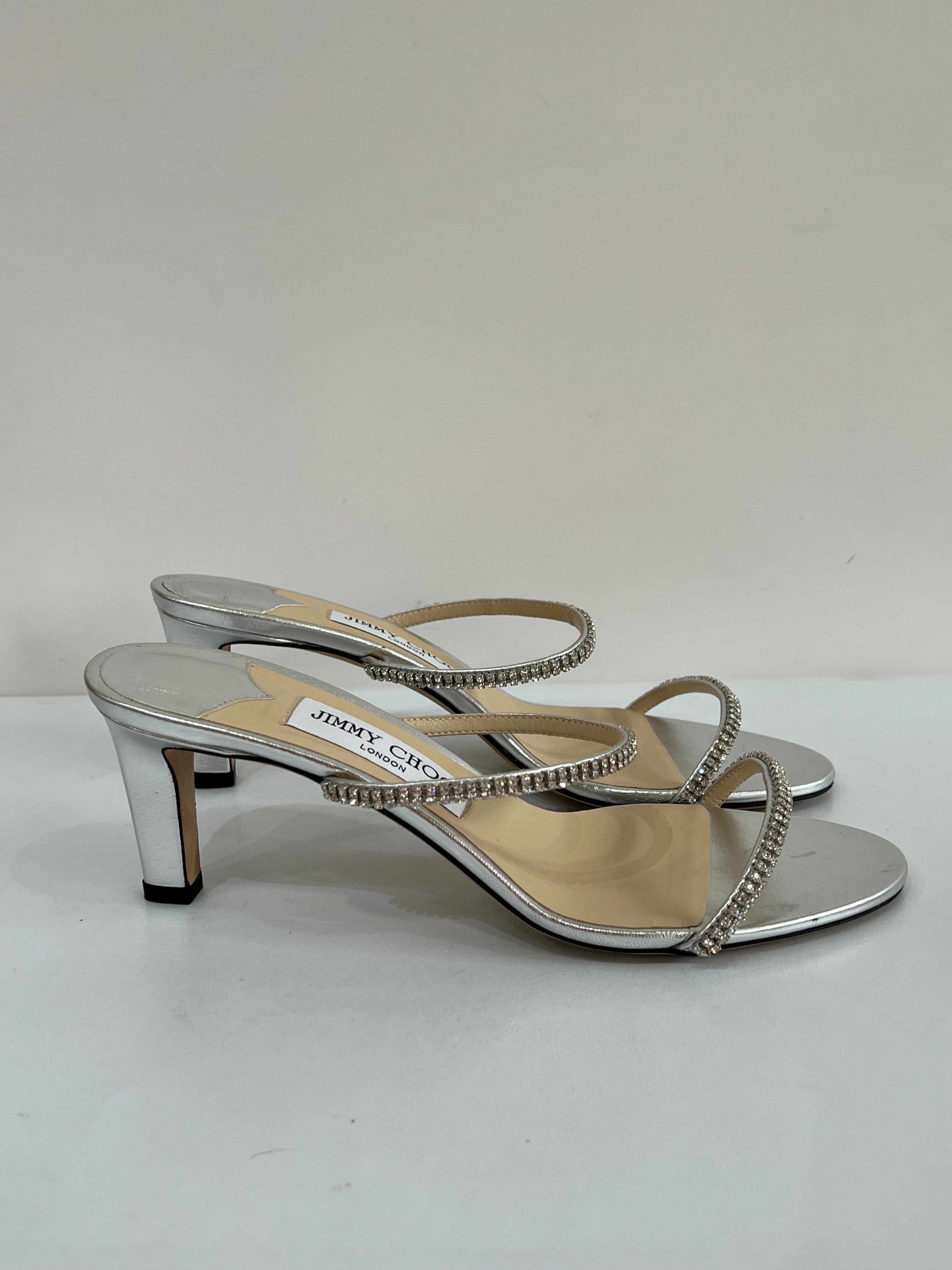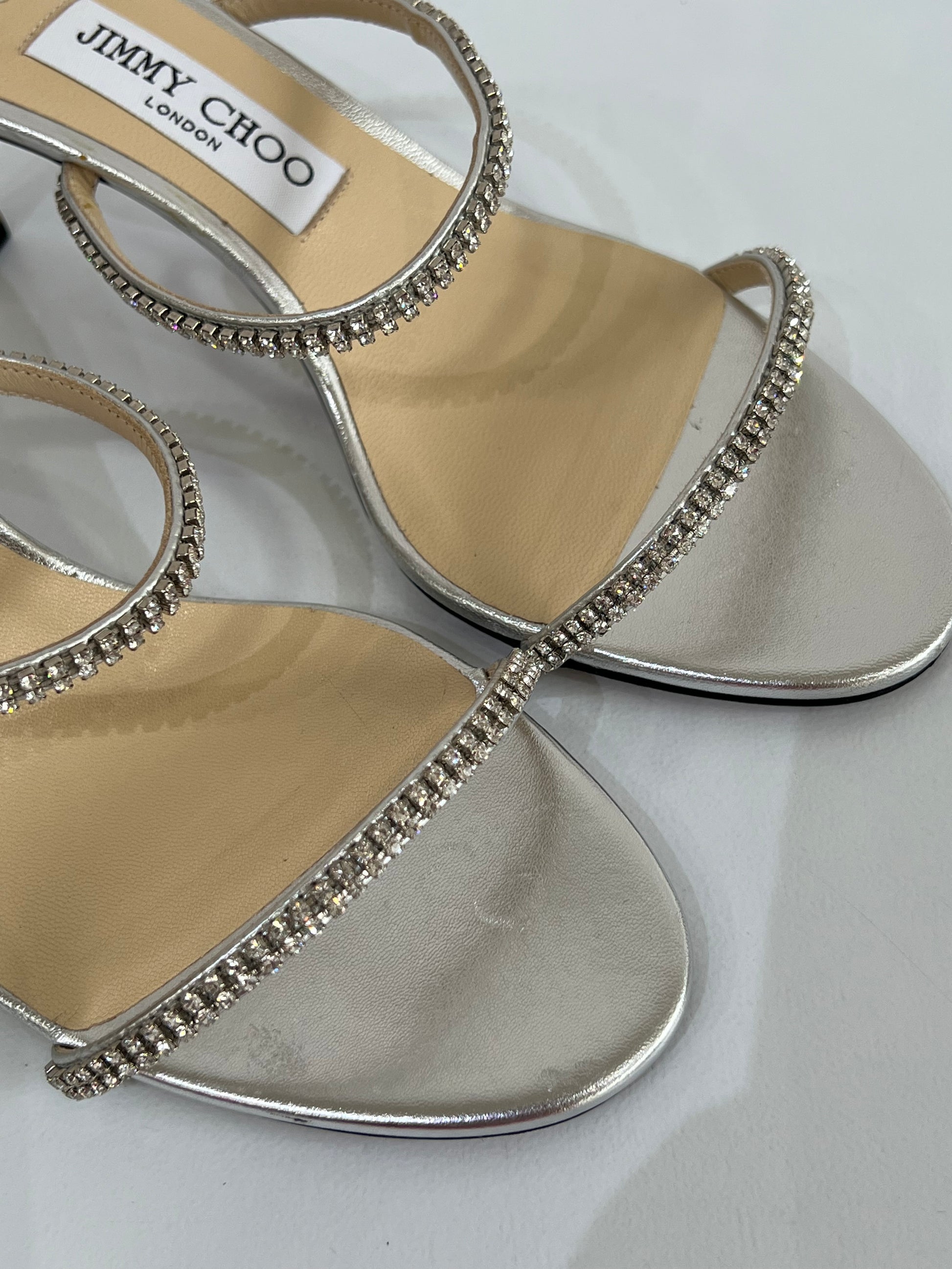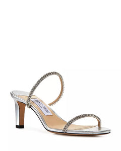 Sandalias de tacón 65mm, con tiras finas adornadas con cristales, plantilla de cuero, acabado metálico.