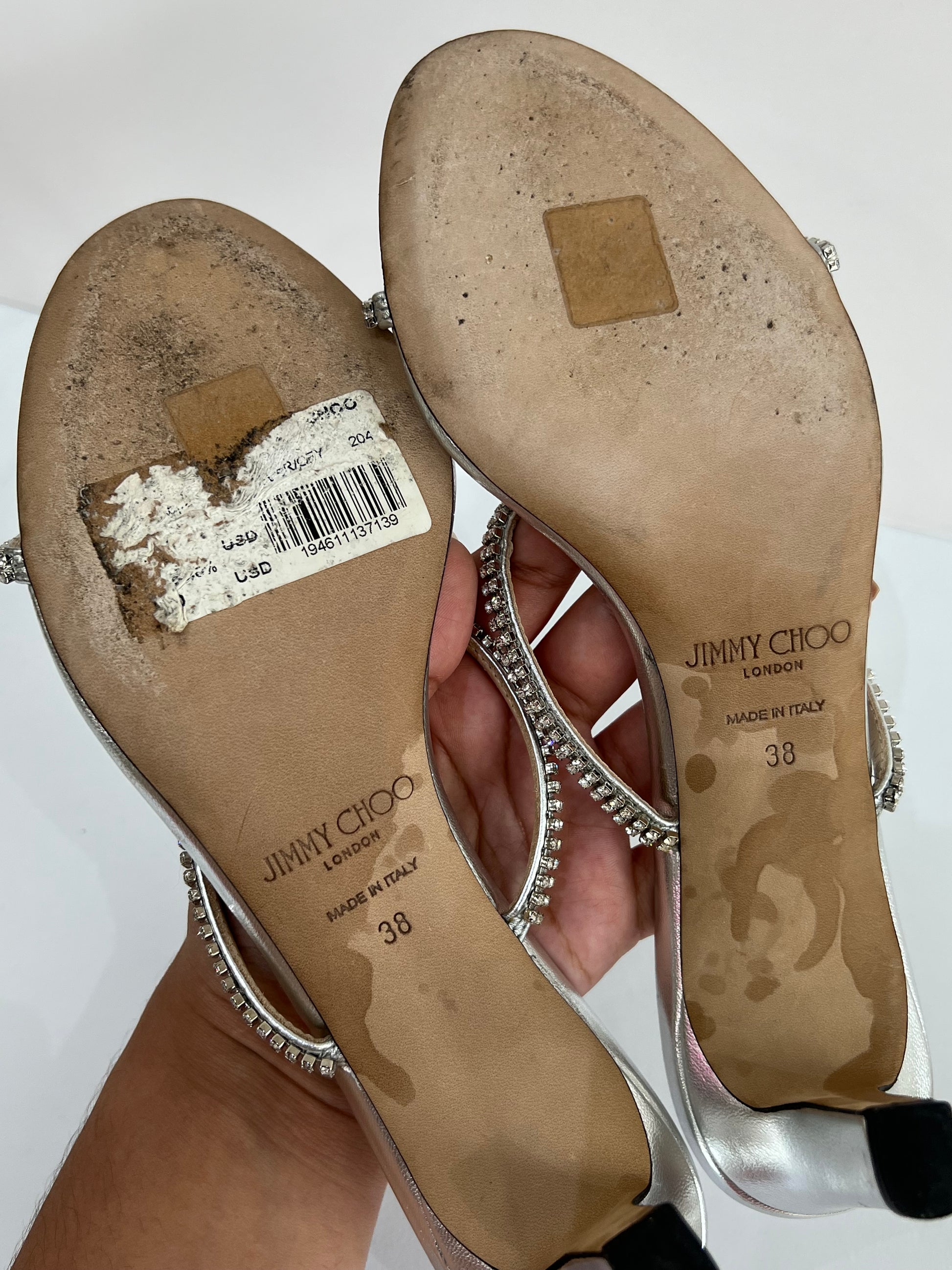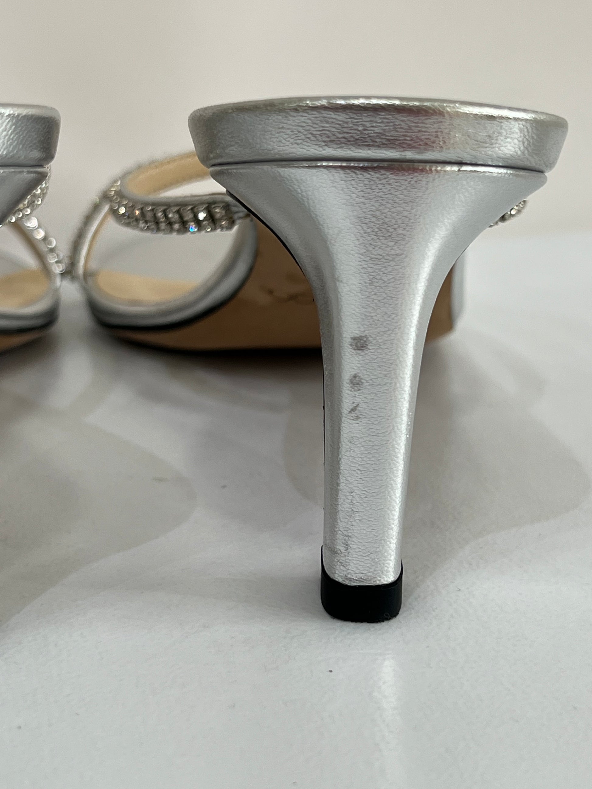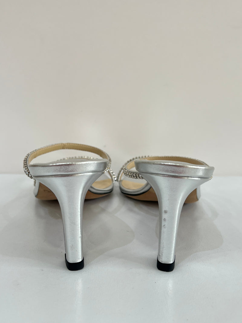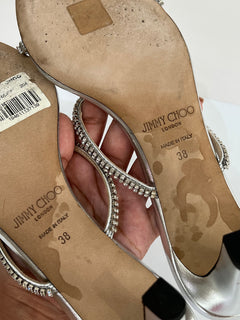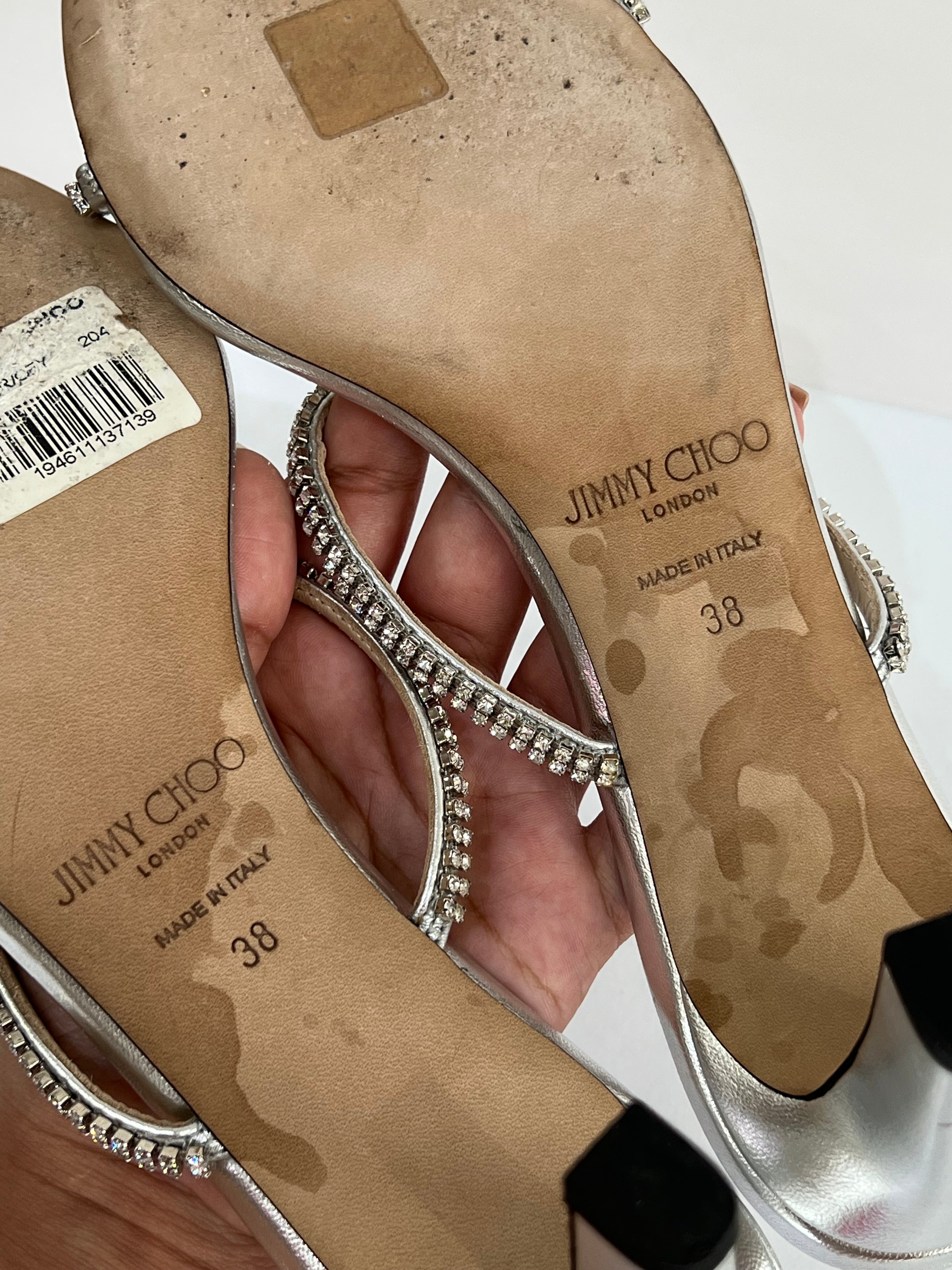 Sandalias de tacón 65mm, con tiras finas adornadas con cristales, plantilla de cuero, acabado metálico.