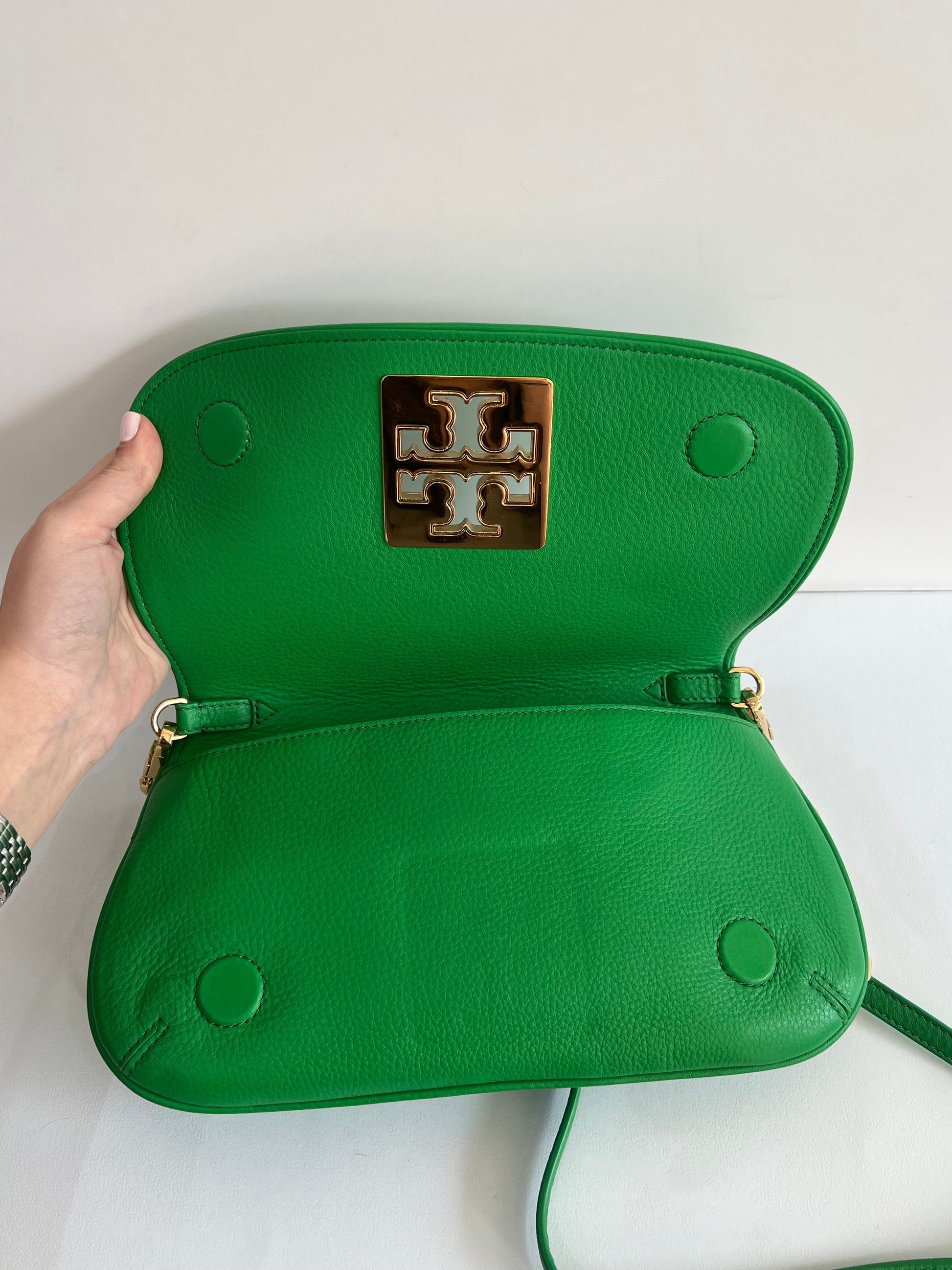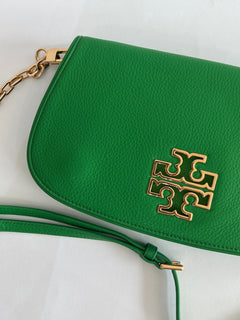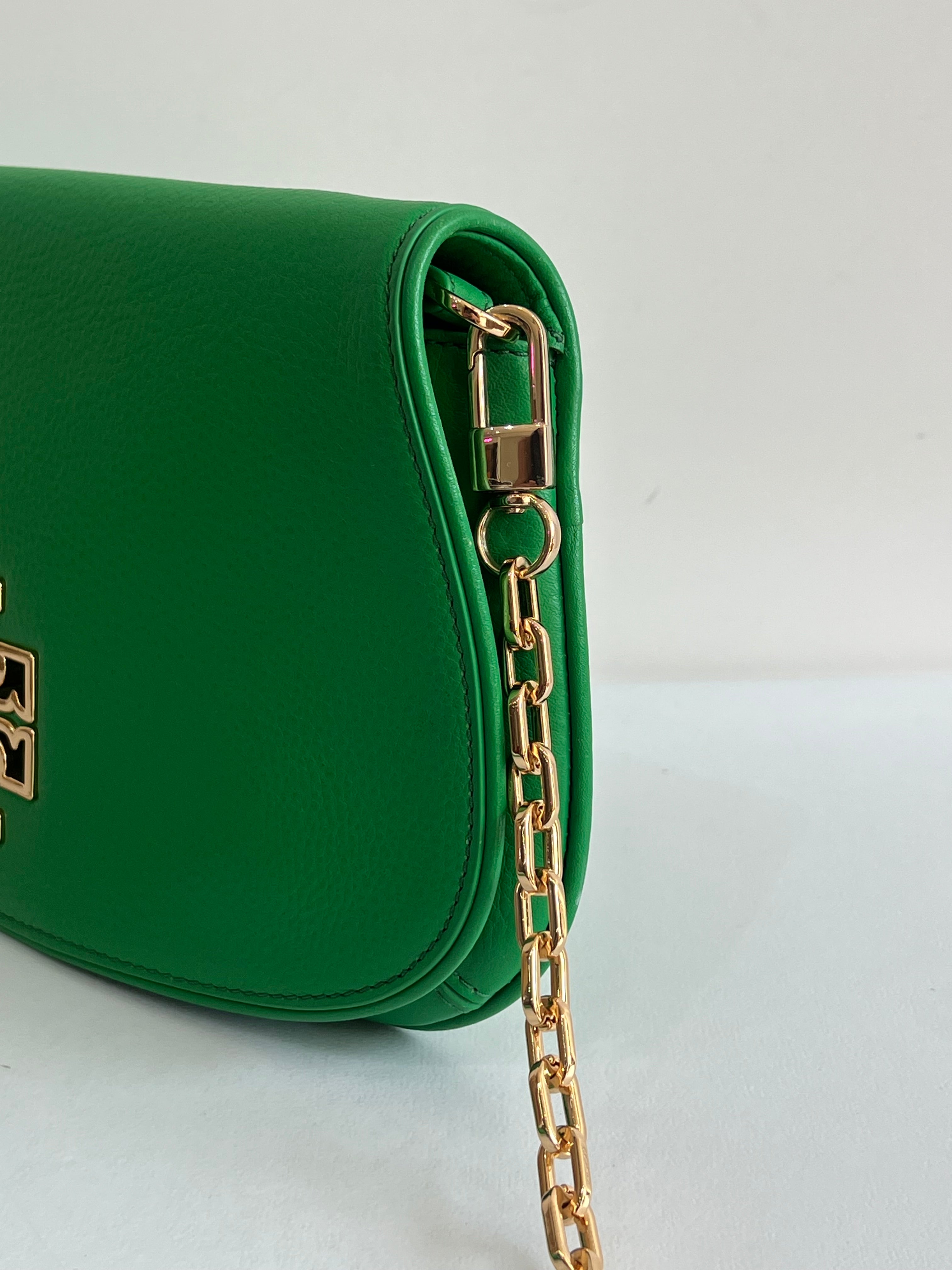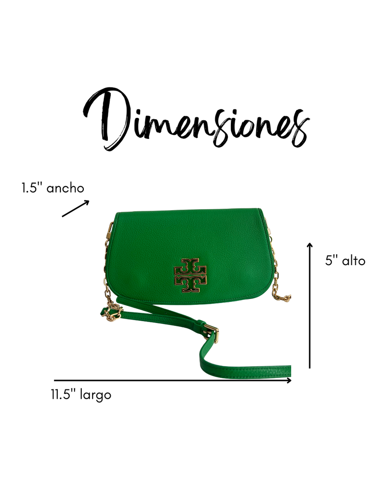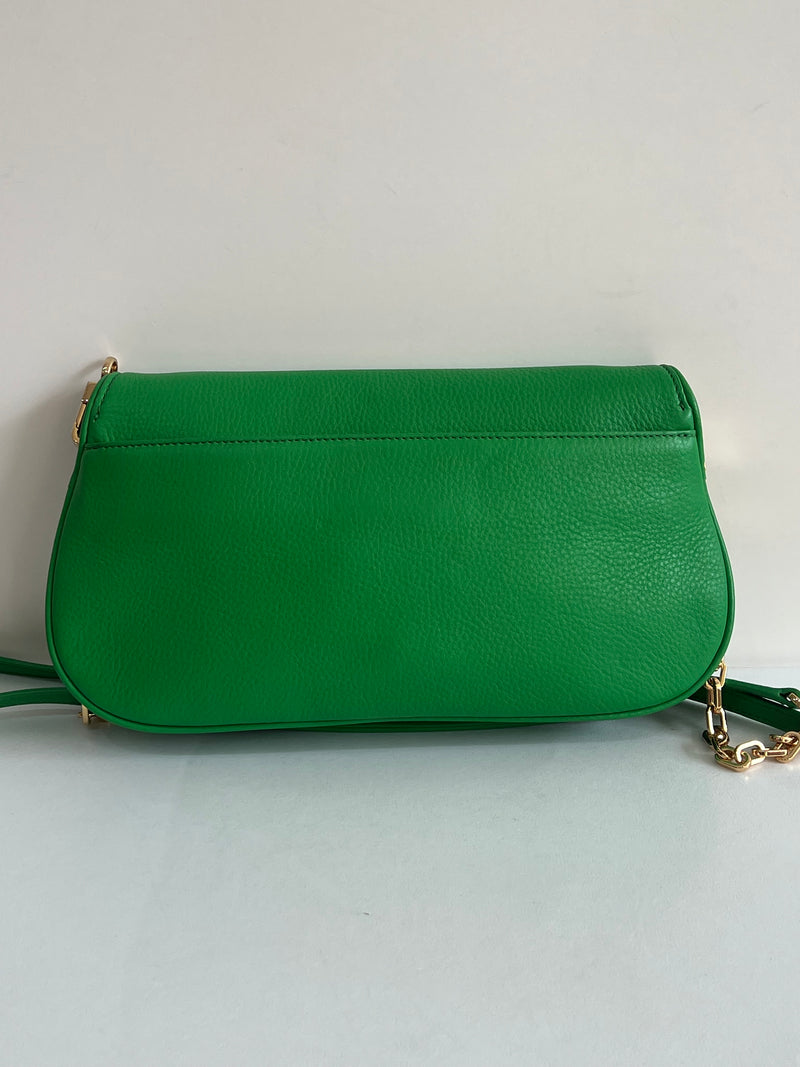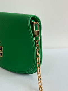 Bolso tamaño mediano con un diseño estructurado. Cuenta con cierre de solapa, logotipo y cadena en acabado dorado.