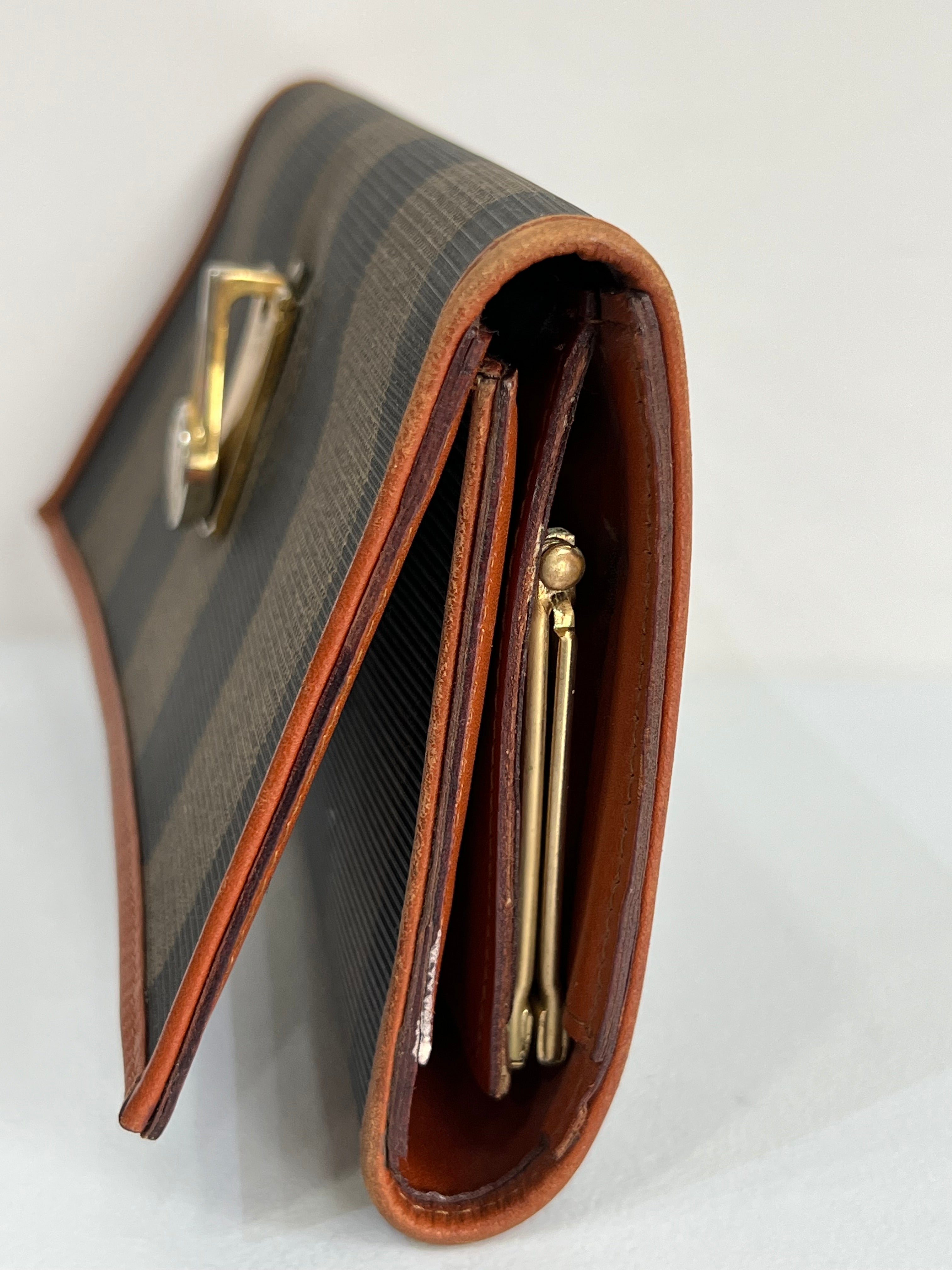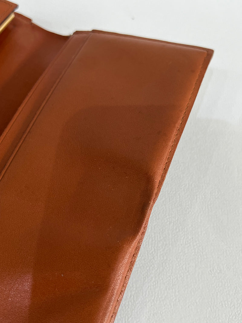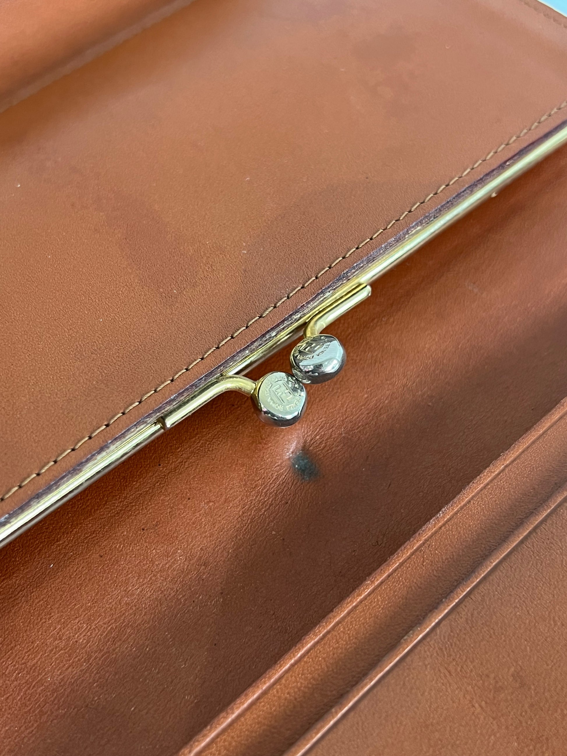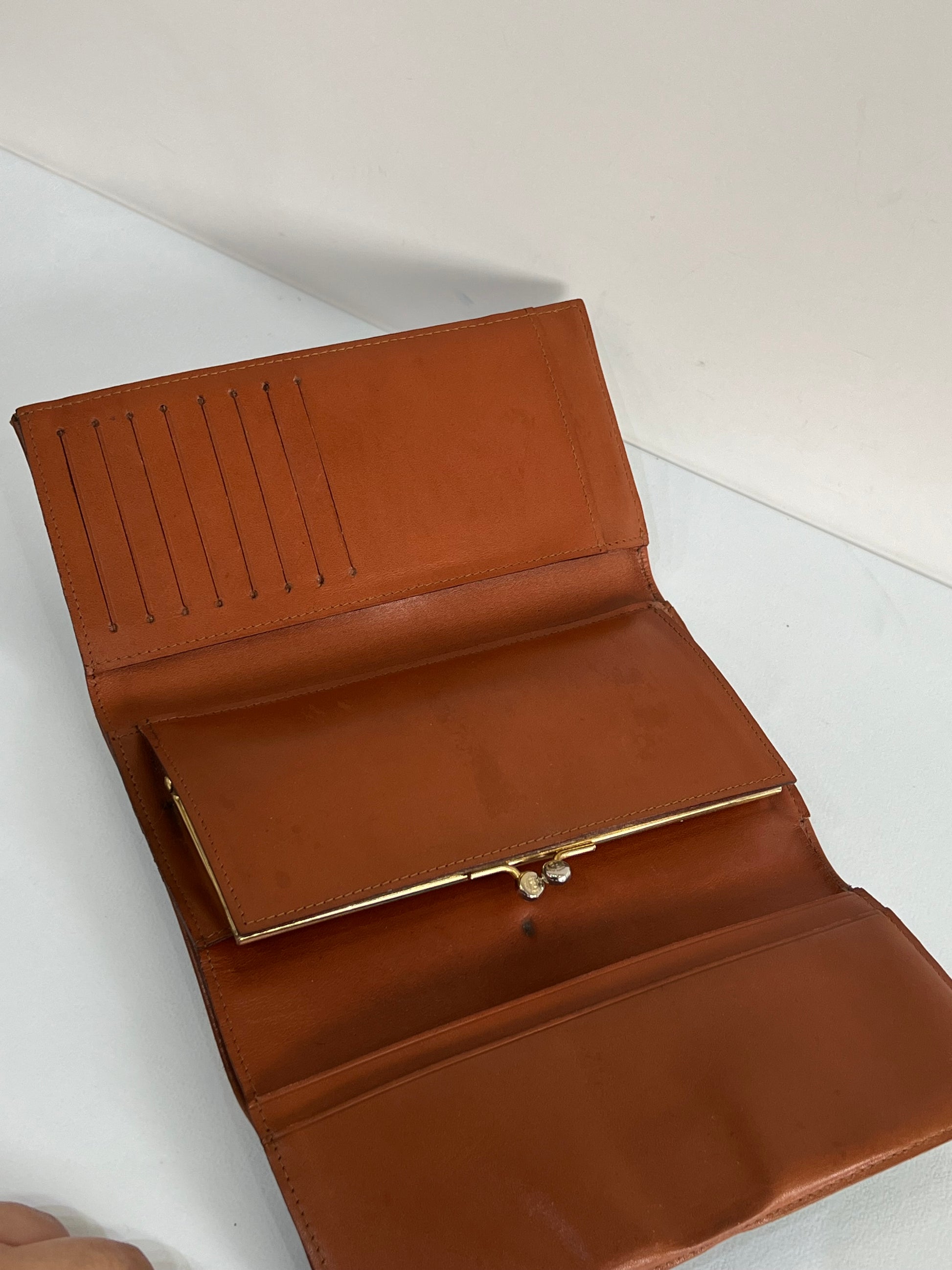 Billetera con multiples compartimentos para tarjetas, efectivo y con un compartimento interior con cierre de broche metalico. Cuenta con detalles en el cuero del interior de compartimentos y en el hardware exterior.