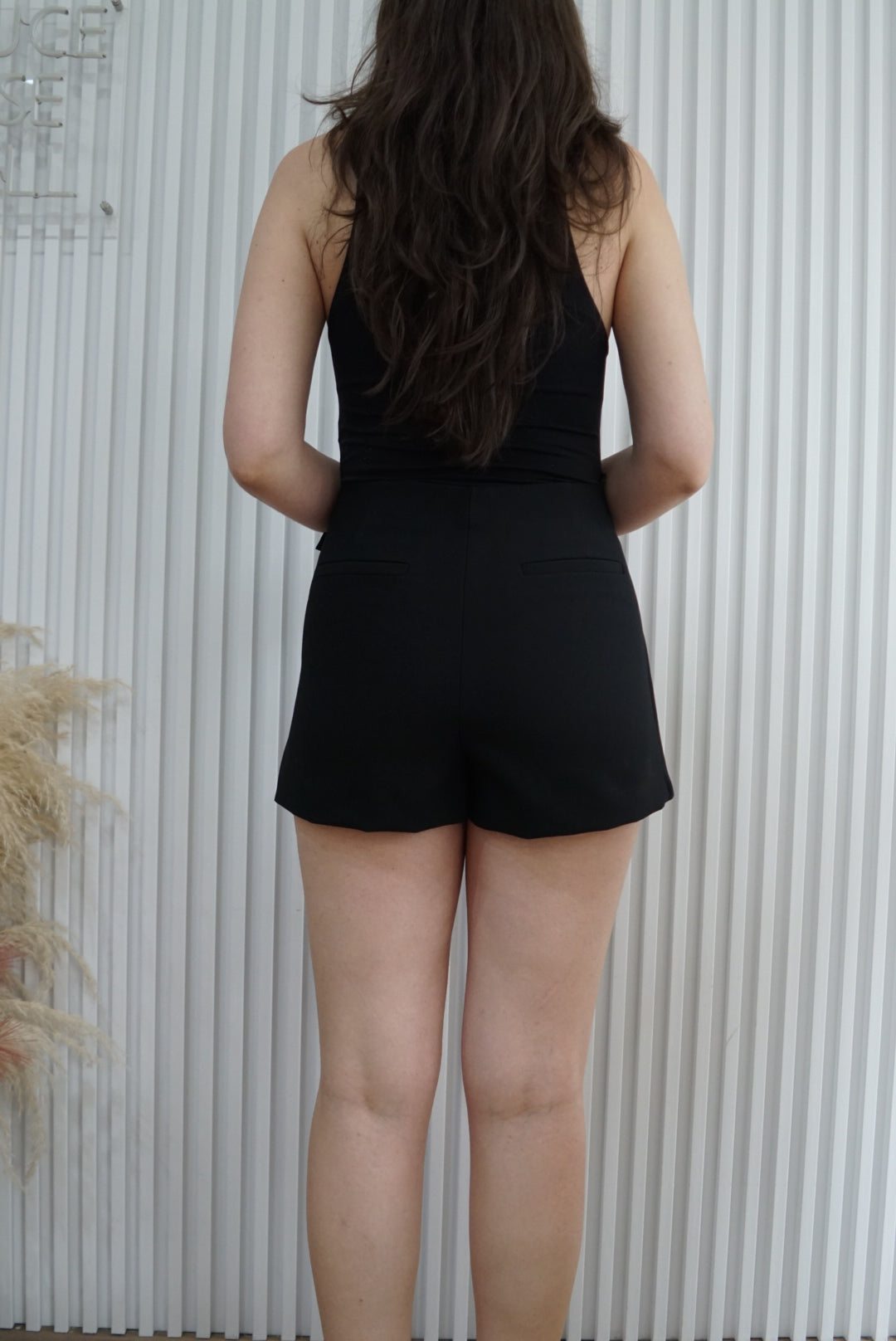 Este mini skort tiene un corte asimétrico y presenta un detalle de hebilla decorativa. Cuenta con un zipper escondido en el lado izquierdo de la cintura.