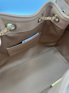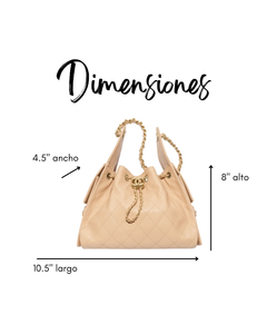 brush aged gold y una correa de hombro de cuero fija. El interior está forrado en tela, cuenta con bolsillos interiores mas dos bolsillos externos. Perfecta para uso diario.