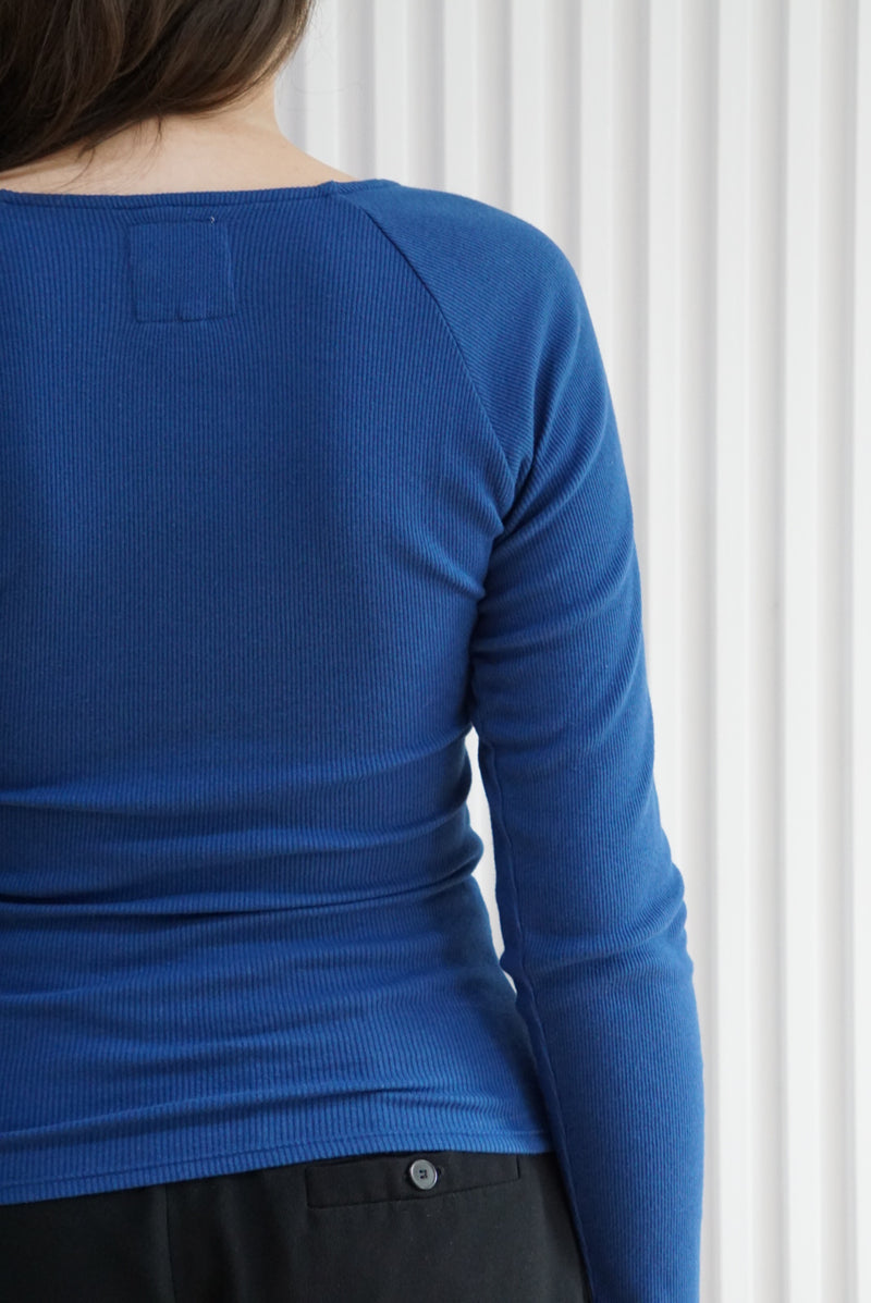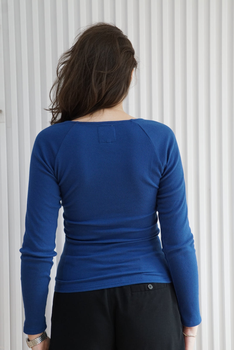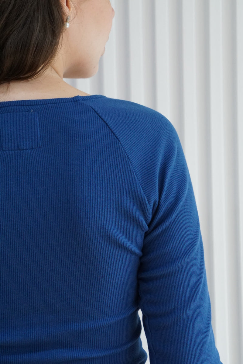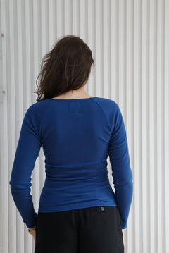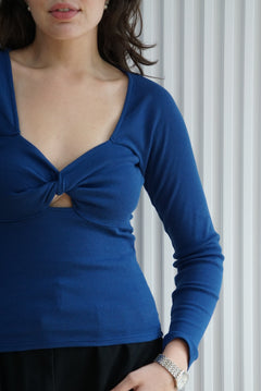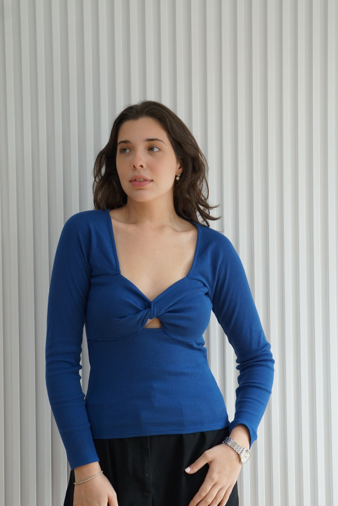 Blusa manga larga de tela stretch con detalle en el área del busto. Color azul electrico.