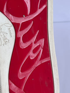 Estos tenis de cuero cuentan con la icónica suela roja de la marca. Se aseguran con cordones.