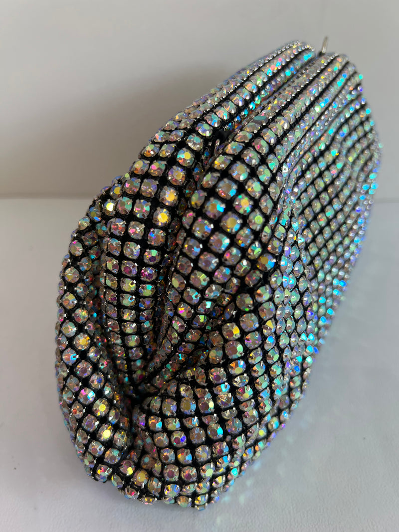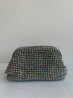 Clutch de tamaño pequeño con acabado glitter de colores en toda la superficie. Tiene estructura rígida, cierre metálico en la parte superior y cadena fina para colgar al hombro.