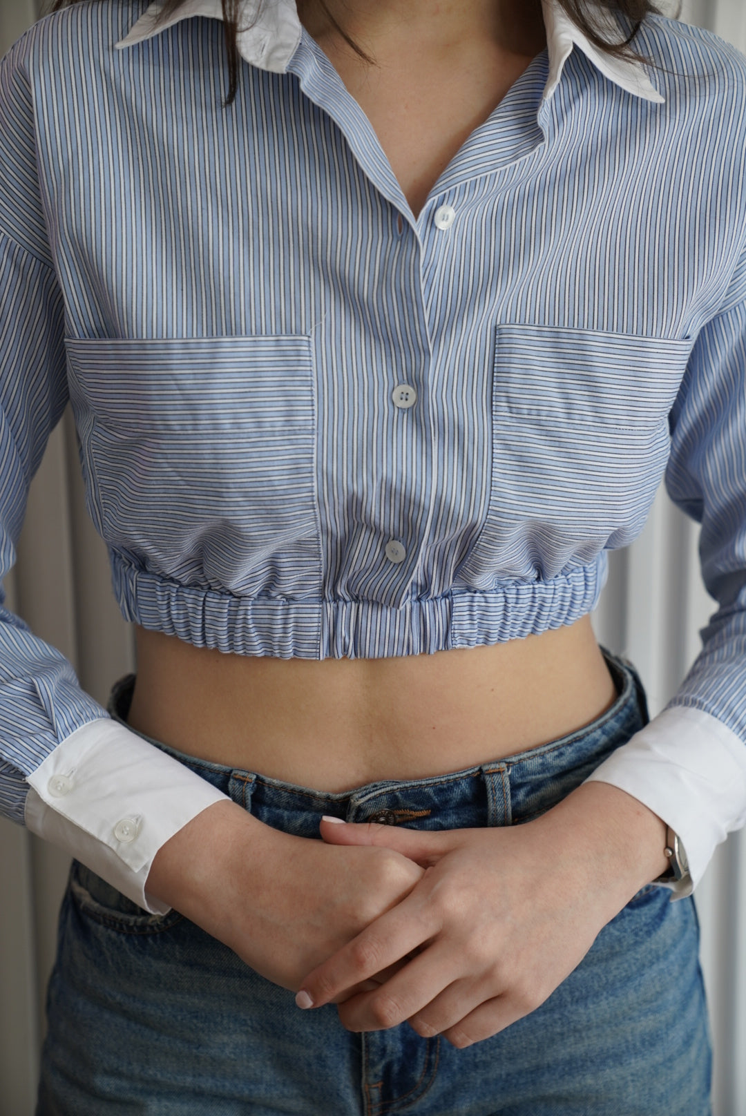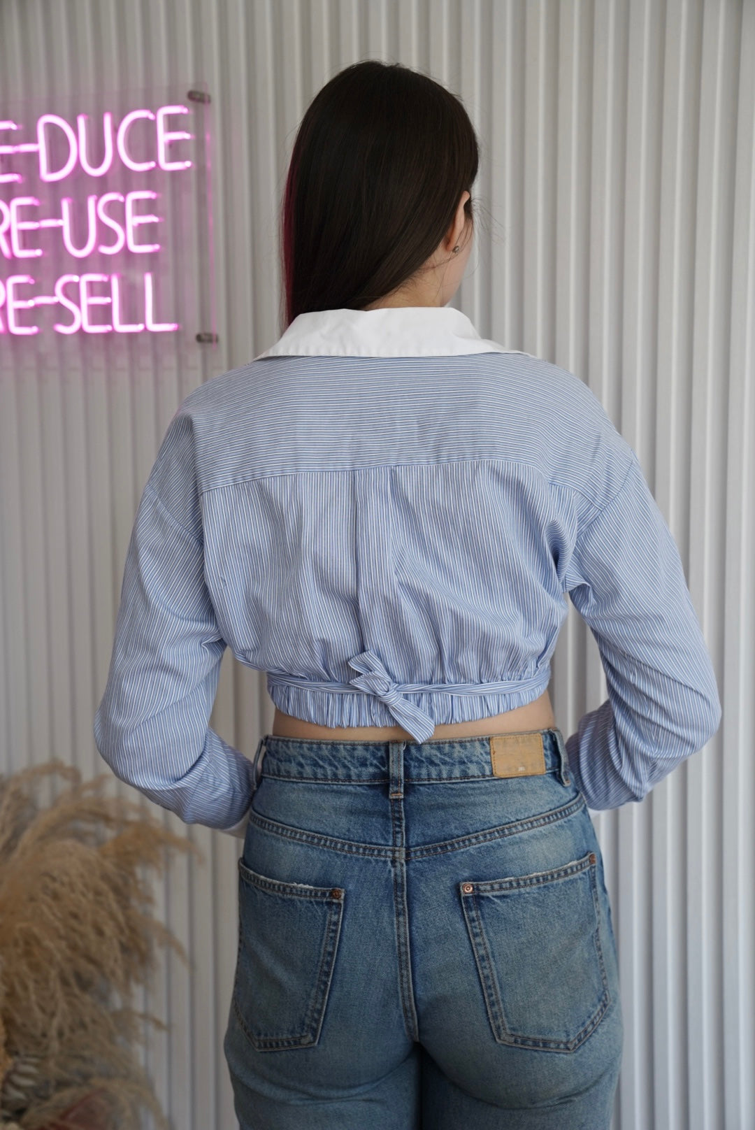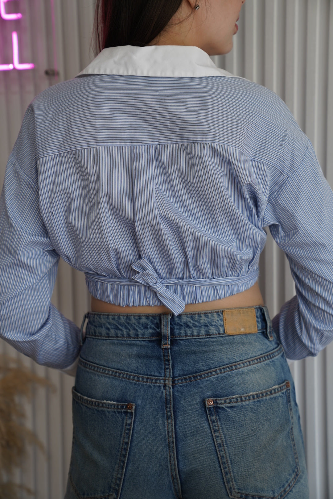 Este top de cuello y manga larga tiene cierre de botones. Es cropped con banda elástica en la cintura y tiene unos cordones para amarrar detrás de la espalda.
