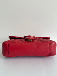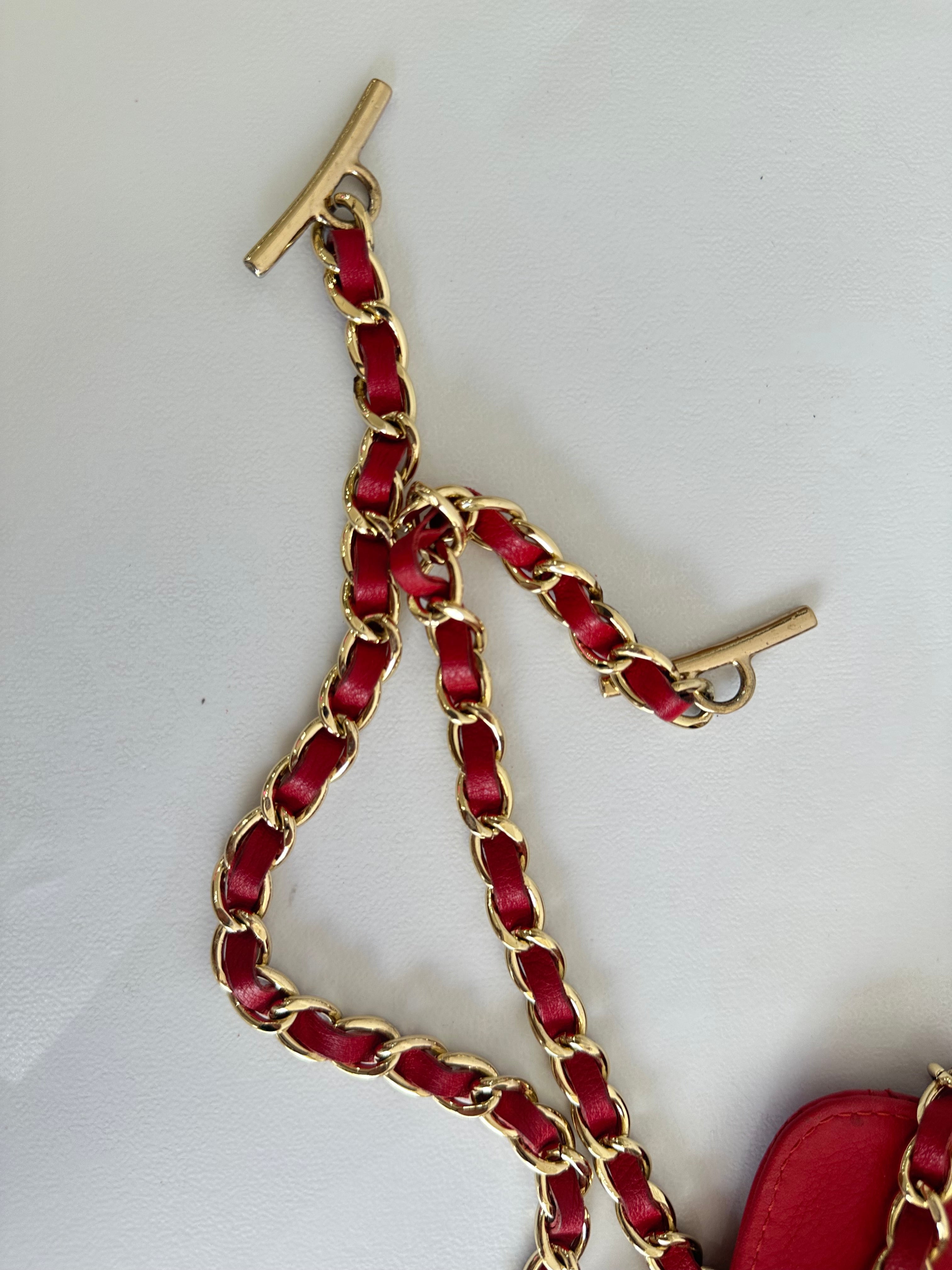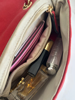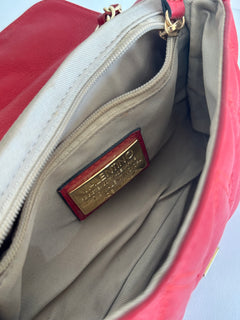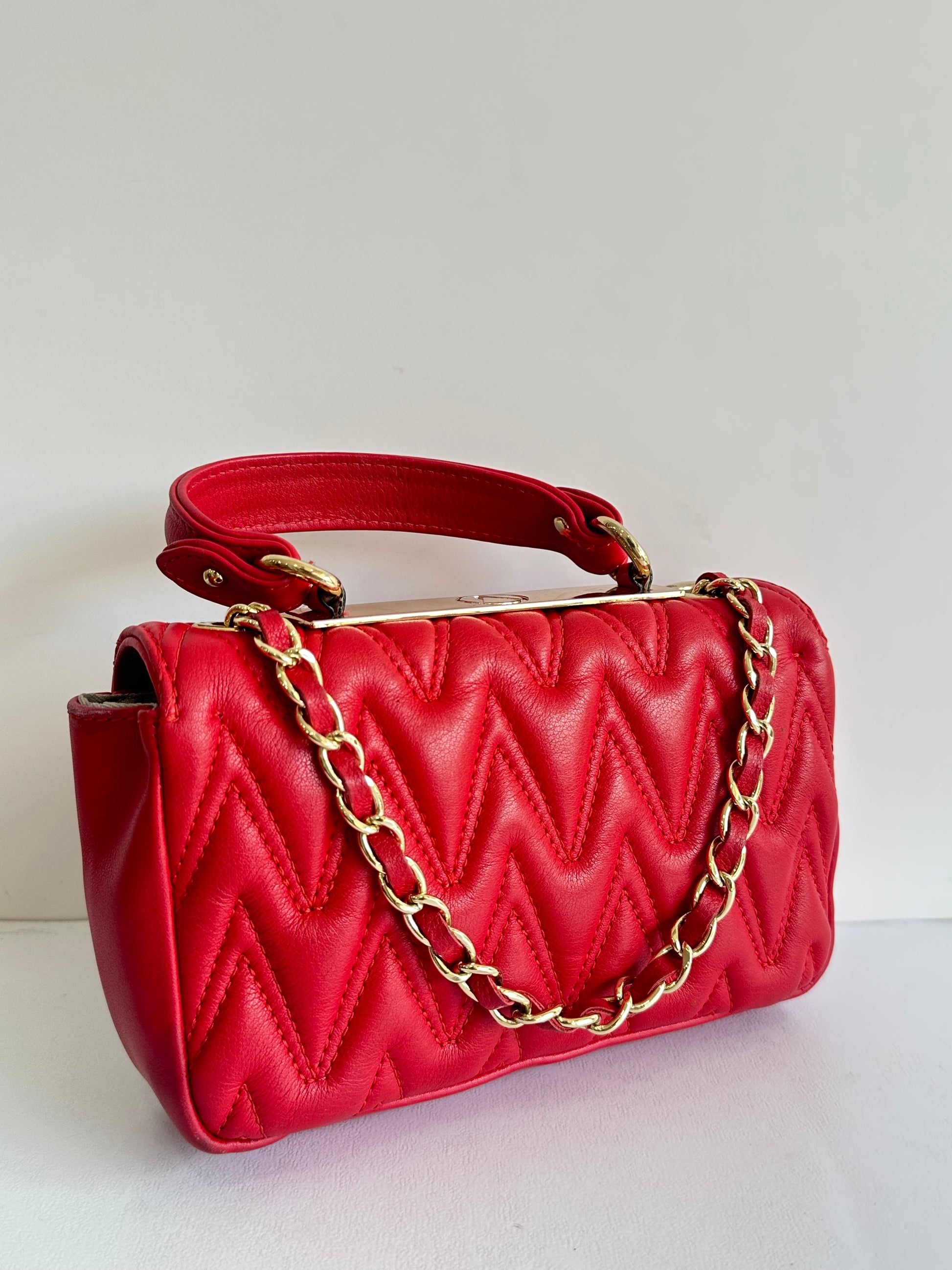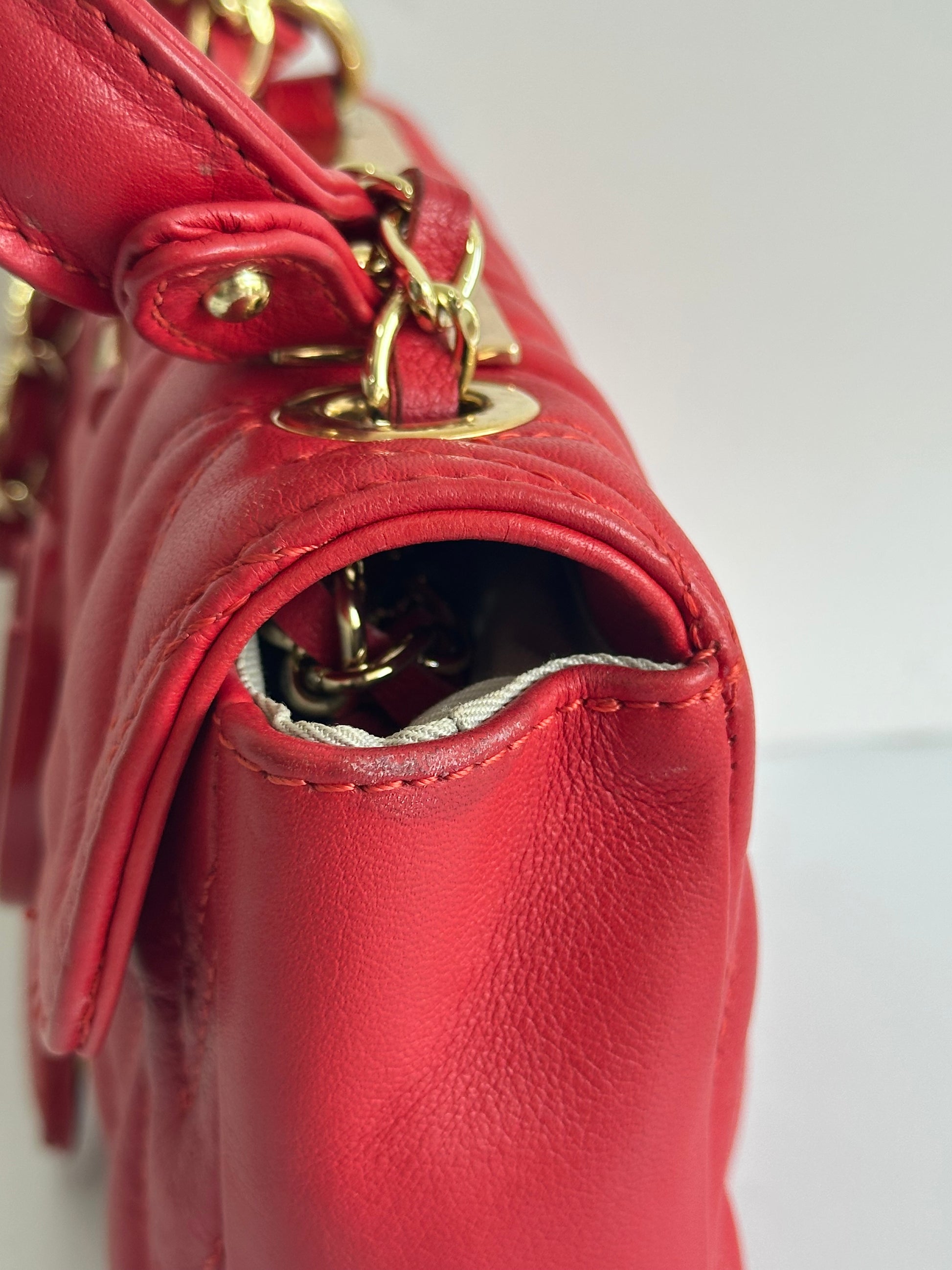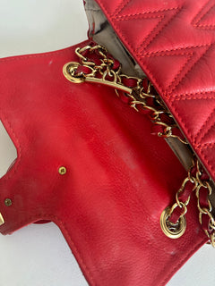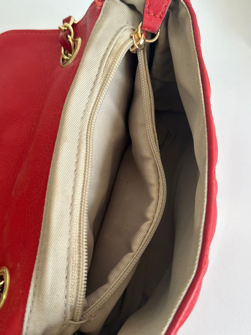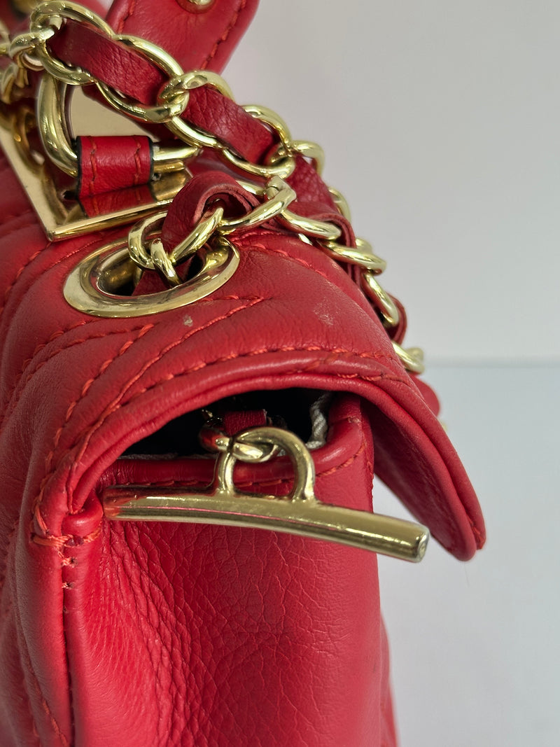 Bolso de hombro en piel acolchada con patrón de rombos, correa de cadena entrelazada en cuero, compartimento central con cremallera y bolsillo interior. Con detalles de uso, mirar las fotos para mayor referencia.