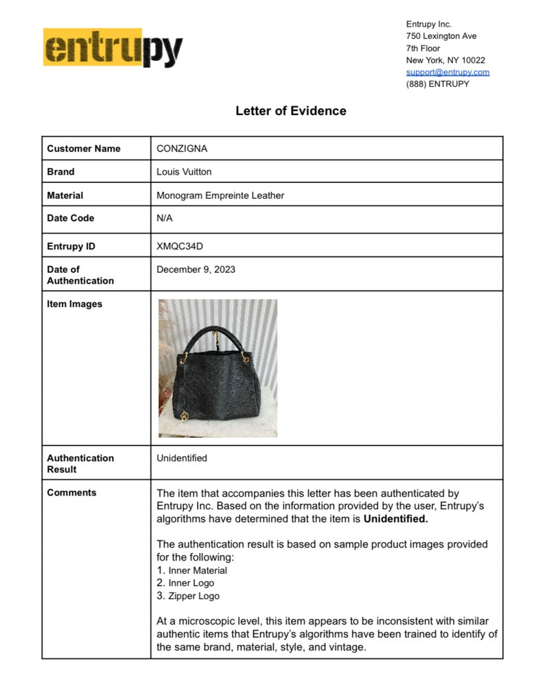 La aplicación extiende además un "Certificado de Garantía Entrupy" en formato digital, al tener el resultado: AUTÉNTICO.