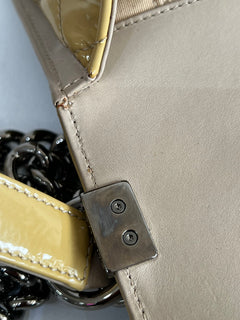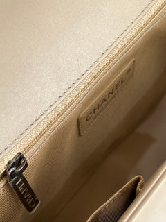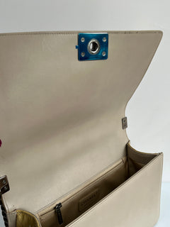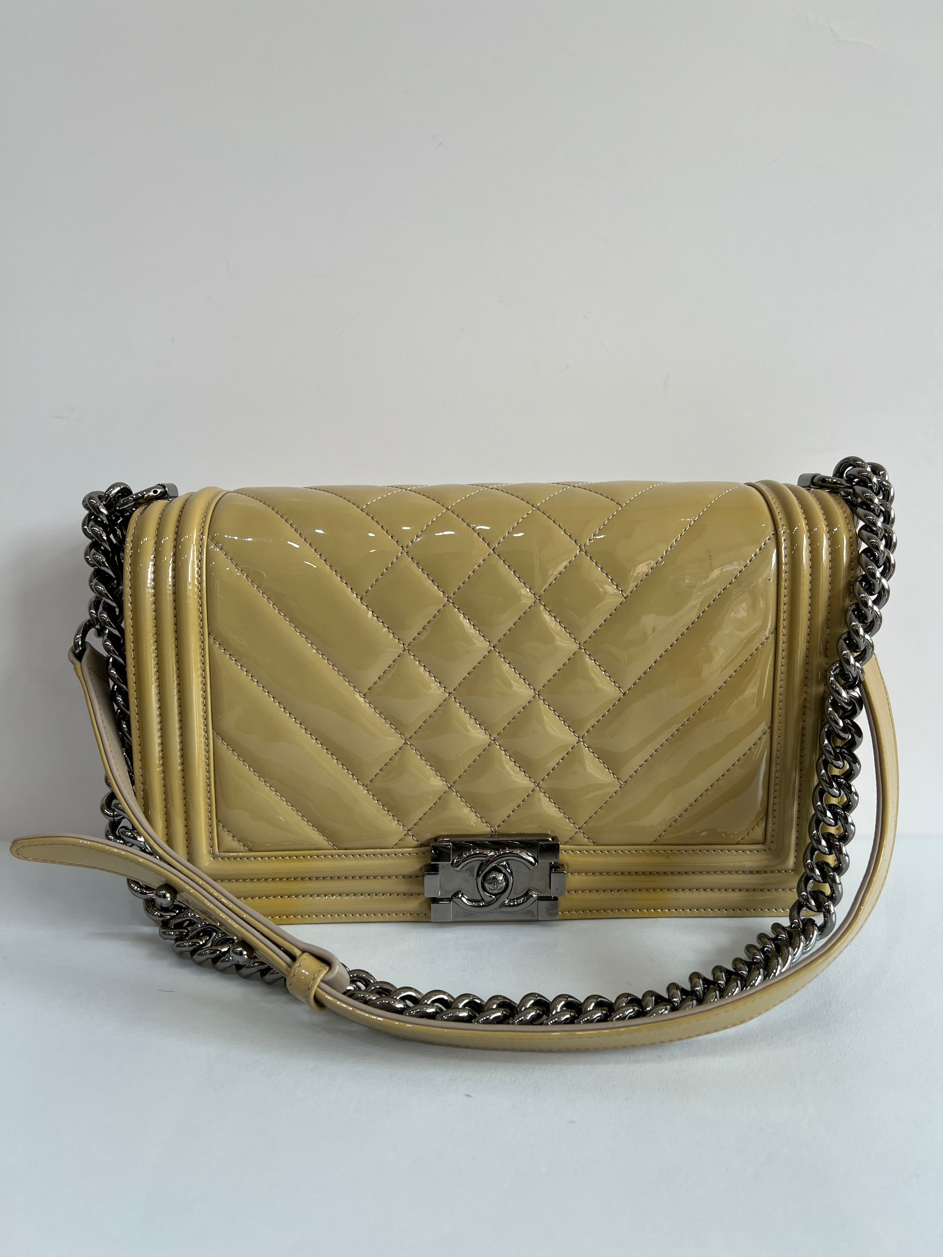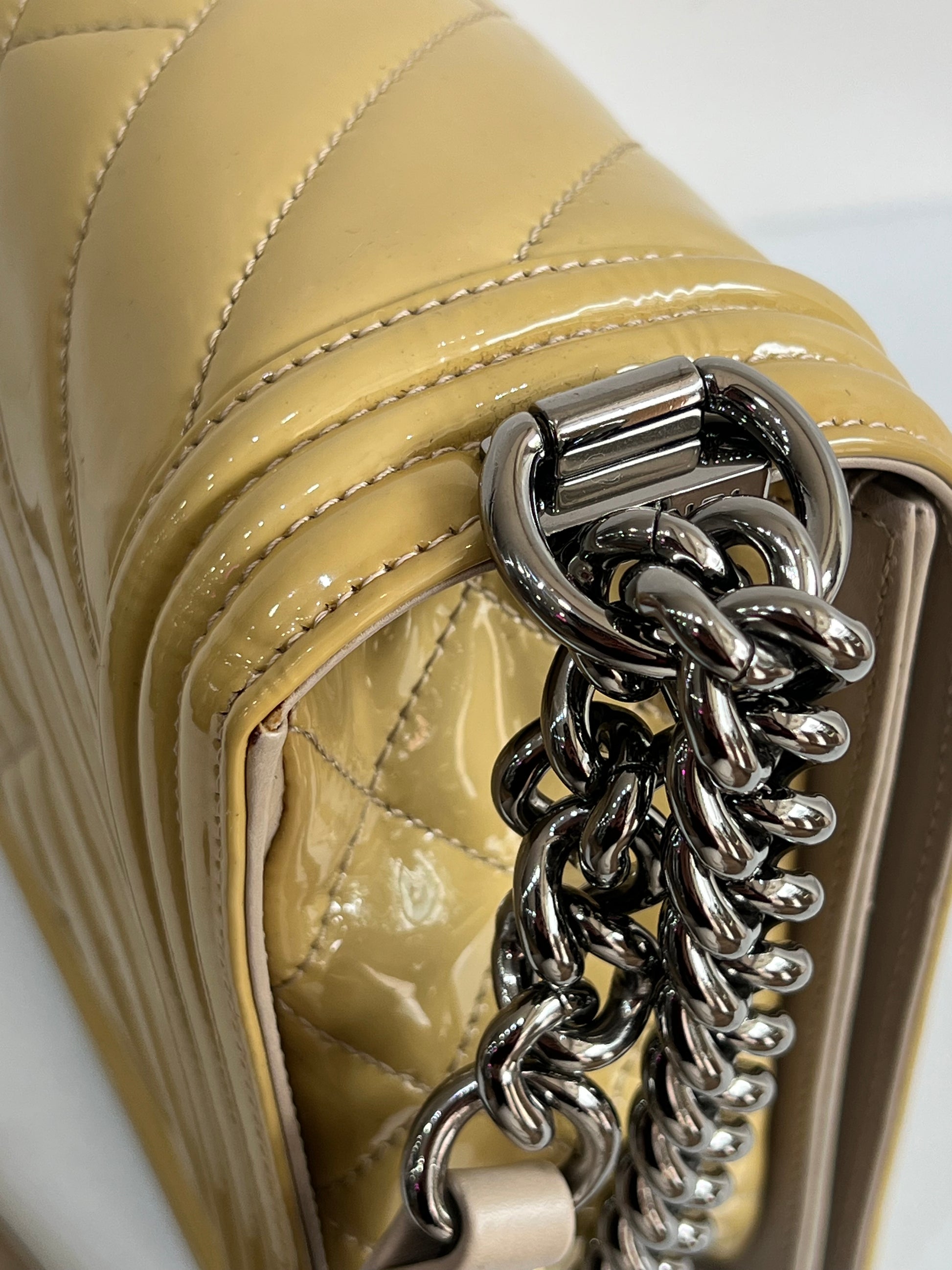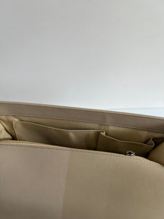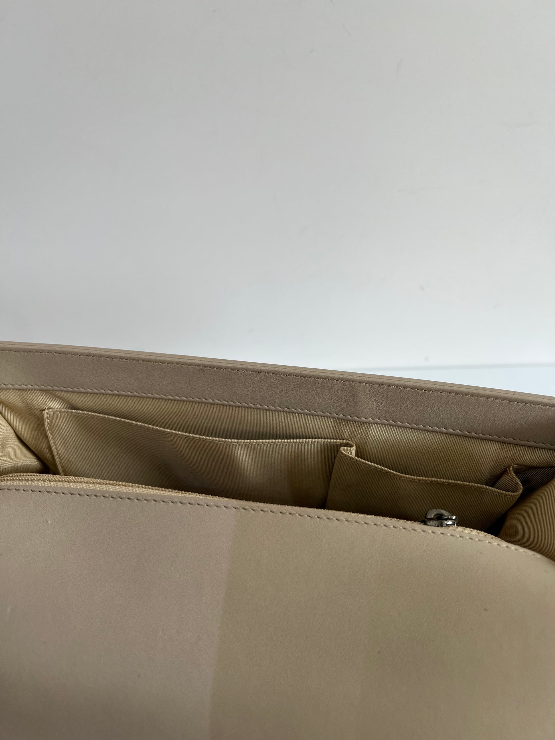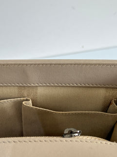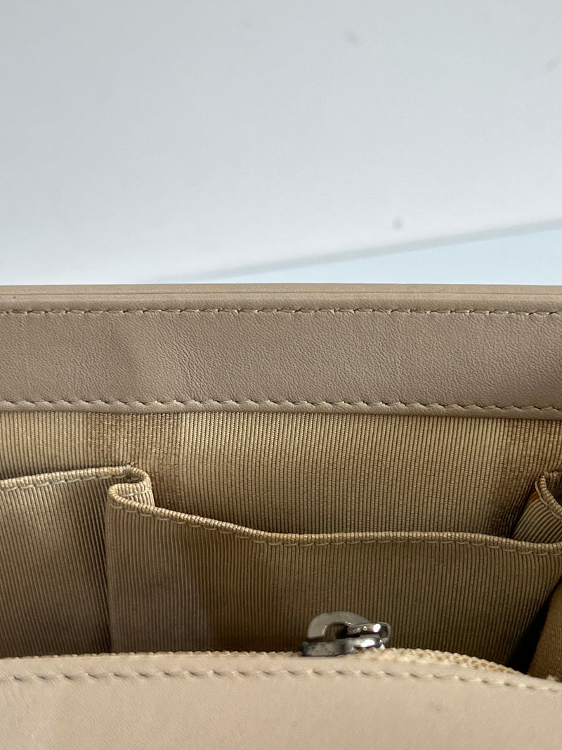 Este bolso cuenta se puede usar como crossbody o shoulder bag. Tiene dos compartimentos abiertos dentro mas uno de zipper. Tiene un estilo chevron, resaltado con herraje plateado. Este bolso forma parte de la linea clásica de chanel y el estilo de costura es edición limitada, año 2014. Actualmente en tienda cuesta mas de $7000 usd.