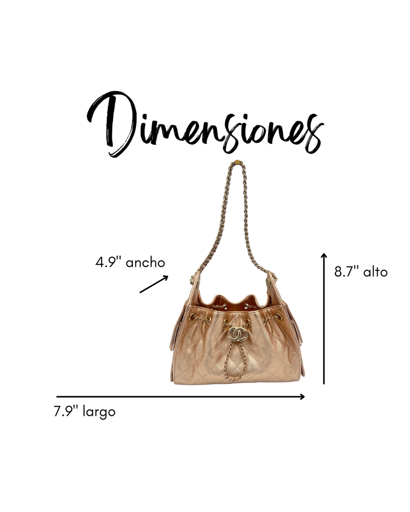 Bolso compacta tipo hobo, elaborada en un acabado metálico rose gold. Su estructura combina suavidad con firmeza , e incluye el distintivo cierre con logotipo al frente como punto focal. Cuenta con una correa de cadena entrelazada con cuero que permite llevarlo al hombro, y un interior diseñado para lo esencial.