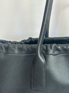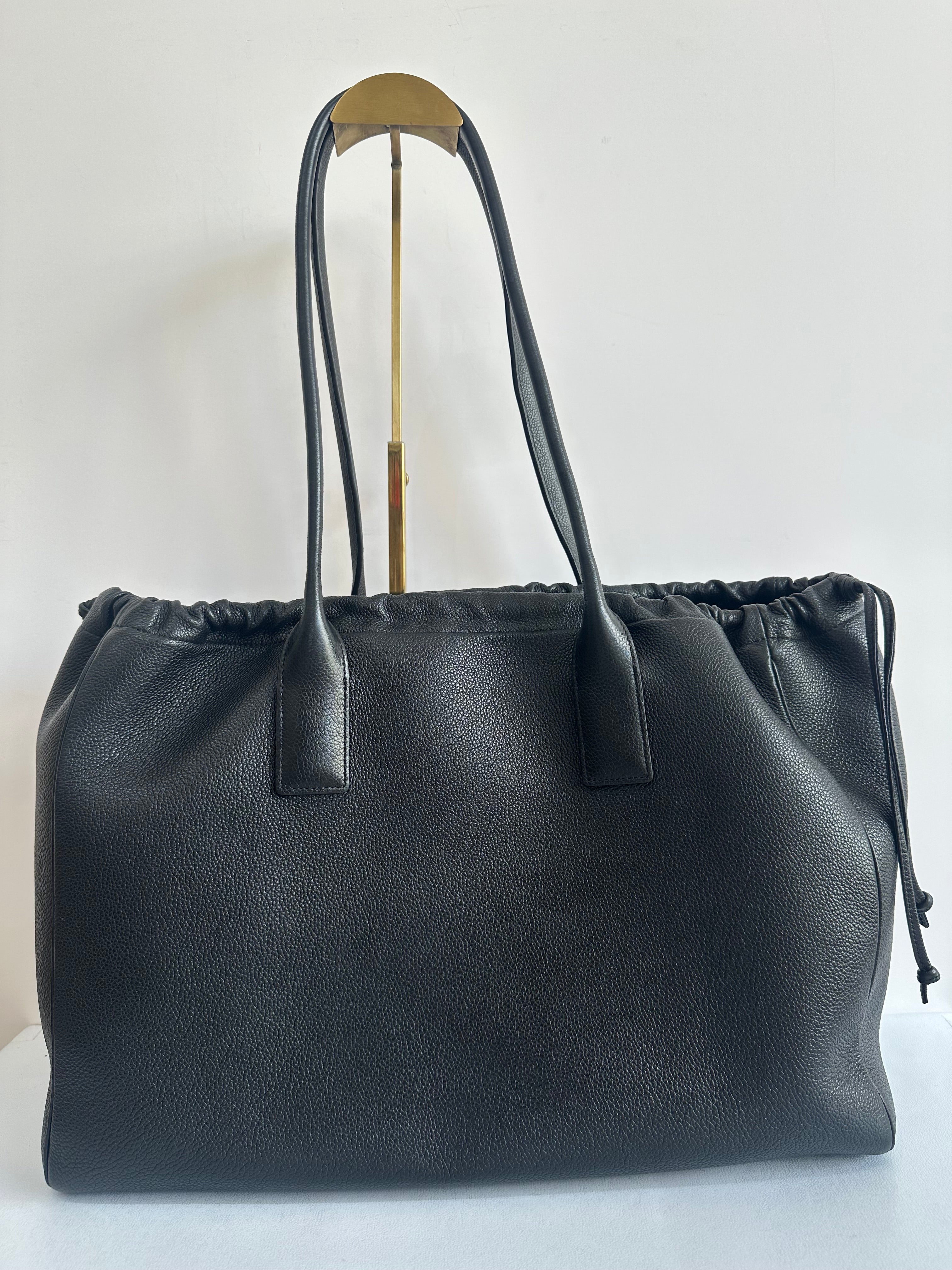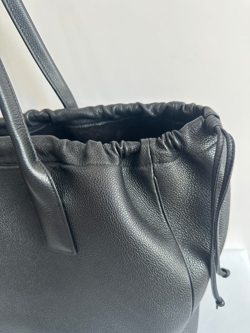 Bolso tote en piel de becerro suave, con asas de cuero, cierre superior con cordón y forro interior de gamuza con bolsillo plano.