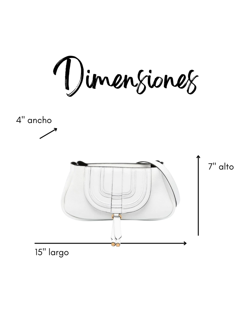 Cartera de cuero blanco con textura suave, diseño estructurado con solapa curva y costuras decorativas. Detalles en dorado y tiras colgantes.