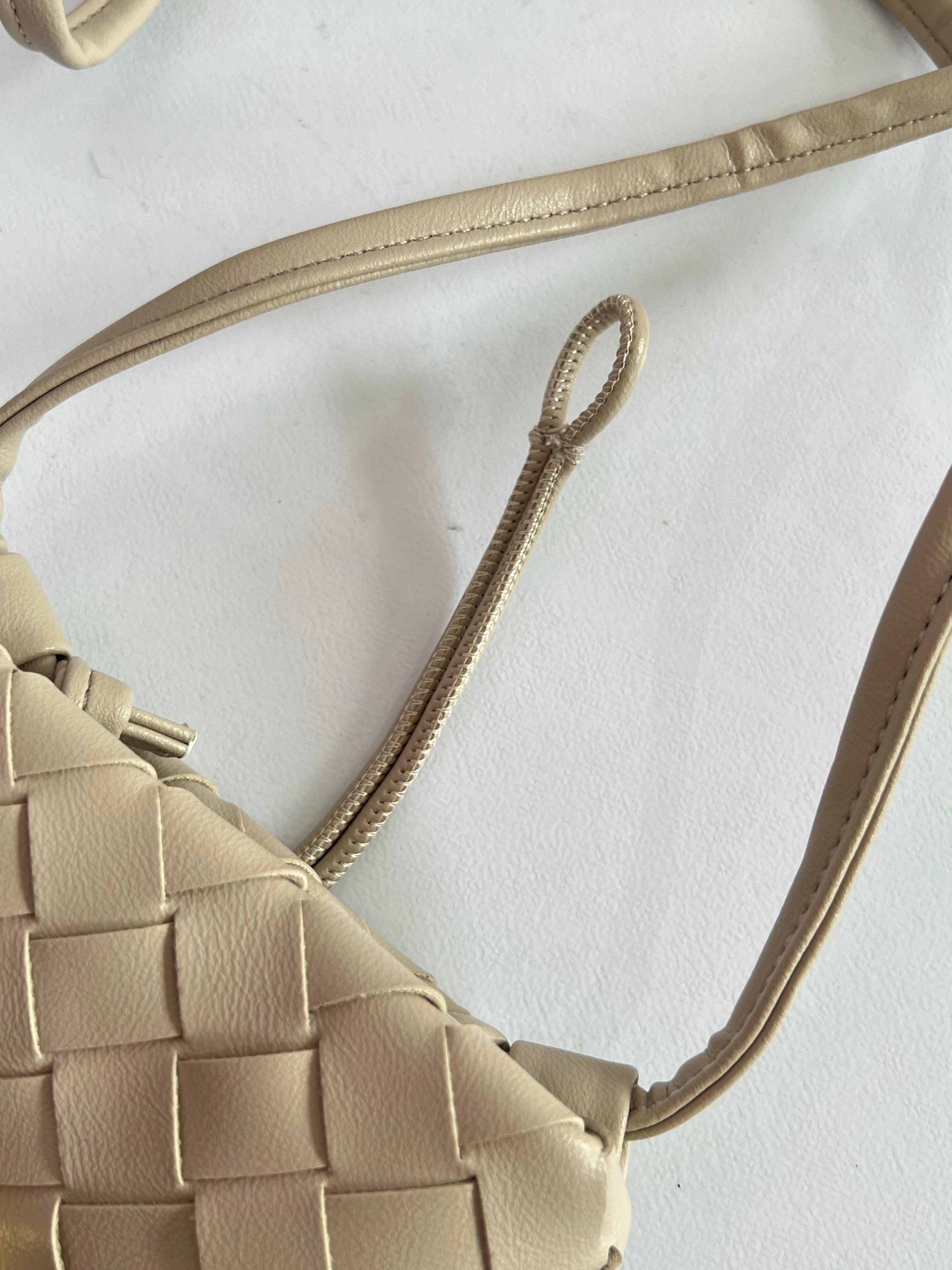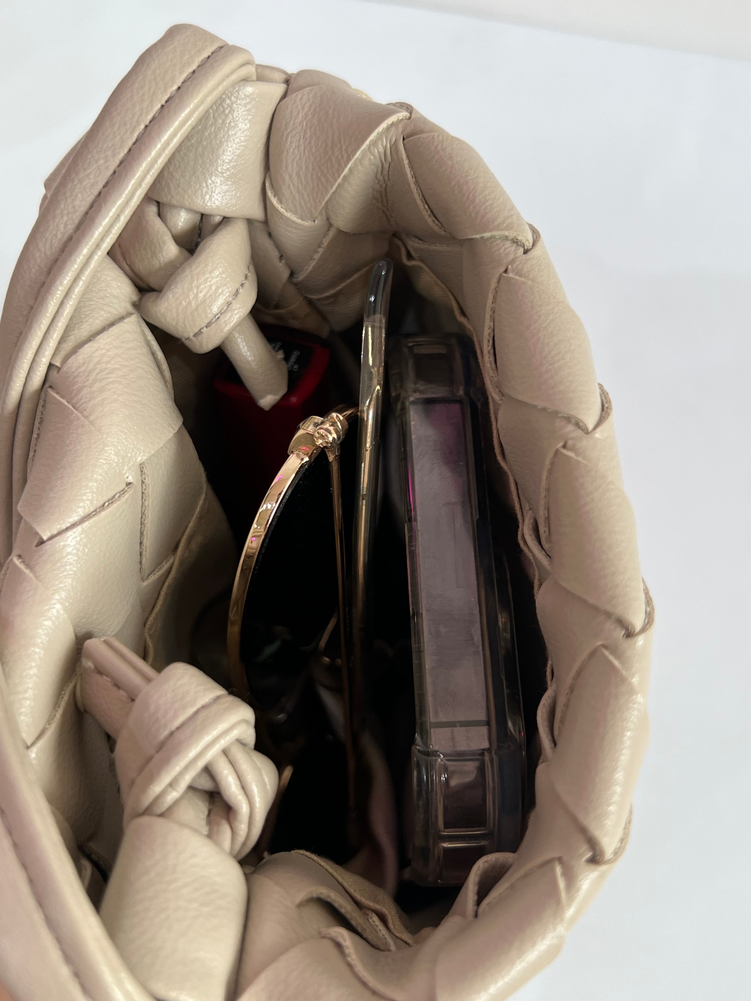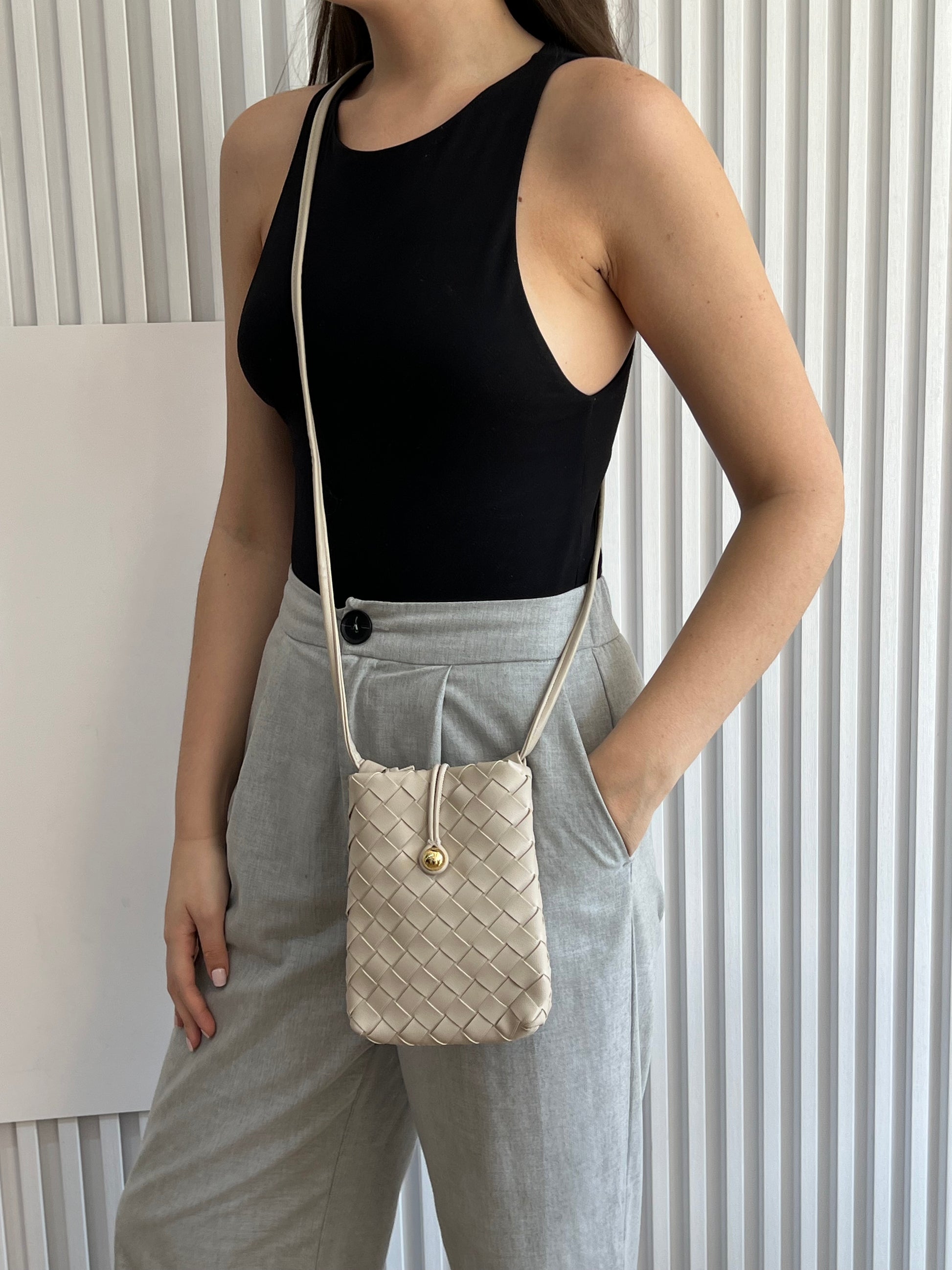 Bolso estilo bucket en formato mini, con cierre tipo cordón con correa larga. Cabe perfectamente un celular pro max.