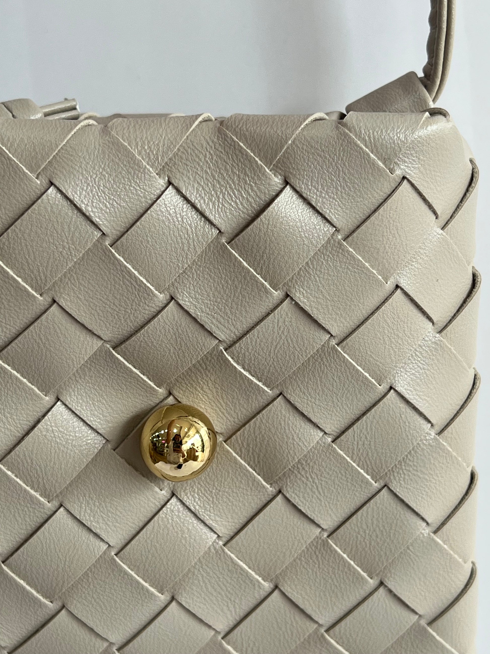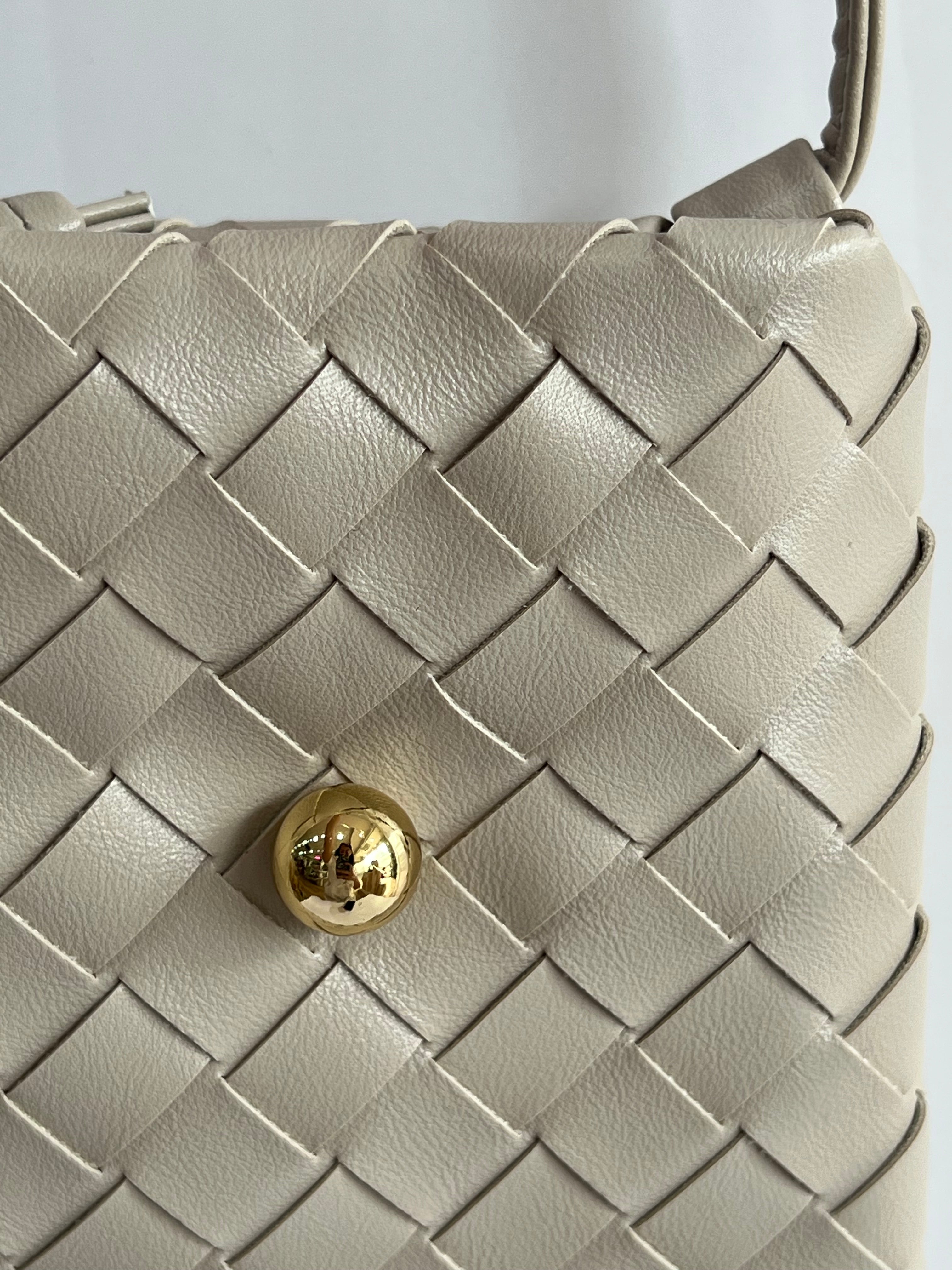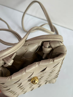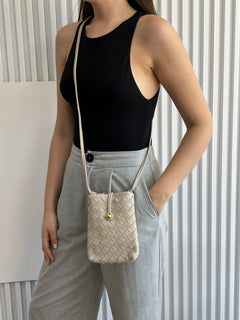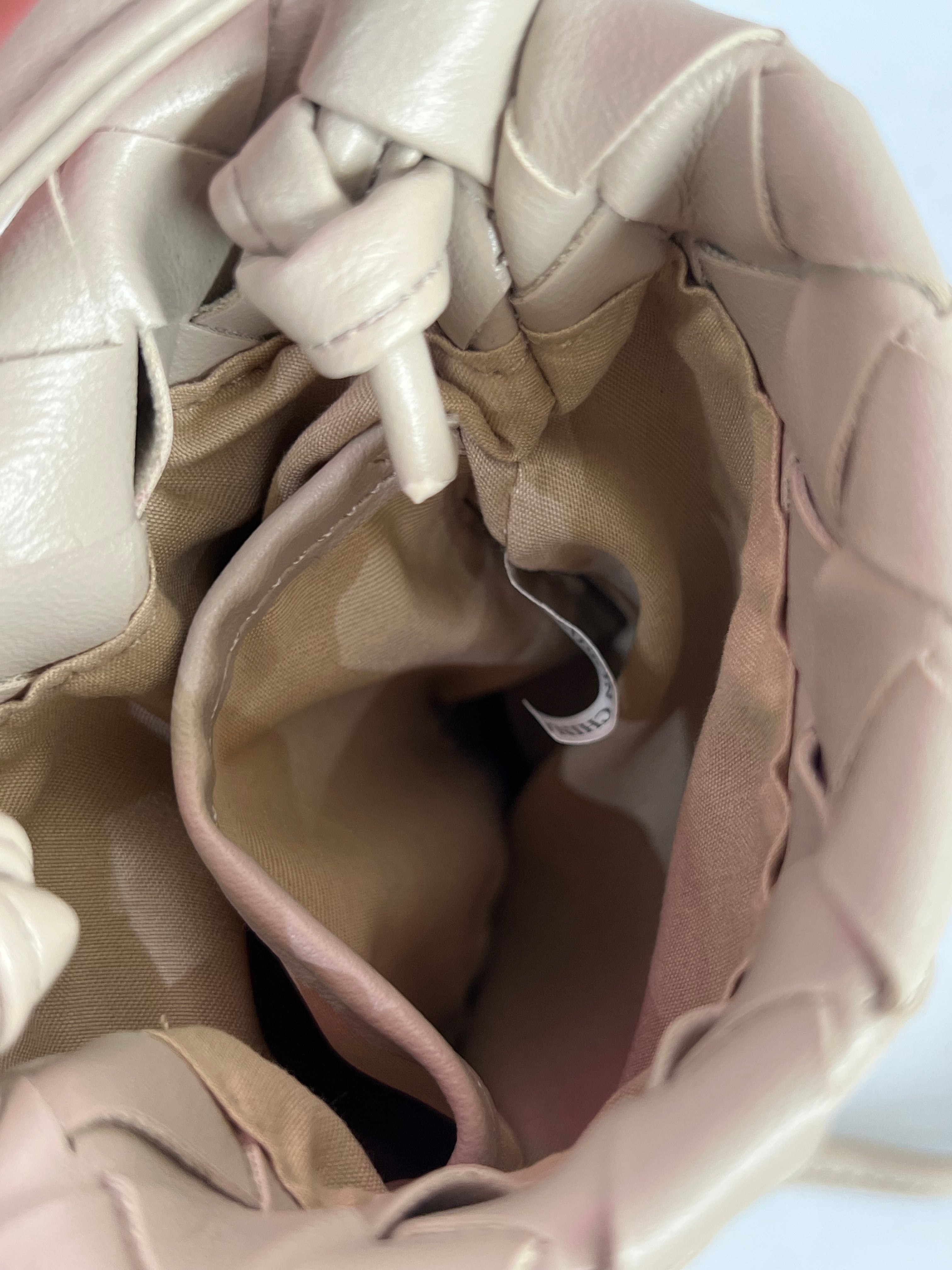 Bolso estilo bucket en formato mini, con cierre tipo cordón con correa larga. Cabe perfectamente un celular pro max.