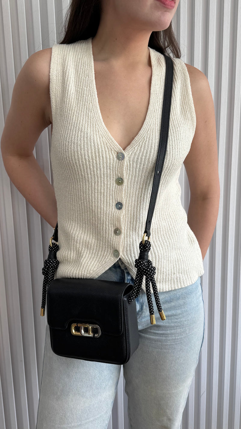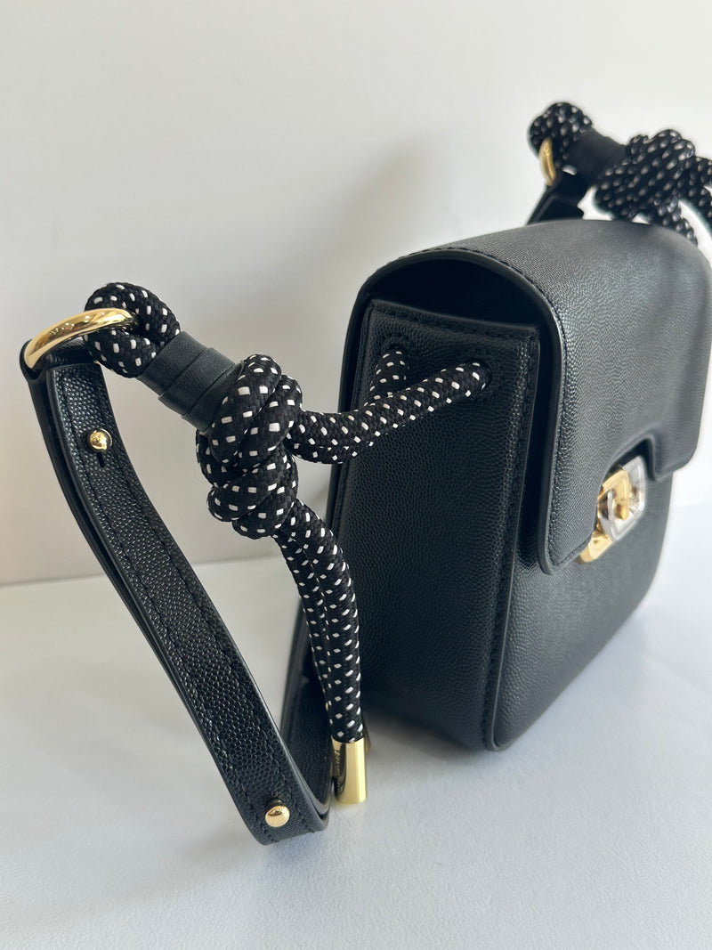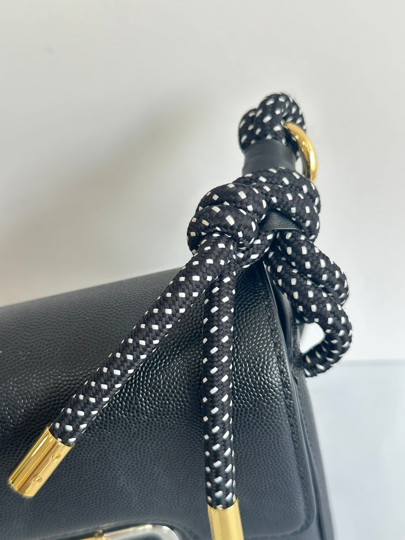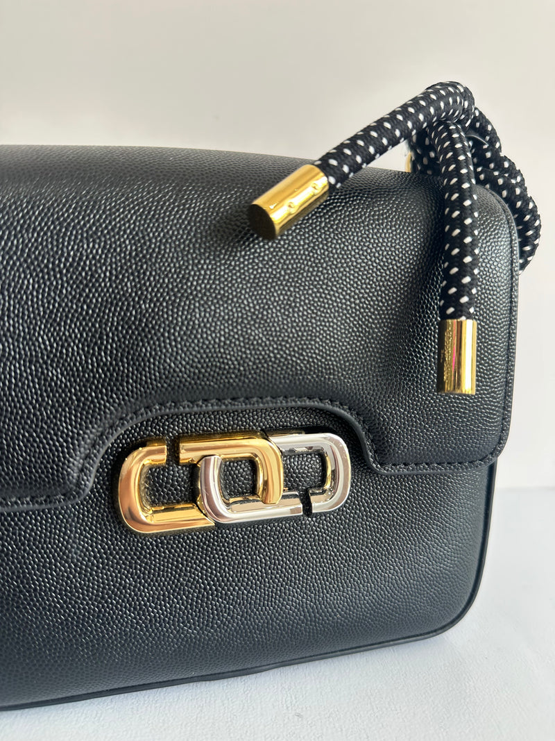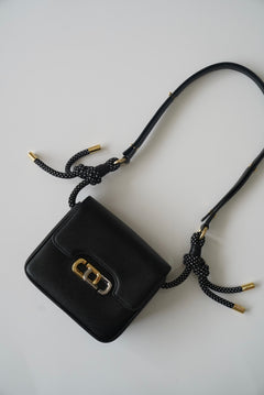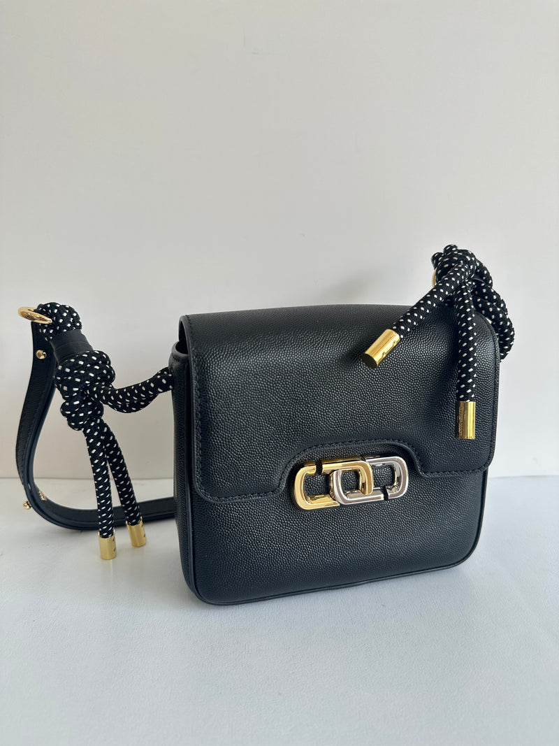 Bolso de hombro elaborado en cuero texturizado con cierre metálico doble “J” en el frente, correa tipo cordón anudado y compartimento interior compacto.