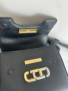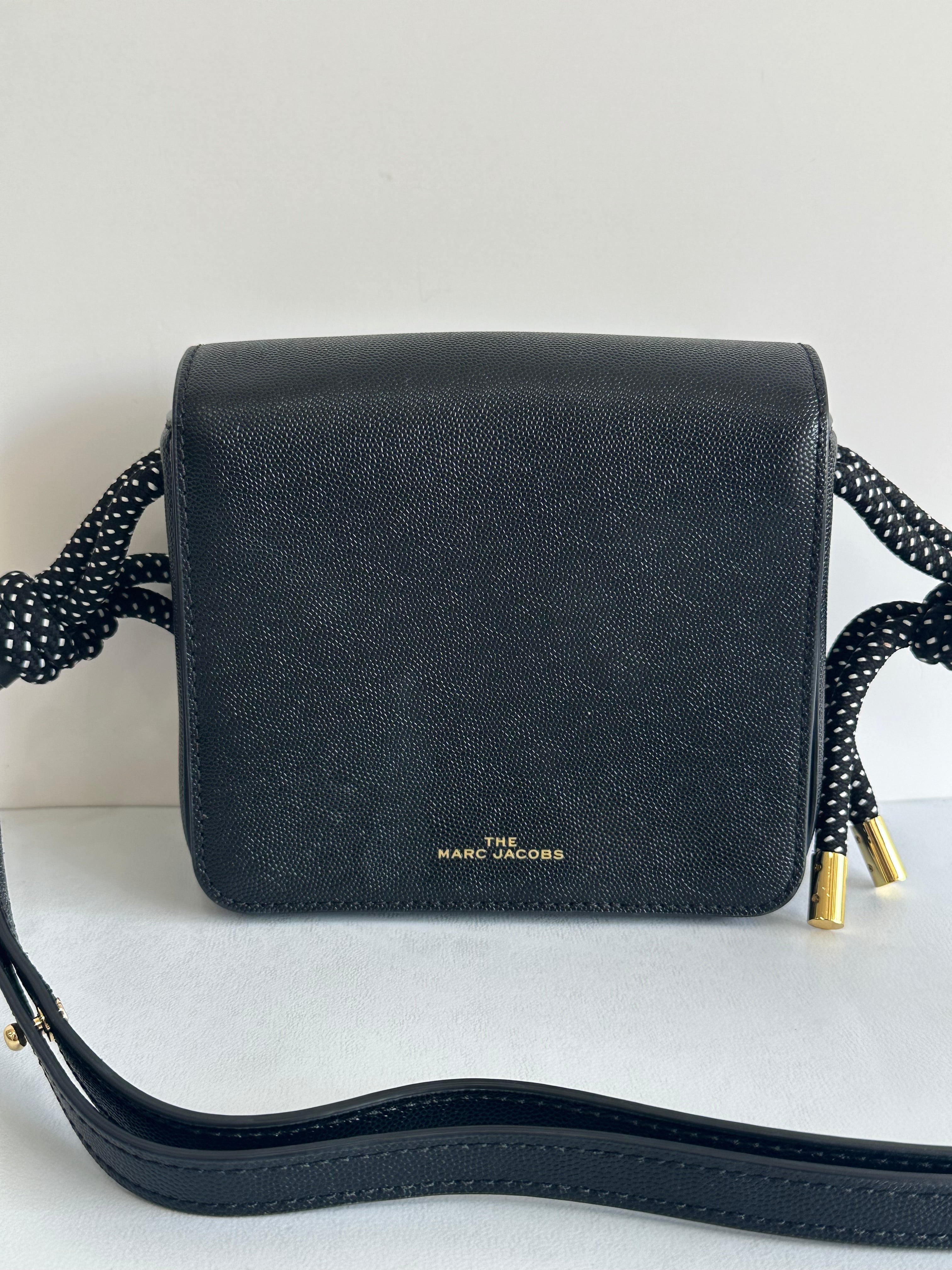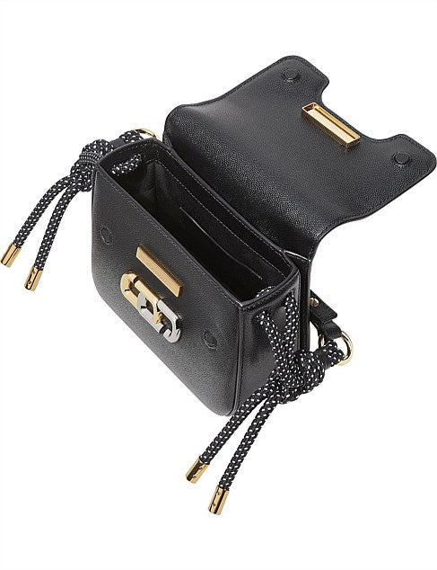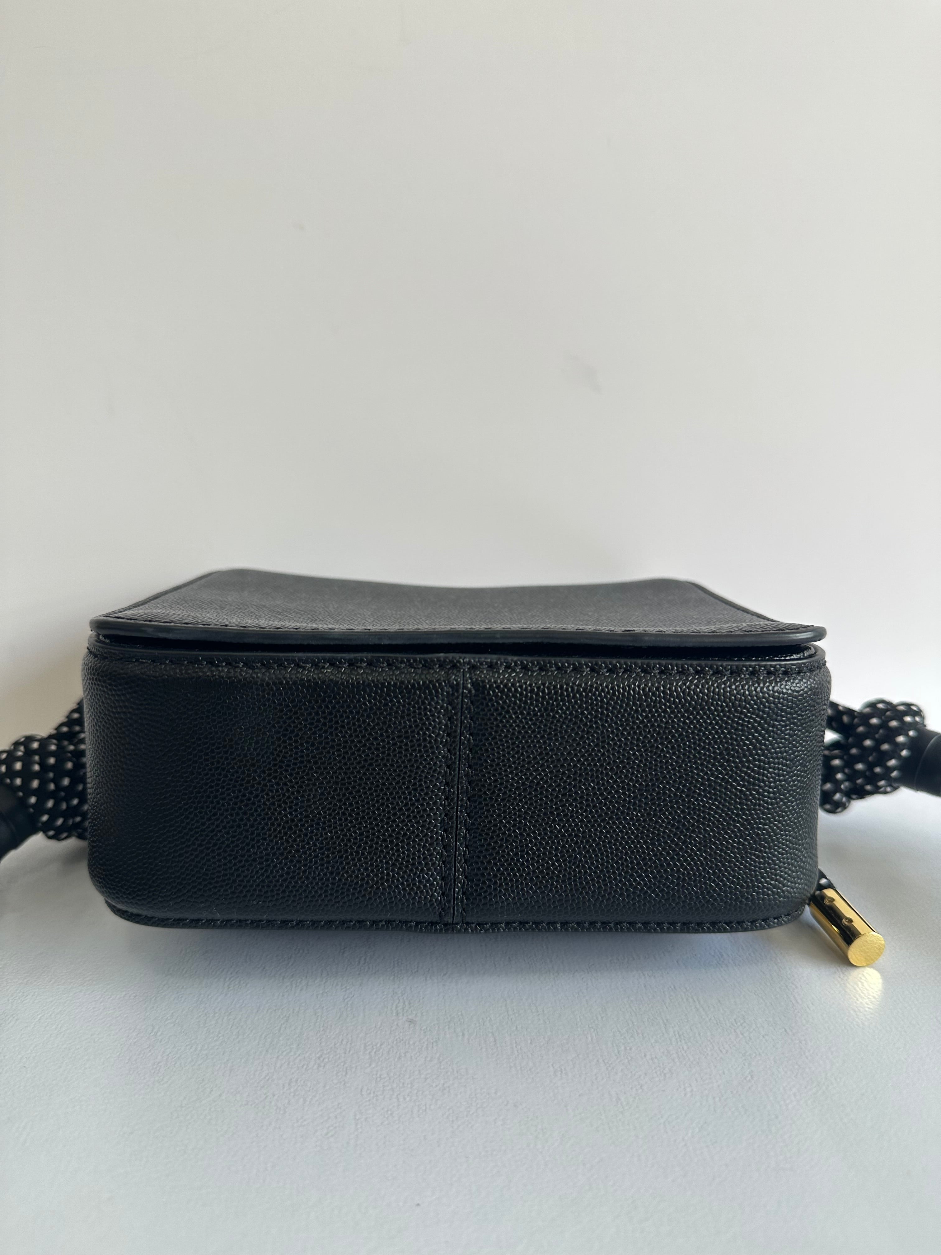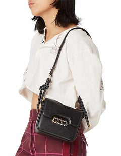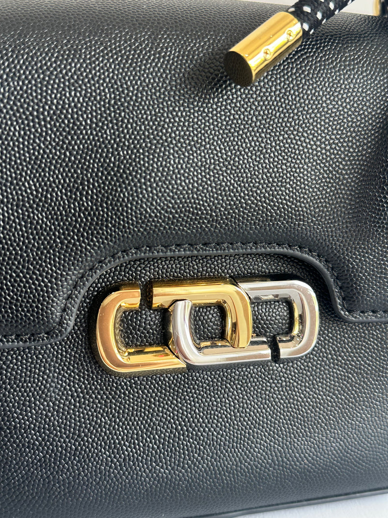 Bolso de hombro elaborado en cuero texturizado con cierre metálico doble “J” en el frente, correa tipo cordón anudado y compartimento interior compacto.