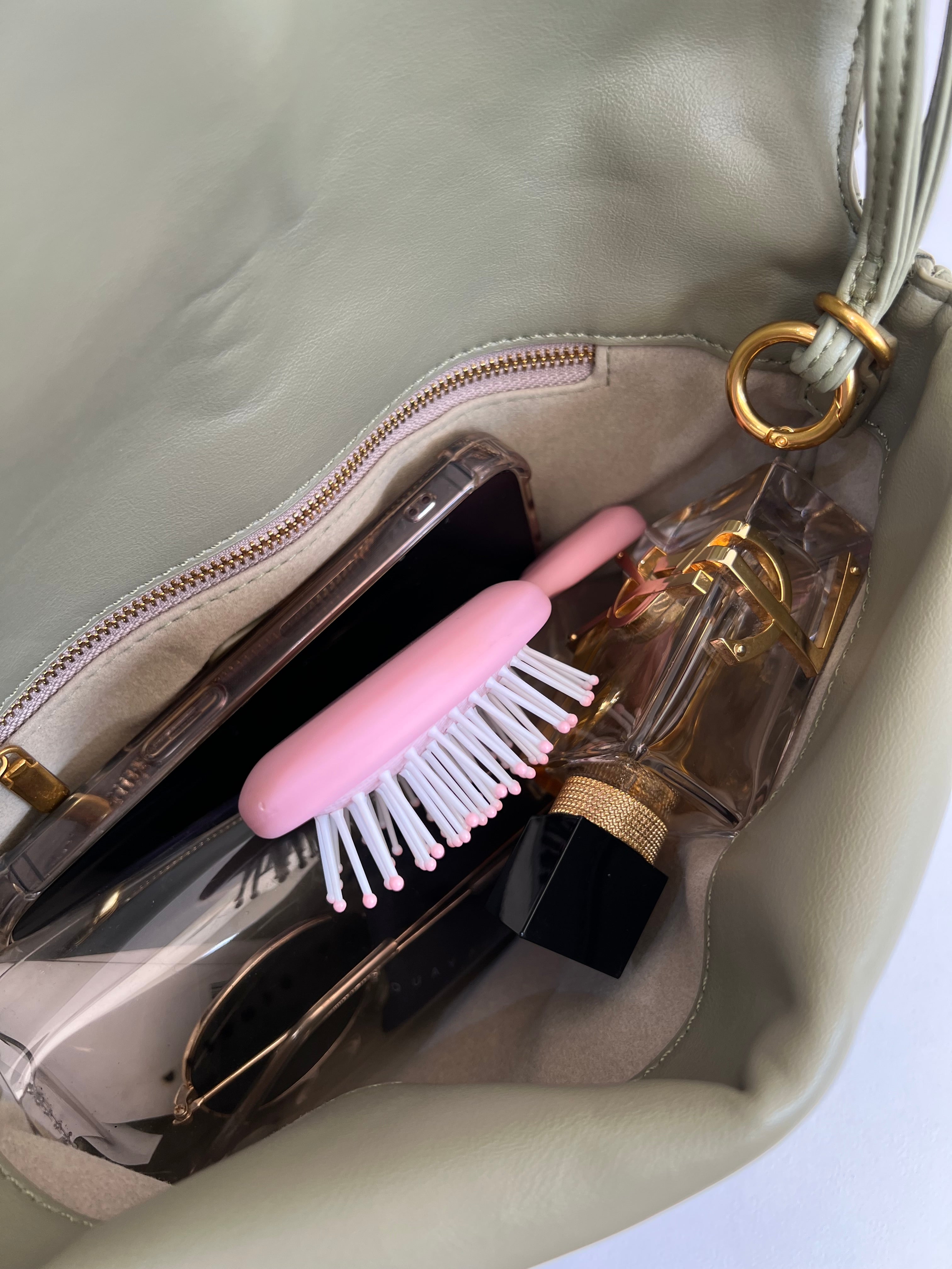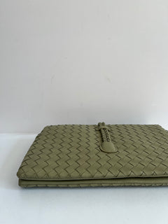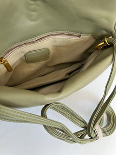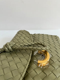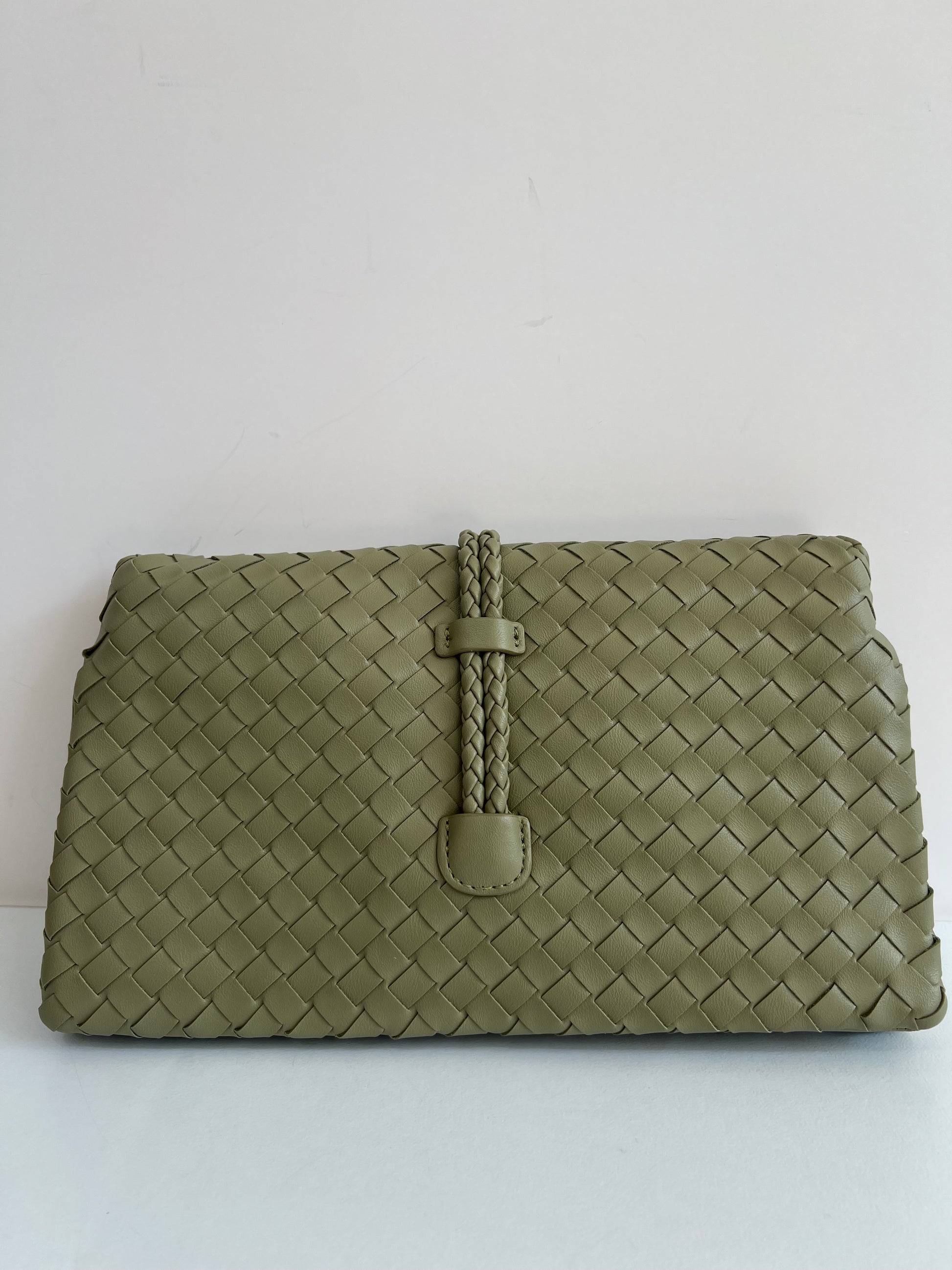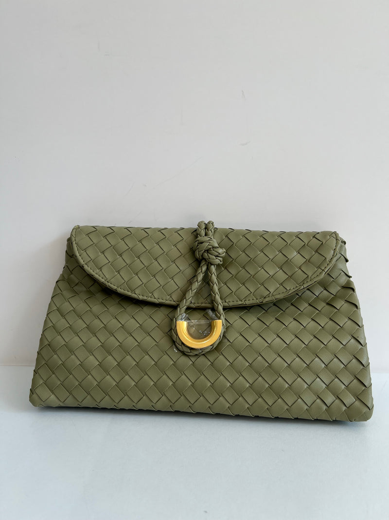 Ess un bolso de mano en tono verde matcha, de diseño compacto, con acabado texturizado de cuero sintetico entrelazado.