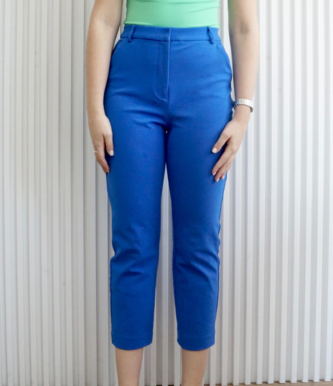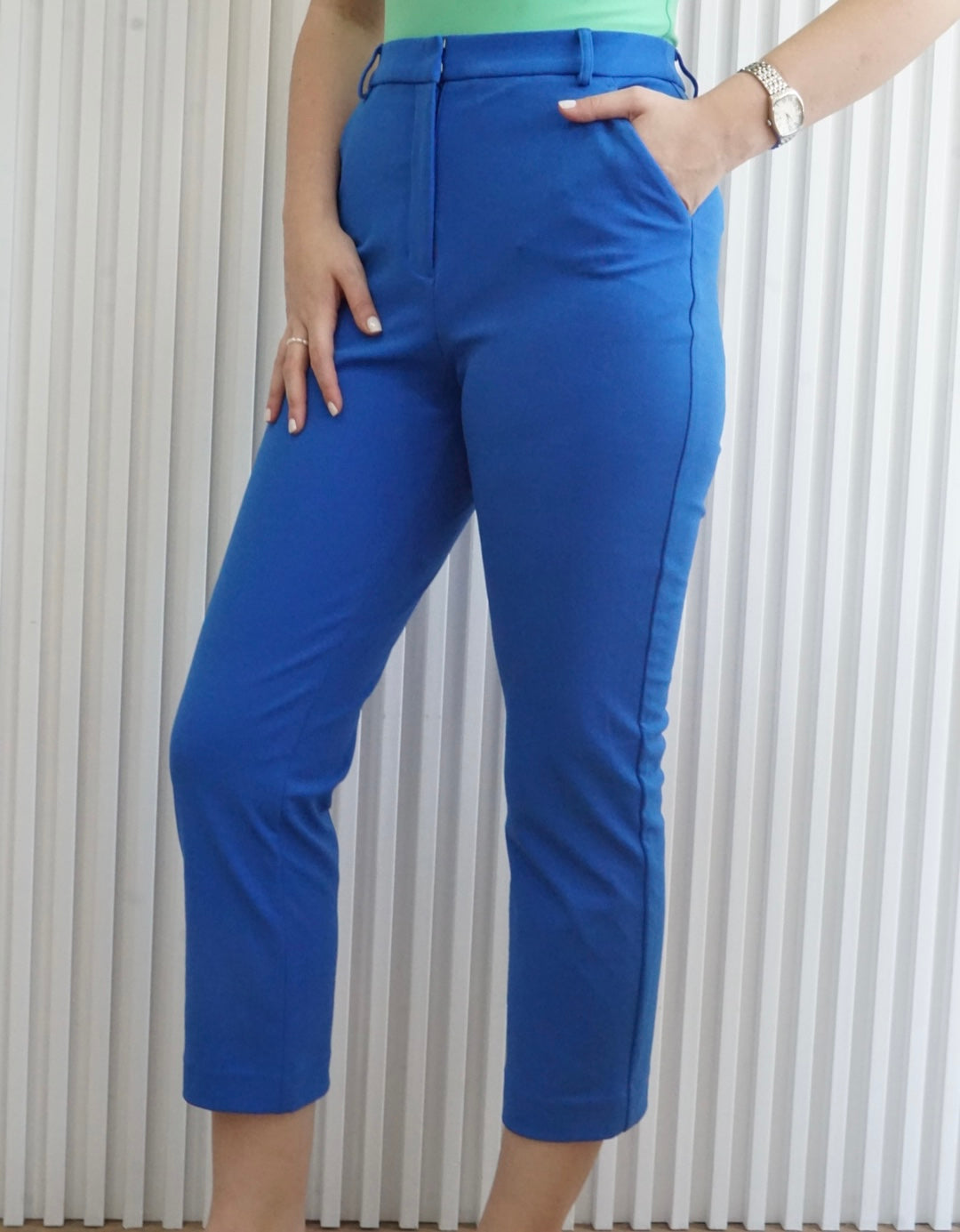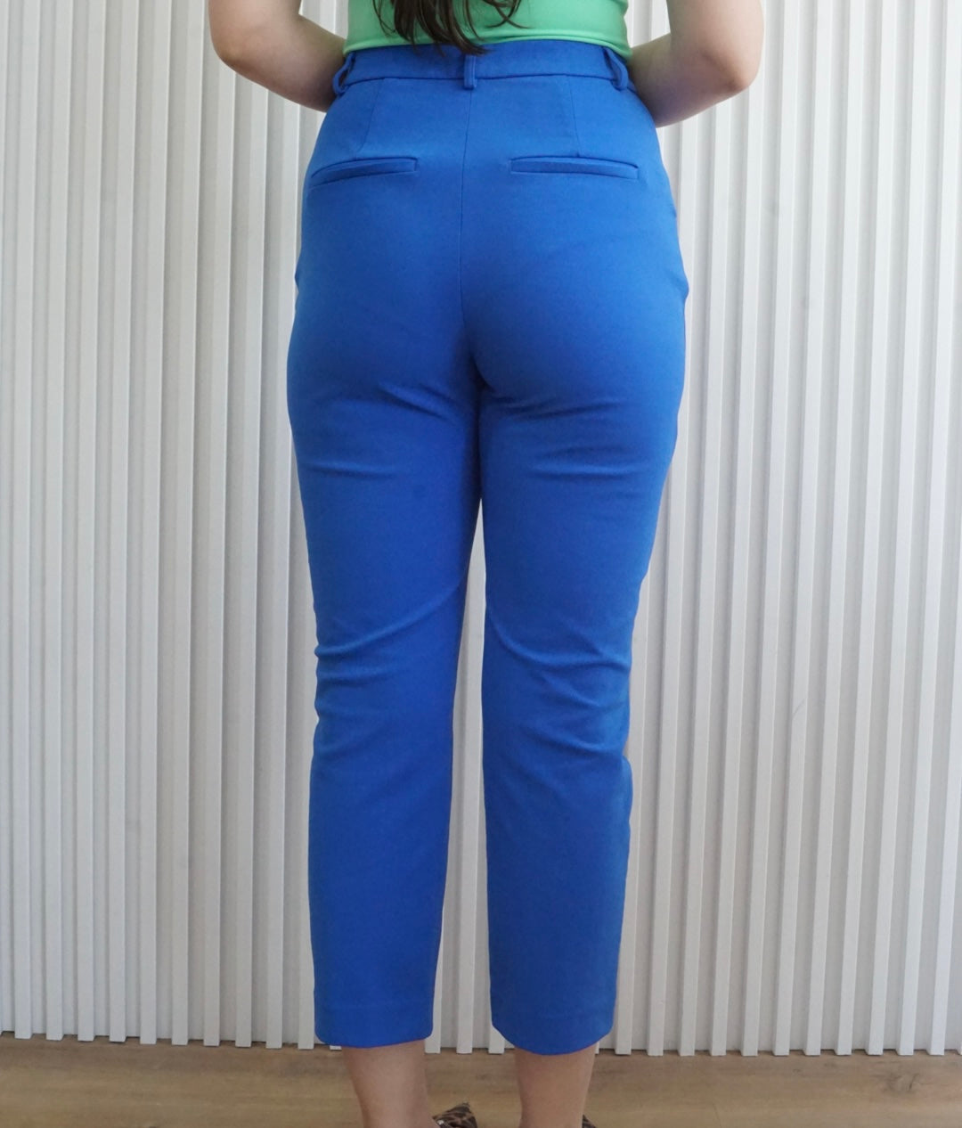 Estos pantalones estilo Cropped son ajustados y se puede utilizar con faja. Cuenta con bolsillos en cada lado y cierre de zipper y gancho.