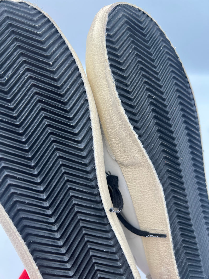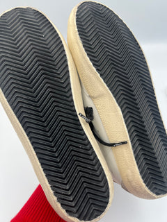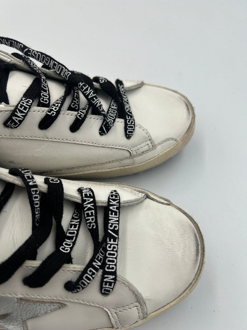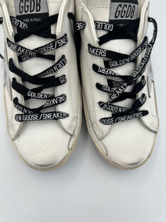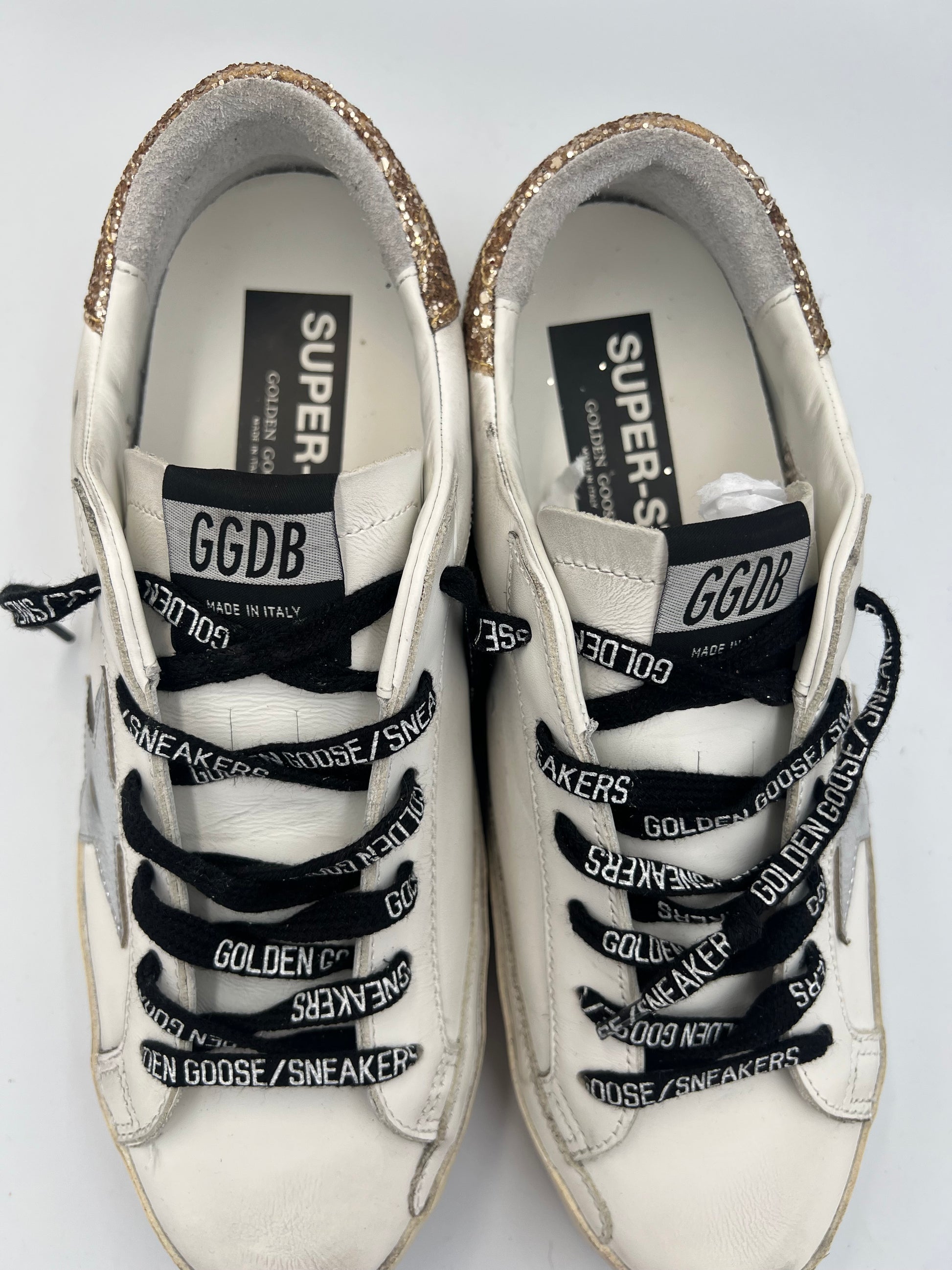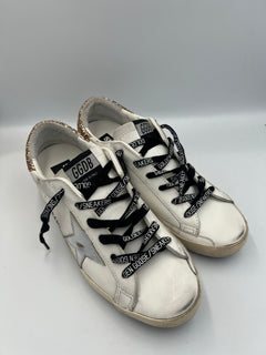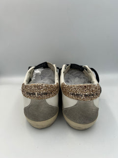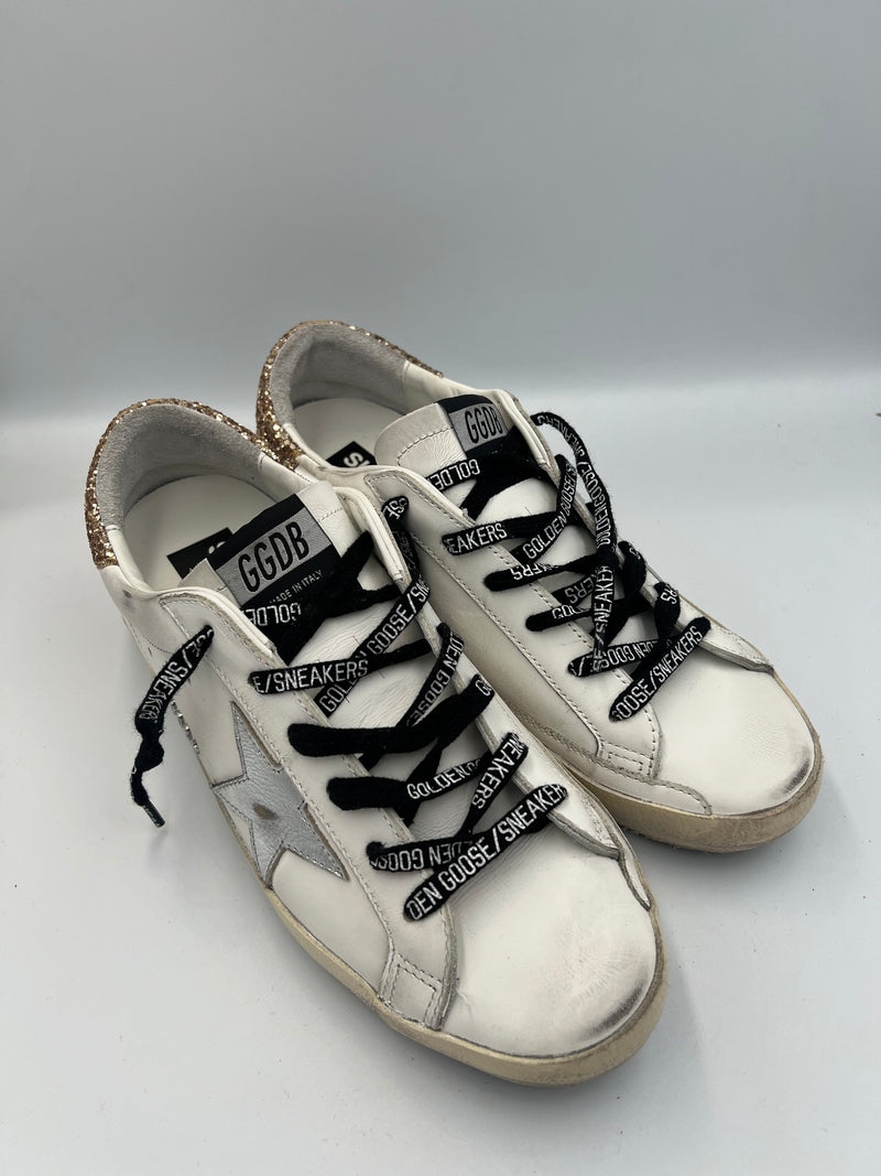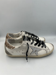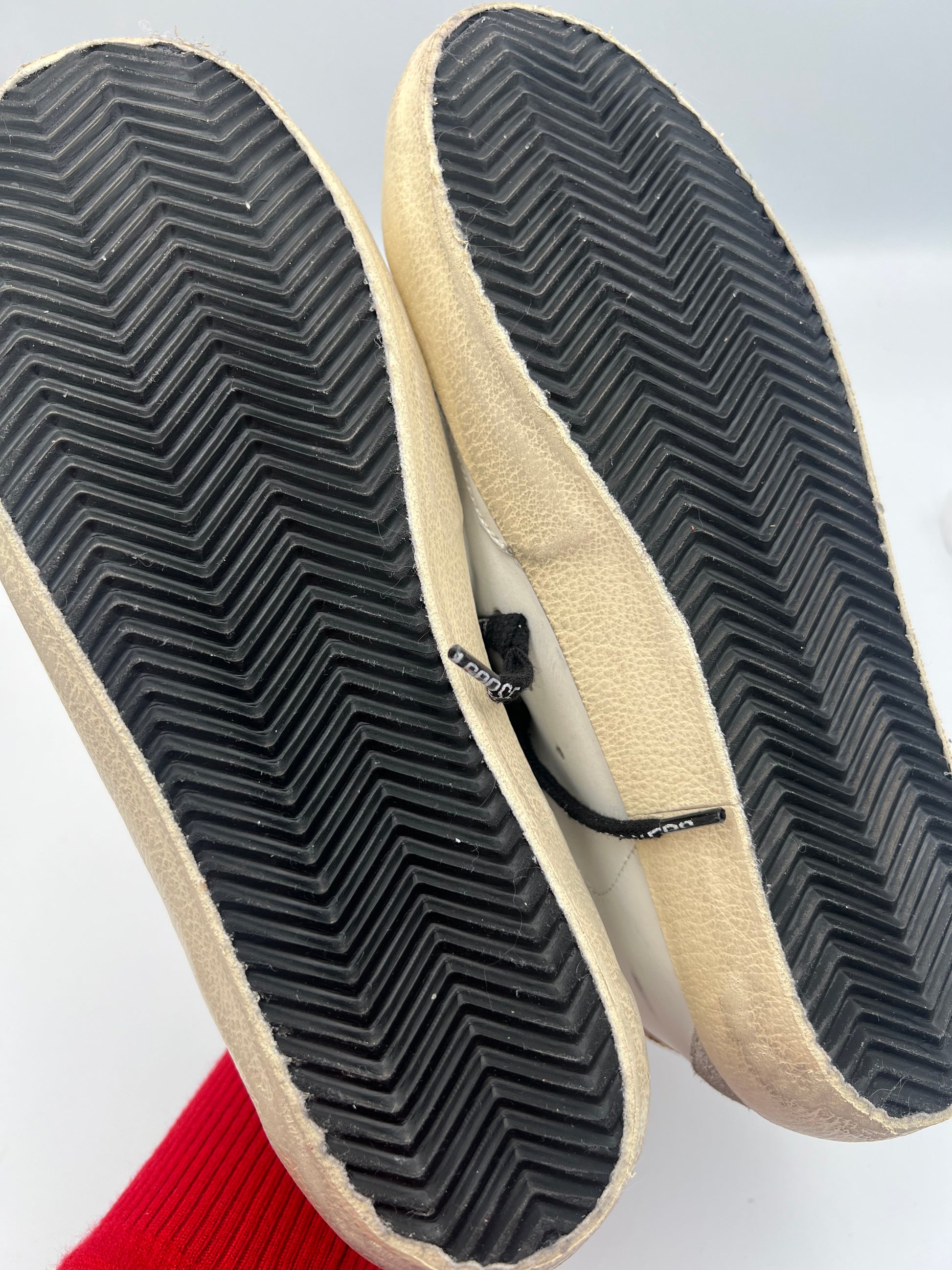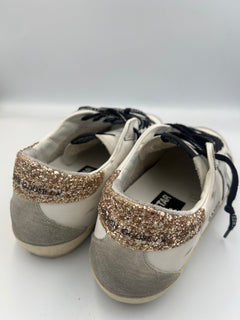 Sneakers confeccionados en cuero blanco con acabado desgastado característico de la marca. Presentan talón con glitter que aporta un toque llamativo, cordones con branding y la icónica estrella lateral. Su diseño combina estilo urbano con detalles distintivos que elevan cualquier look casual.