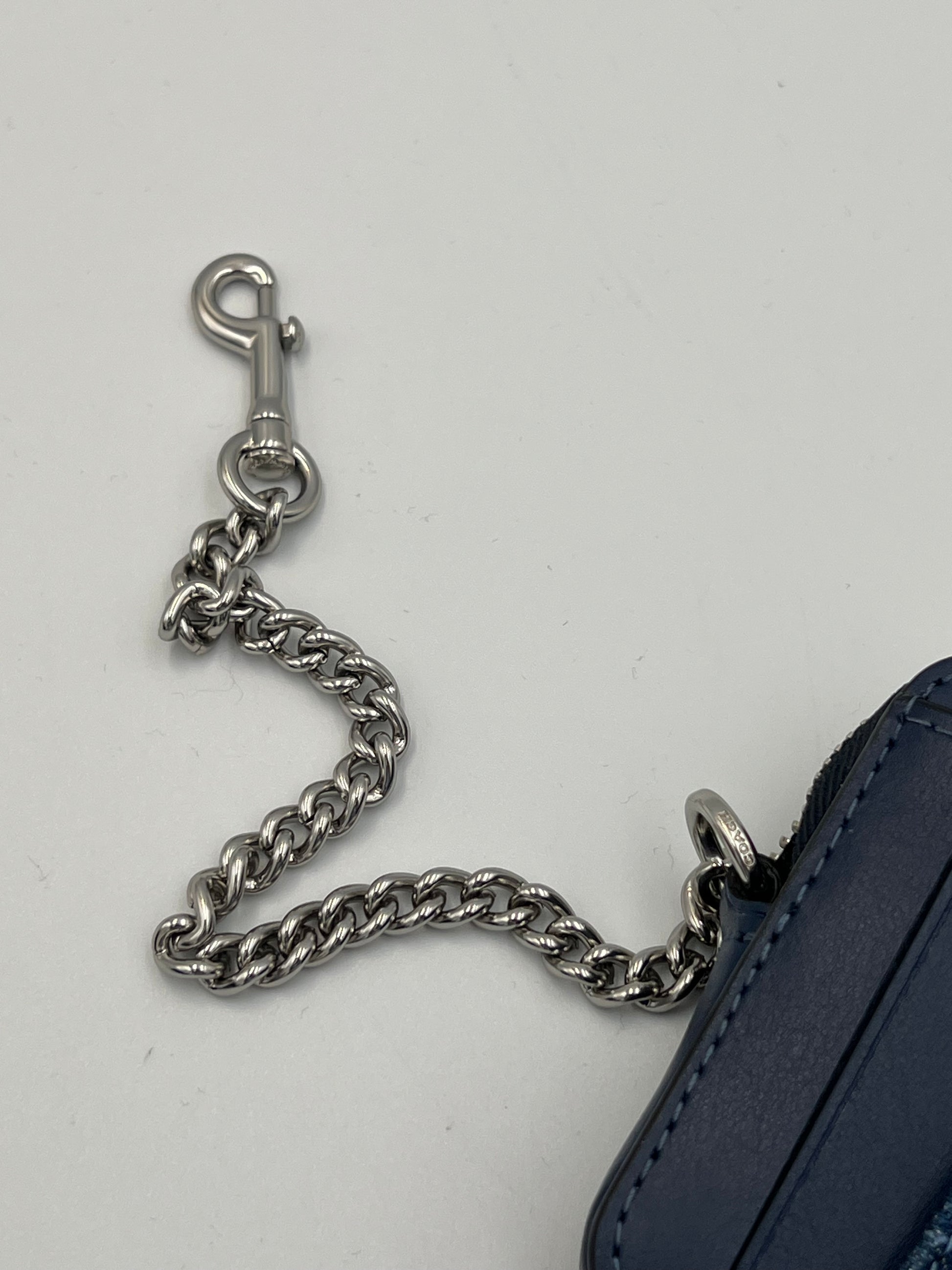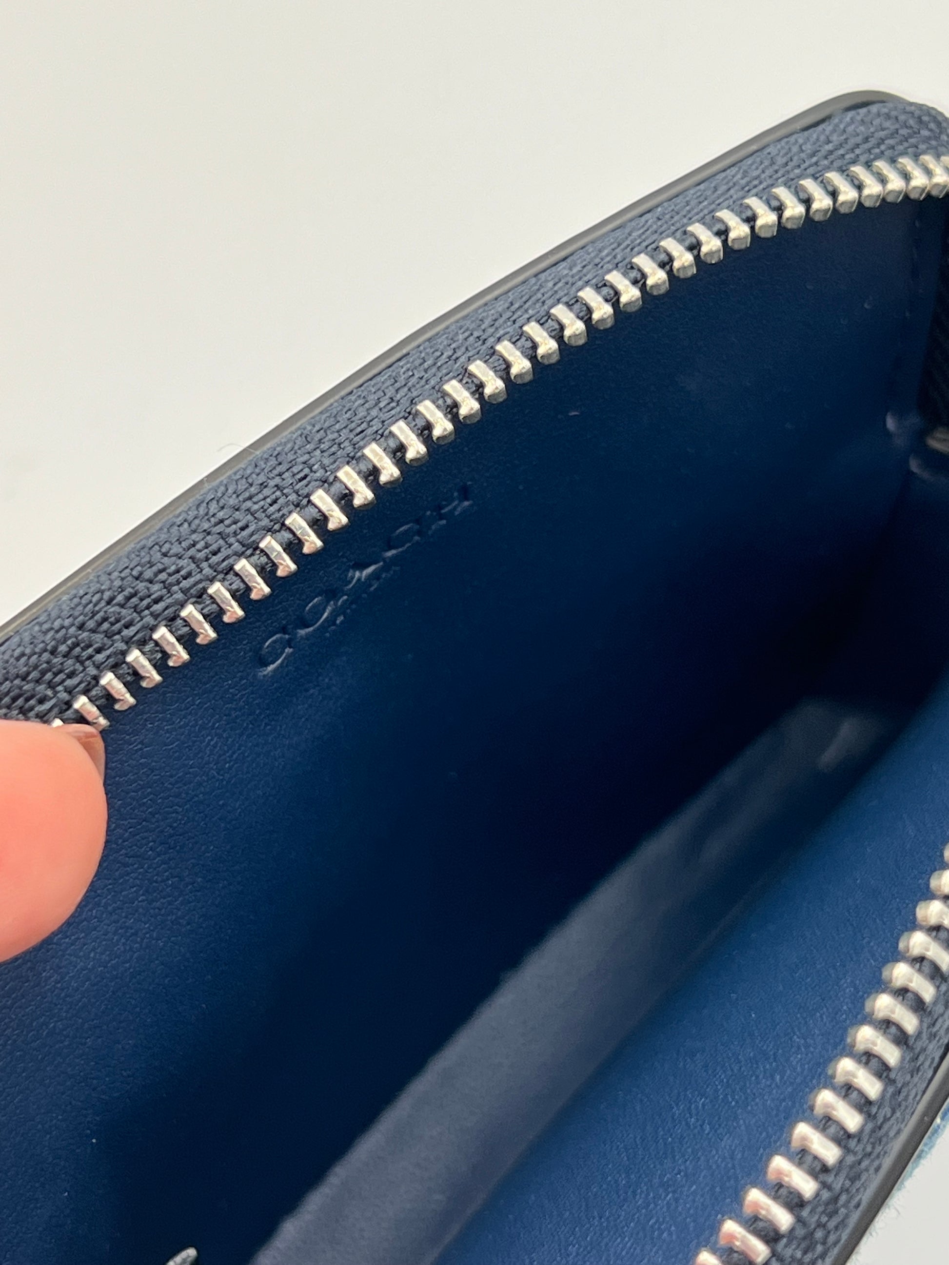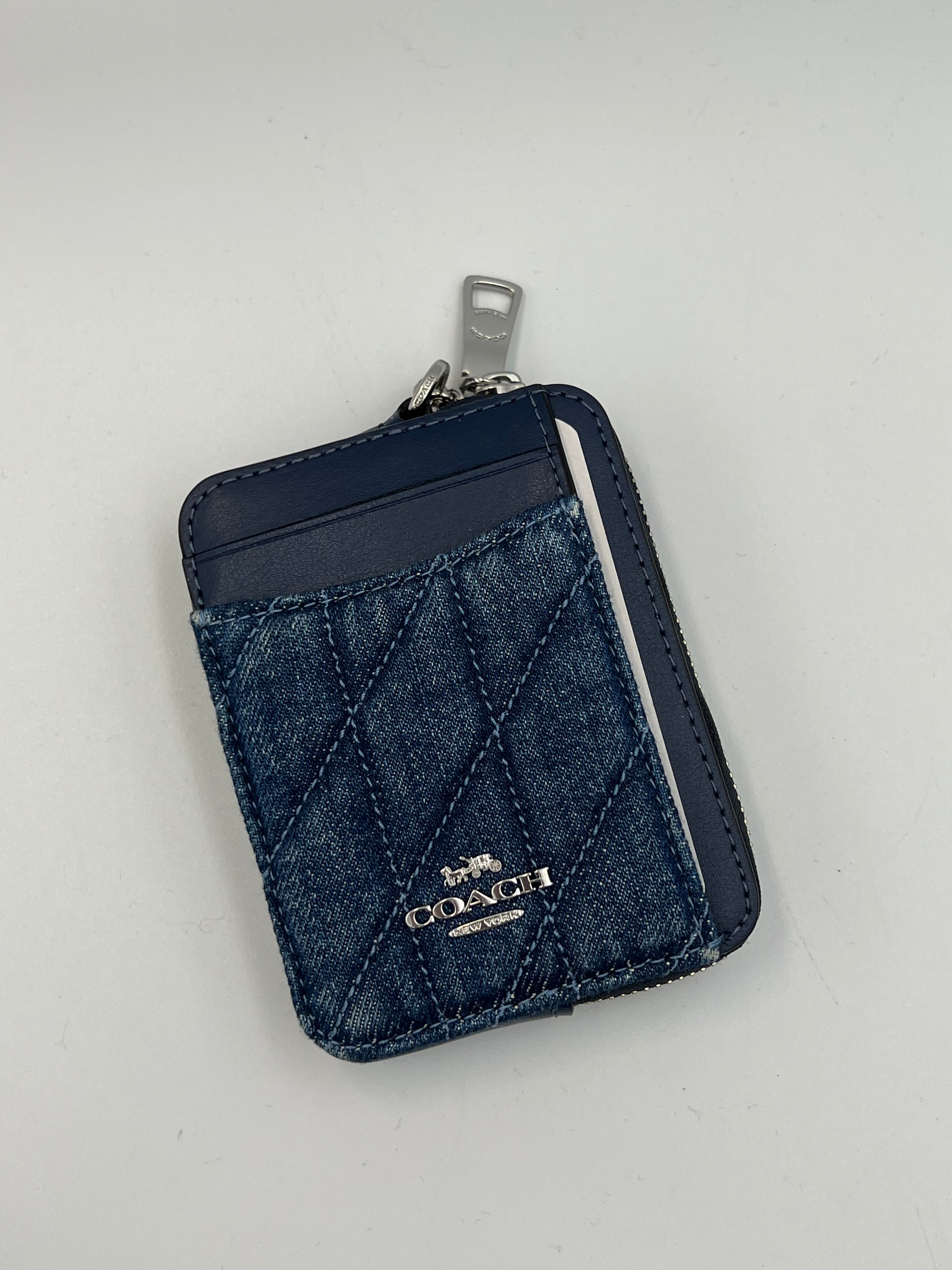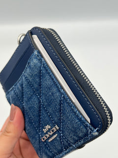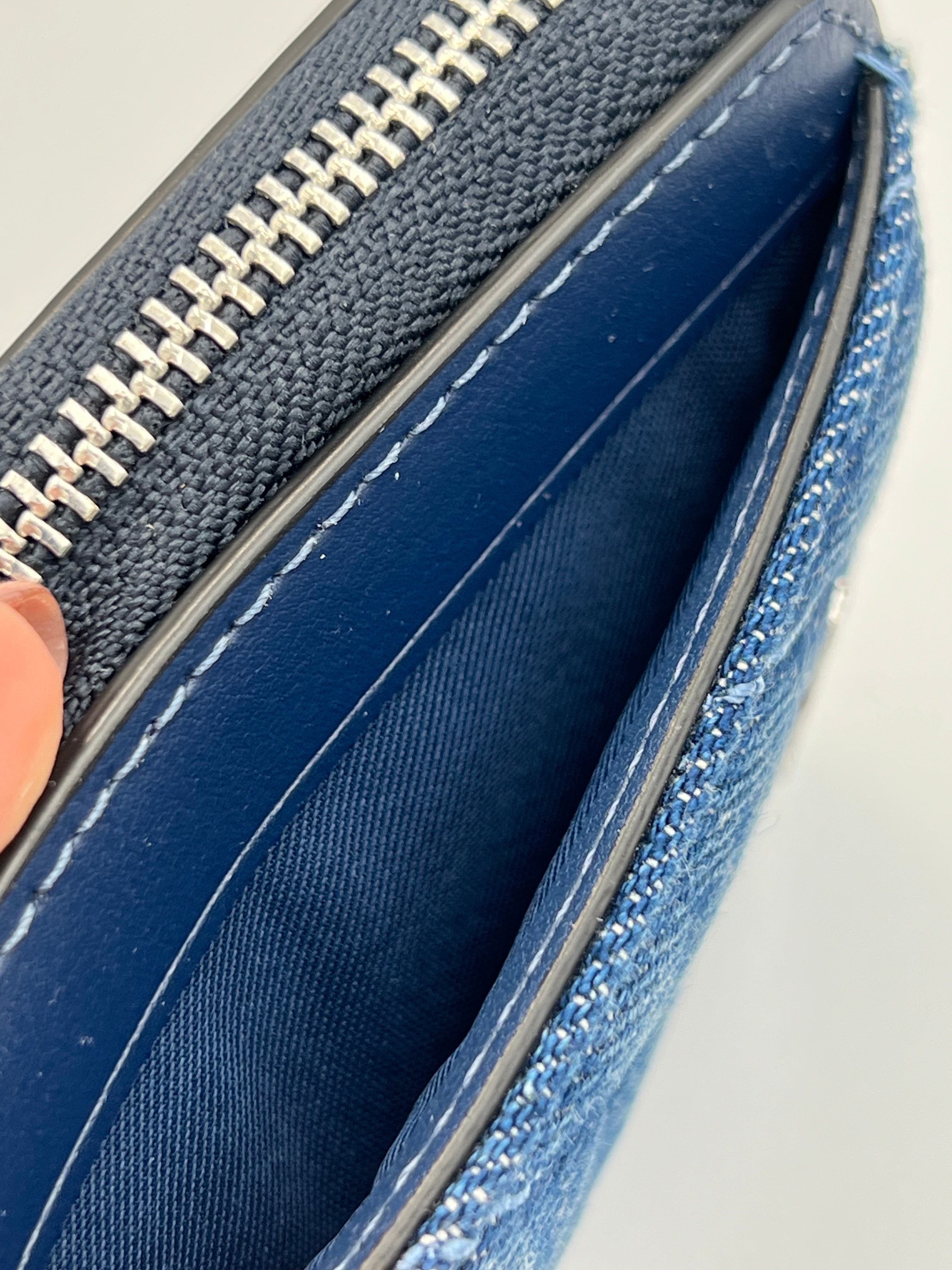 Tarjetero compacto con cierre de cremallera alrededor, hecho con denim acolchado y detalles en cuero (nappa leather) en el exterior. En el interior tiene varios compartimentos abiertos organizados, dos ranuras principales para tarjetas, tres compartimentos tipo gusset y espacio para billetes o recibos pequeños, ayudándote a mantener tus esenciales bien organizados y seguros dentro del cierre zip-around. Cuenta con una pequeña cadena para colgar.