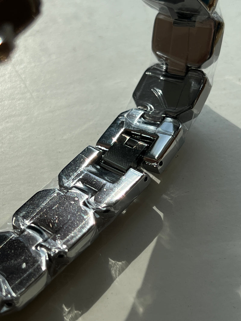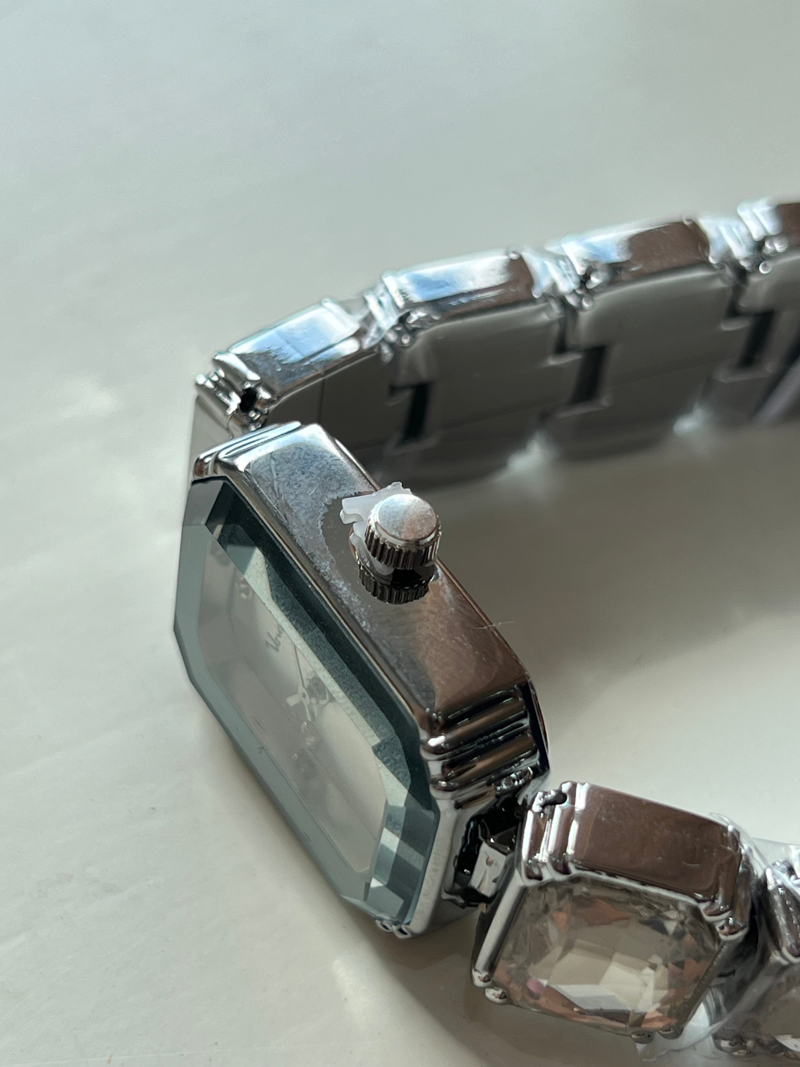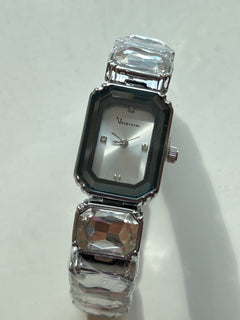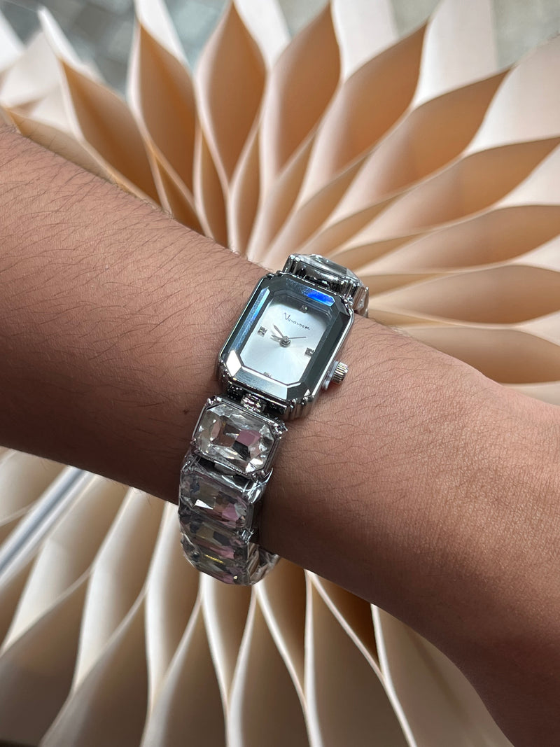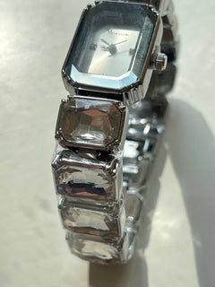 Reloj de pulsera con caja rectangular plateada de bordes facetados. La esfera es plateada con cuatro marcadores brillantes y manecillas metálicas finas. La correa está compuesta por eslabones decorados con cristales de gran tamaño.