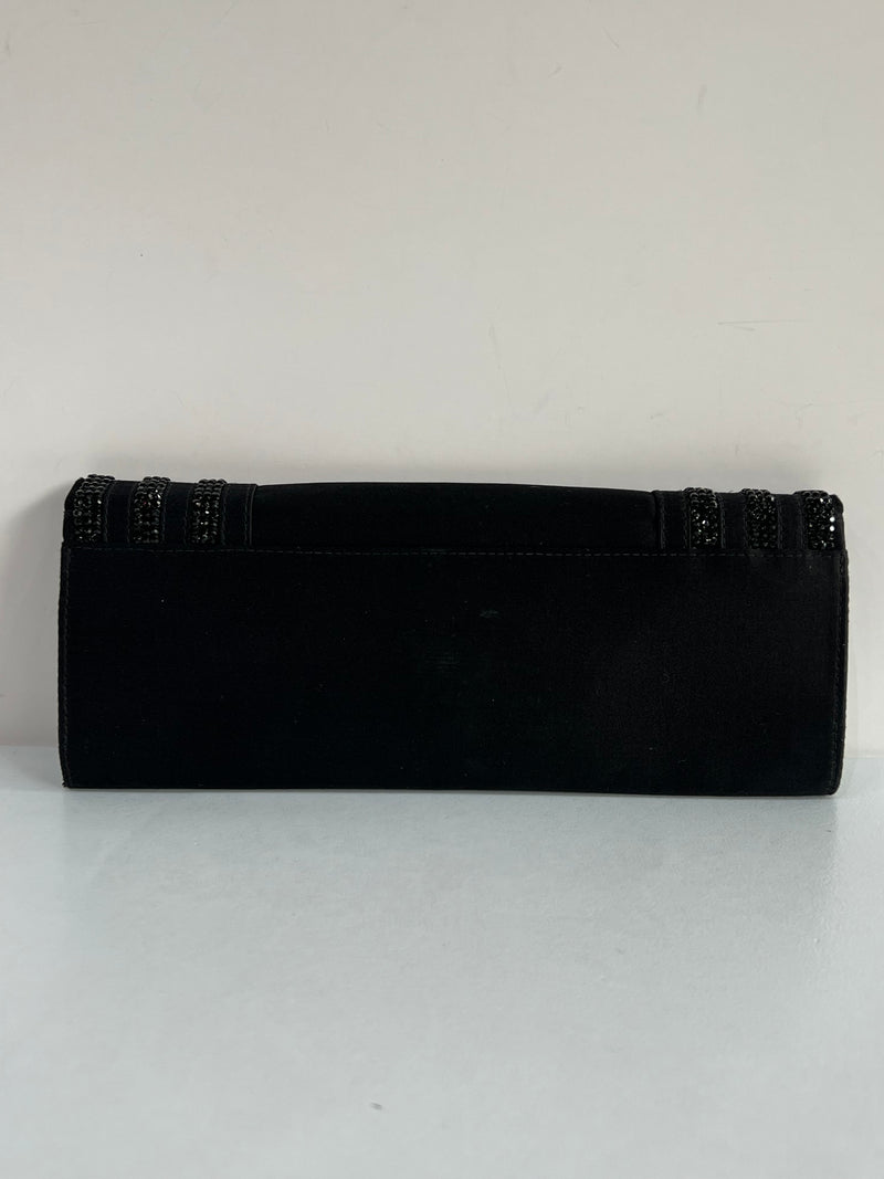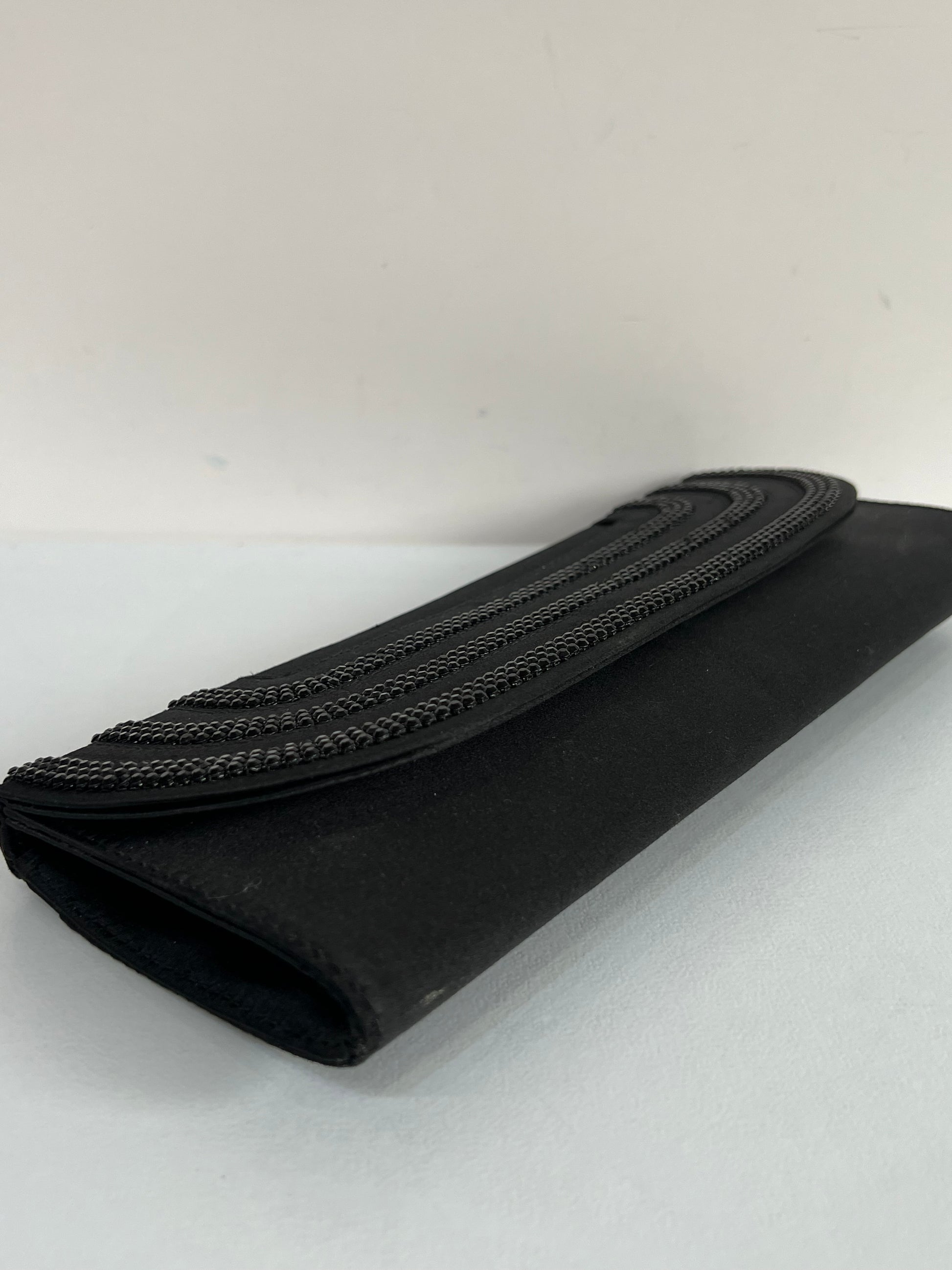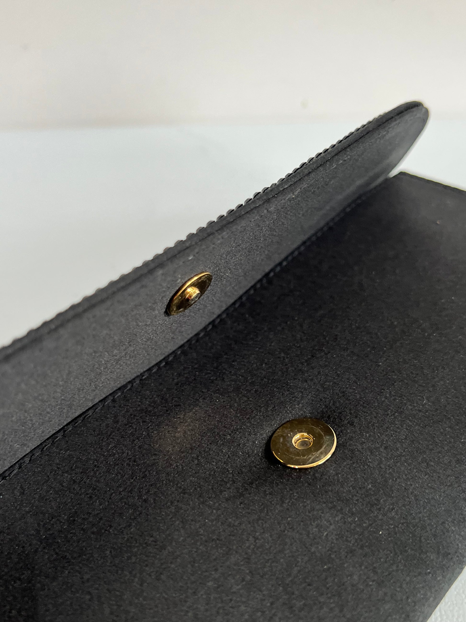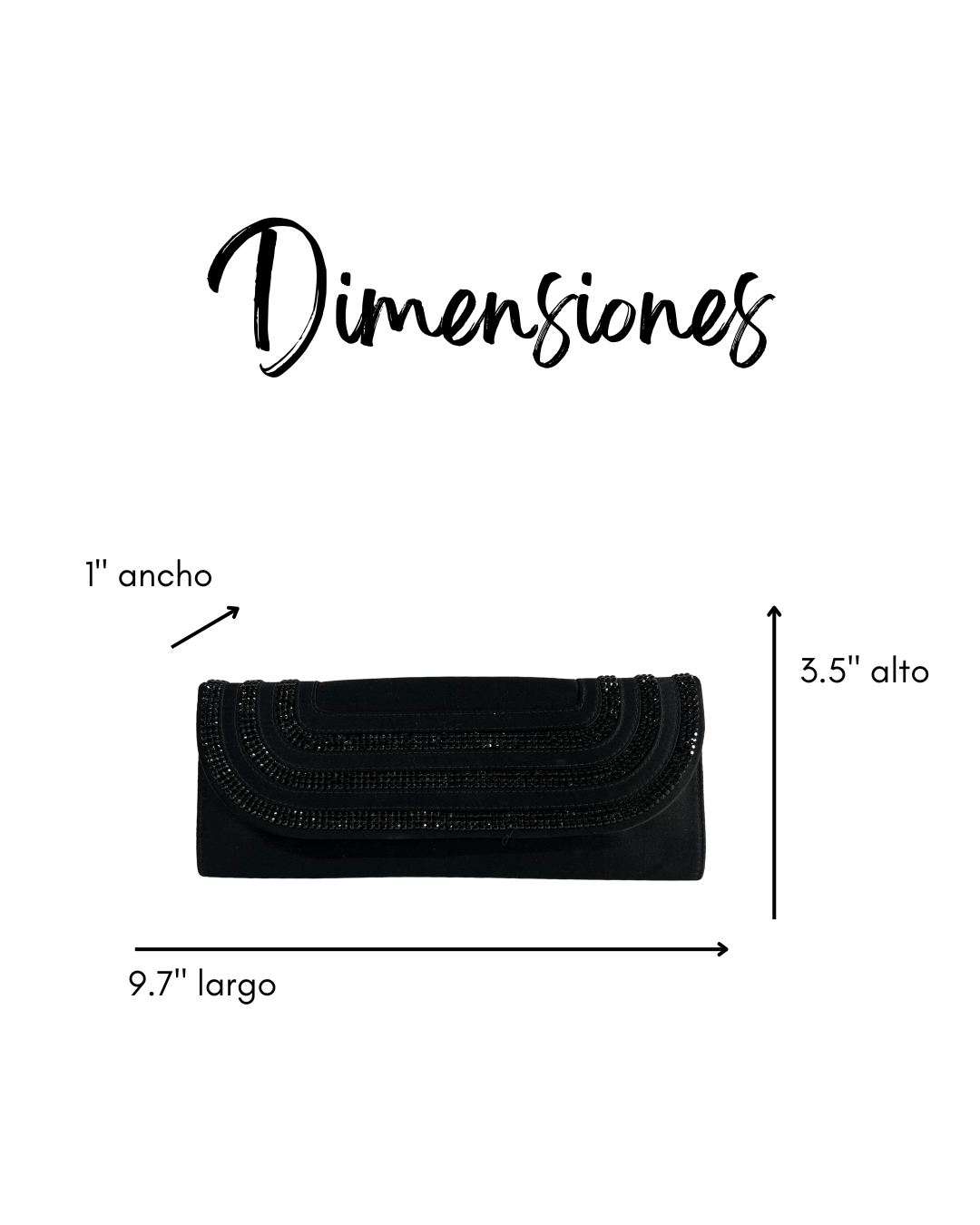 Es un bolso compacto, sin asas y sin correa. Cierre tipo flap con broche metálico, elaborada en satin. Cuenta con un compartimento interior ideal para tarjetas.