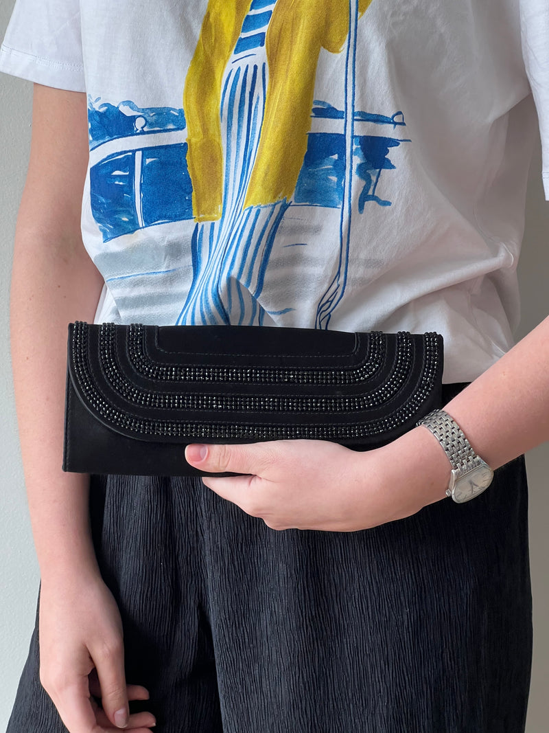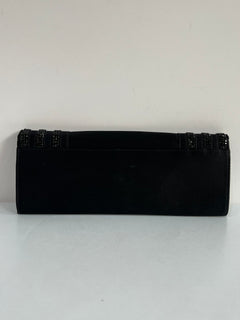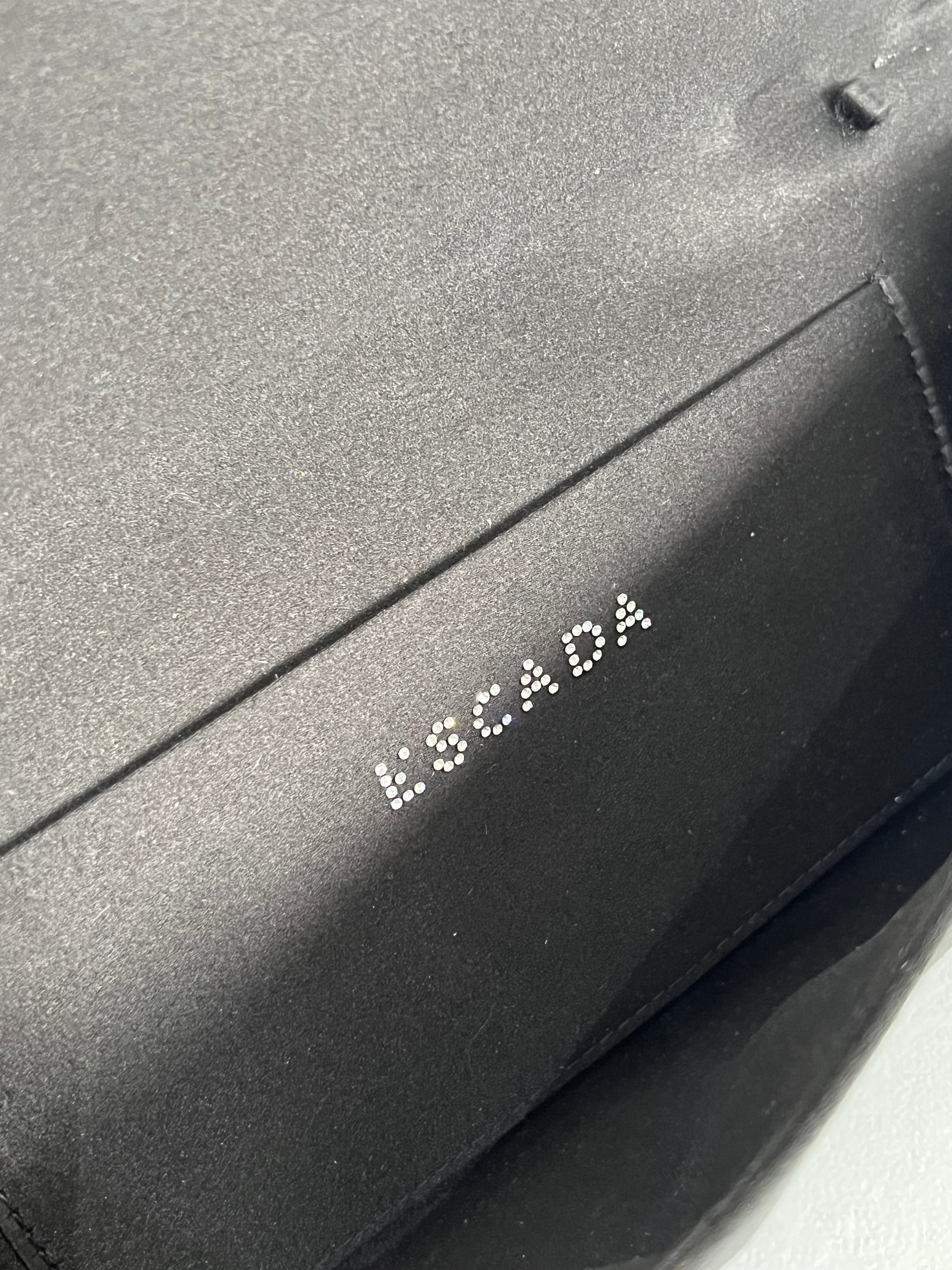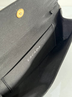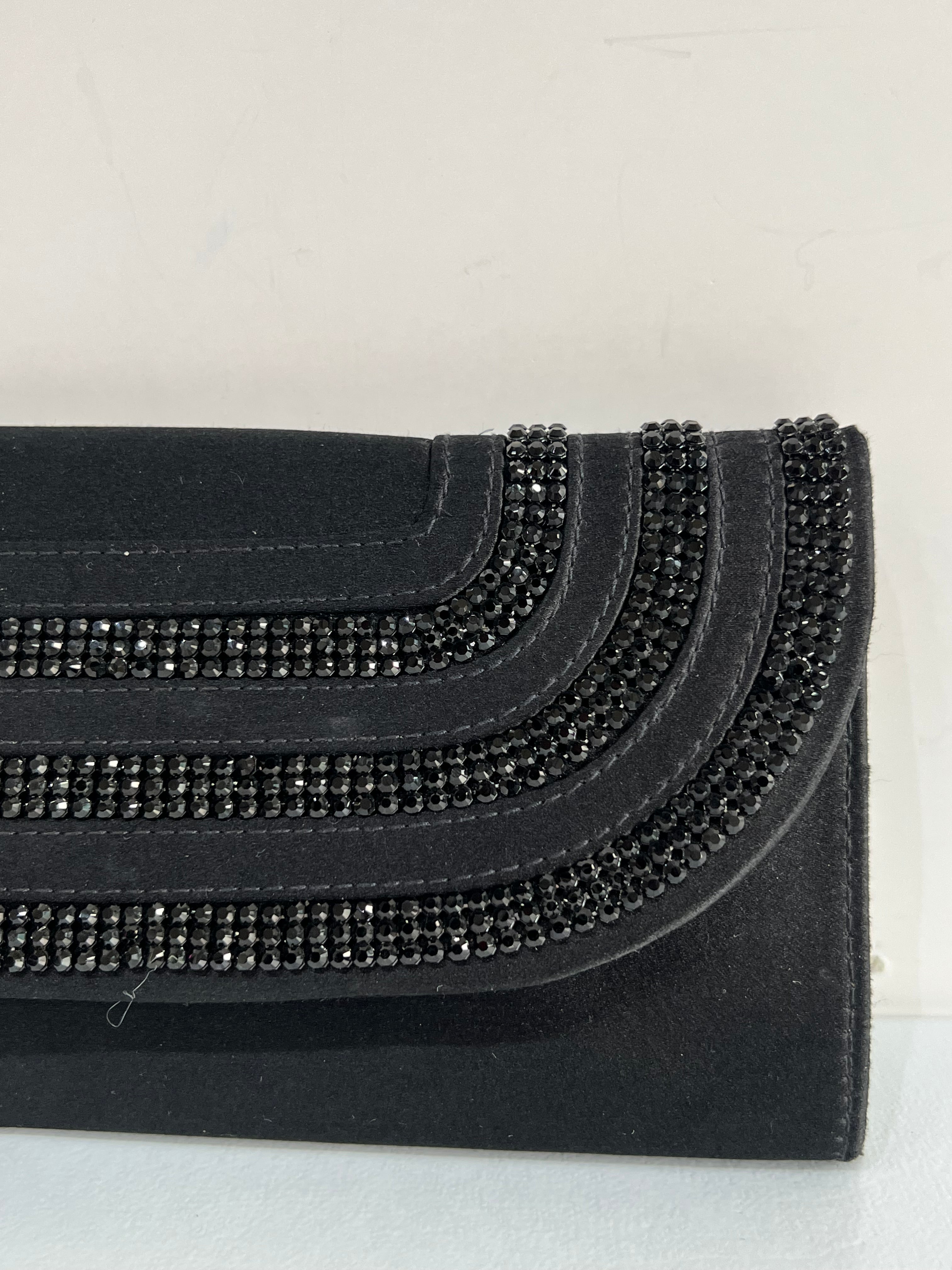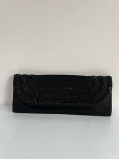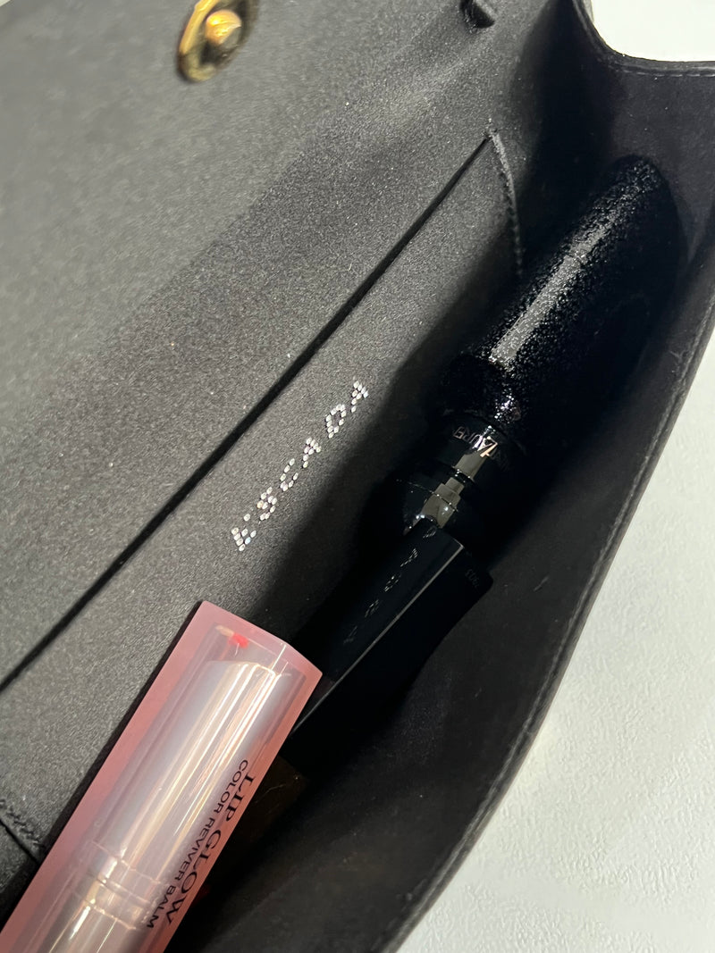 Es un bolso compacto, sin asas y sin correa. Cierre tipo flap con broche metálico, elaborada en satin. Cuenta con un compartimento interior ideal para tarjetas.