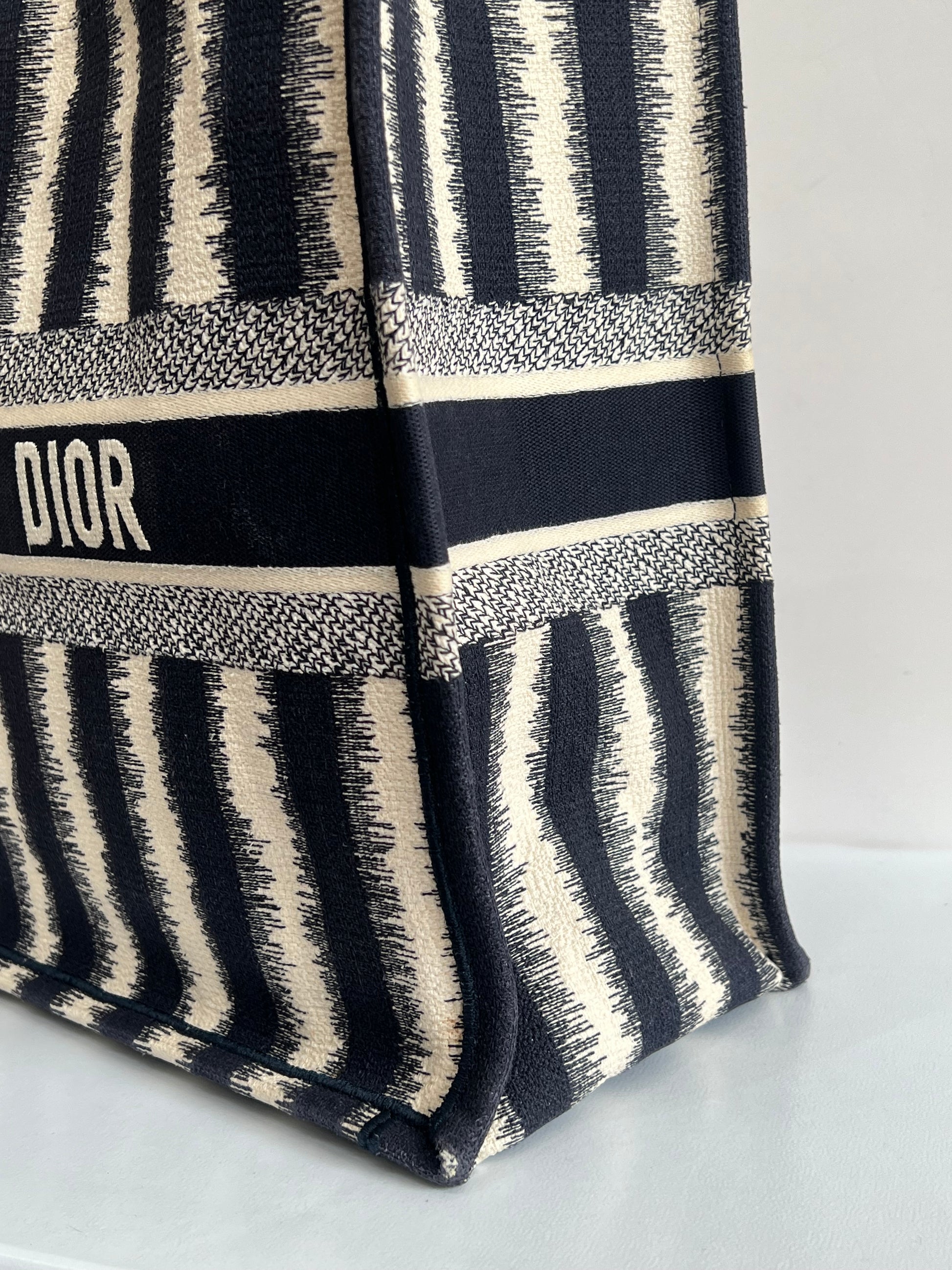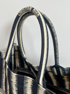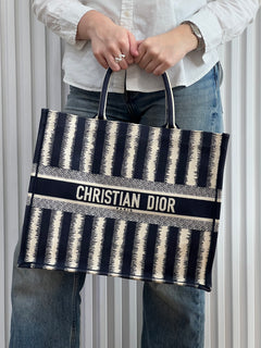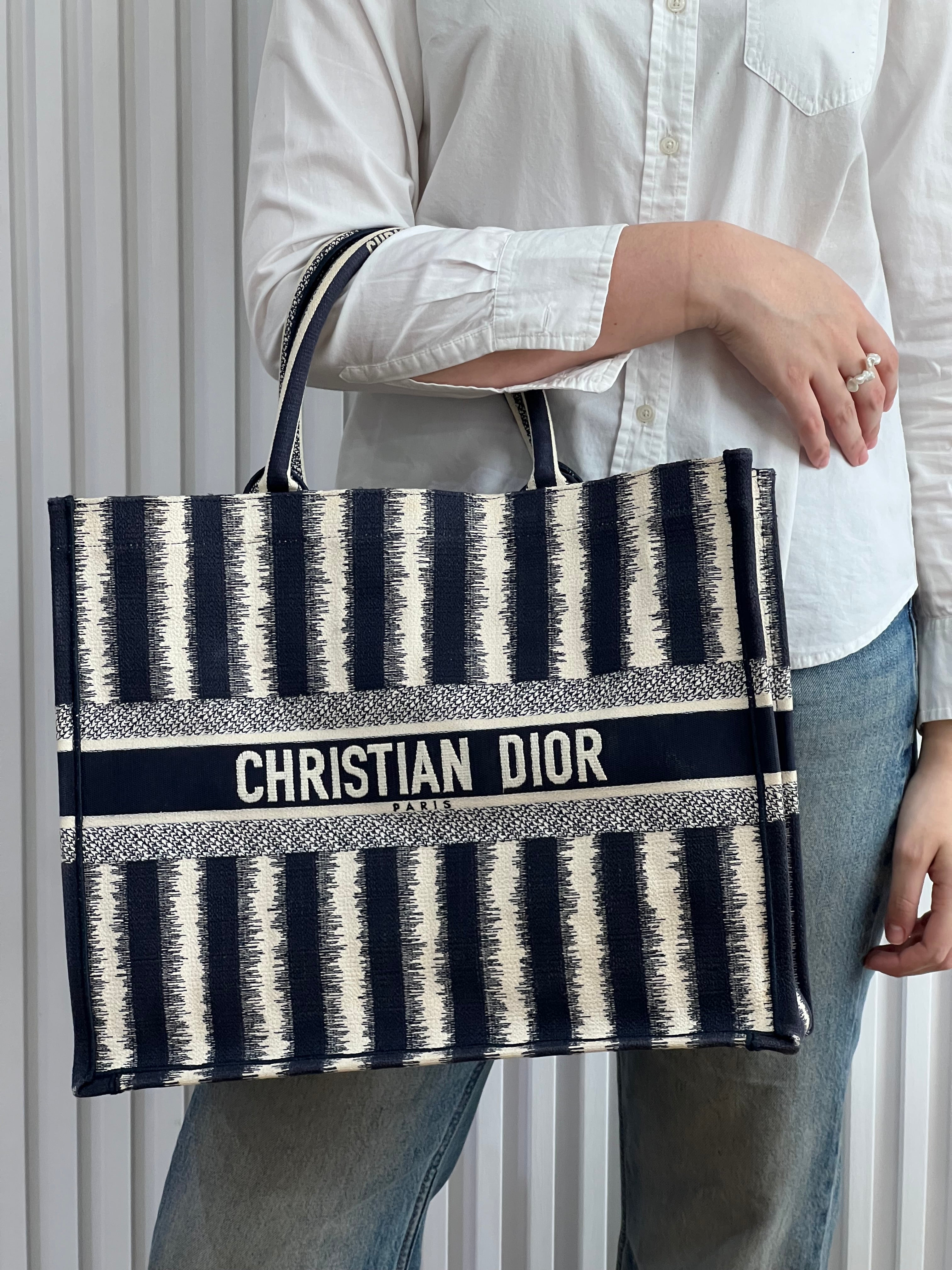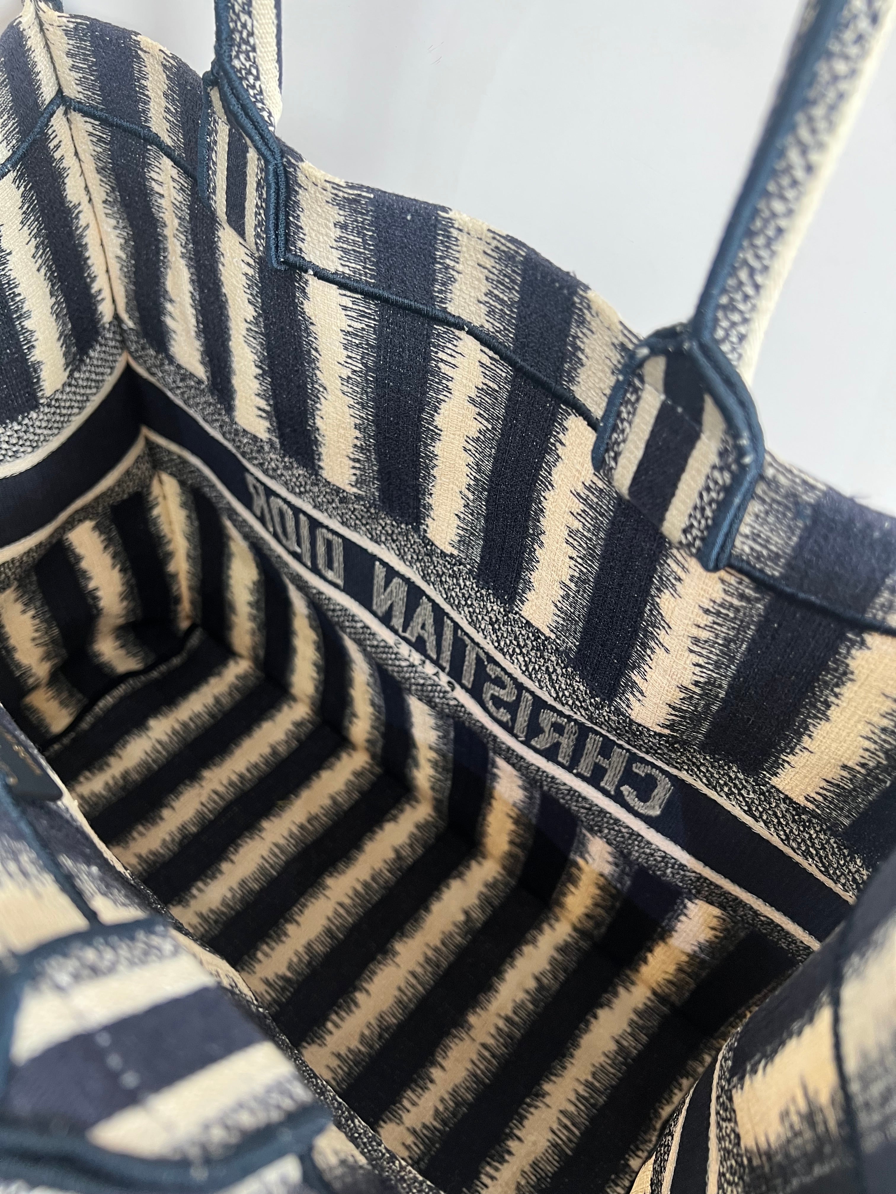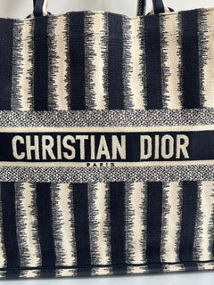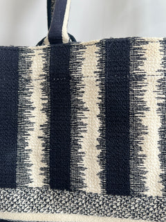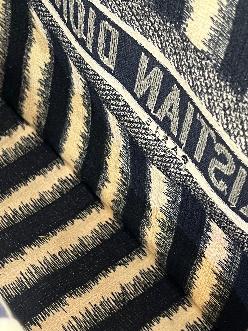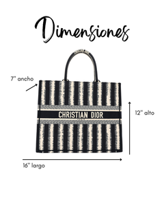 Presenta un diseño rectangular y estructura abierta, completamente bordada. En el centro, luce el icónico logo “CHRISTIAN DIOR” bordado en contraste, enmarcado por franjas horizontales. Sus asas superiores están integradas al cuerpo del bolso, permitiendo llevarla cómodamente en mano o al hombro.