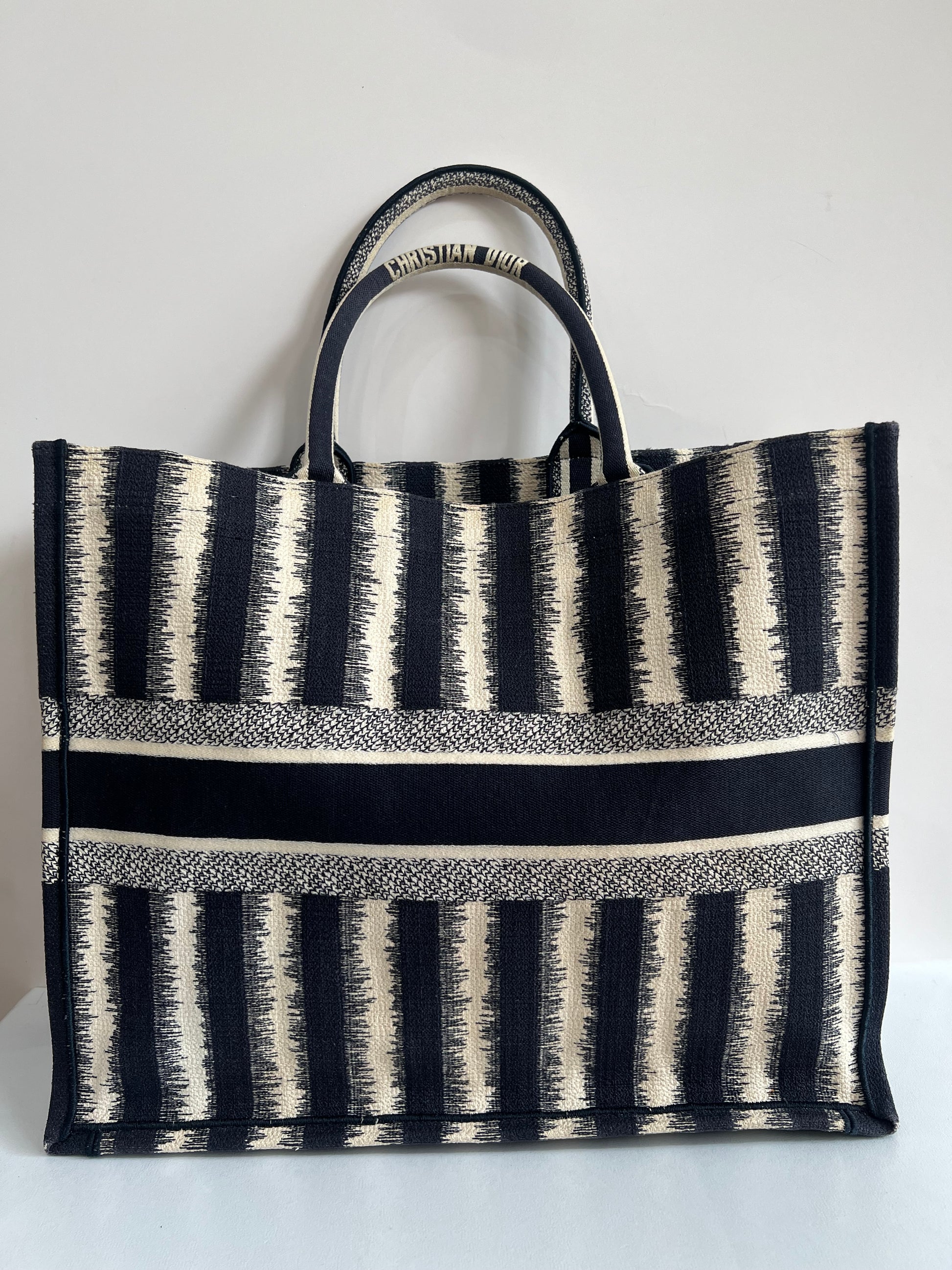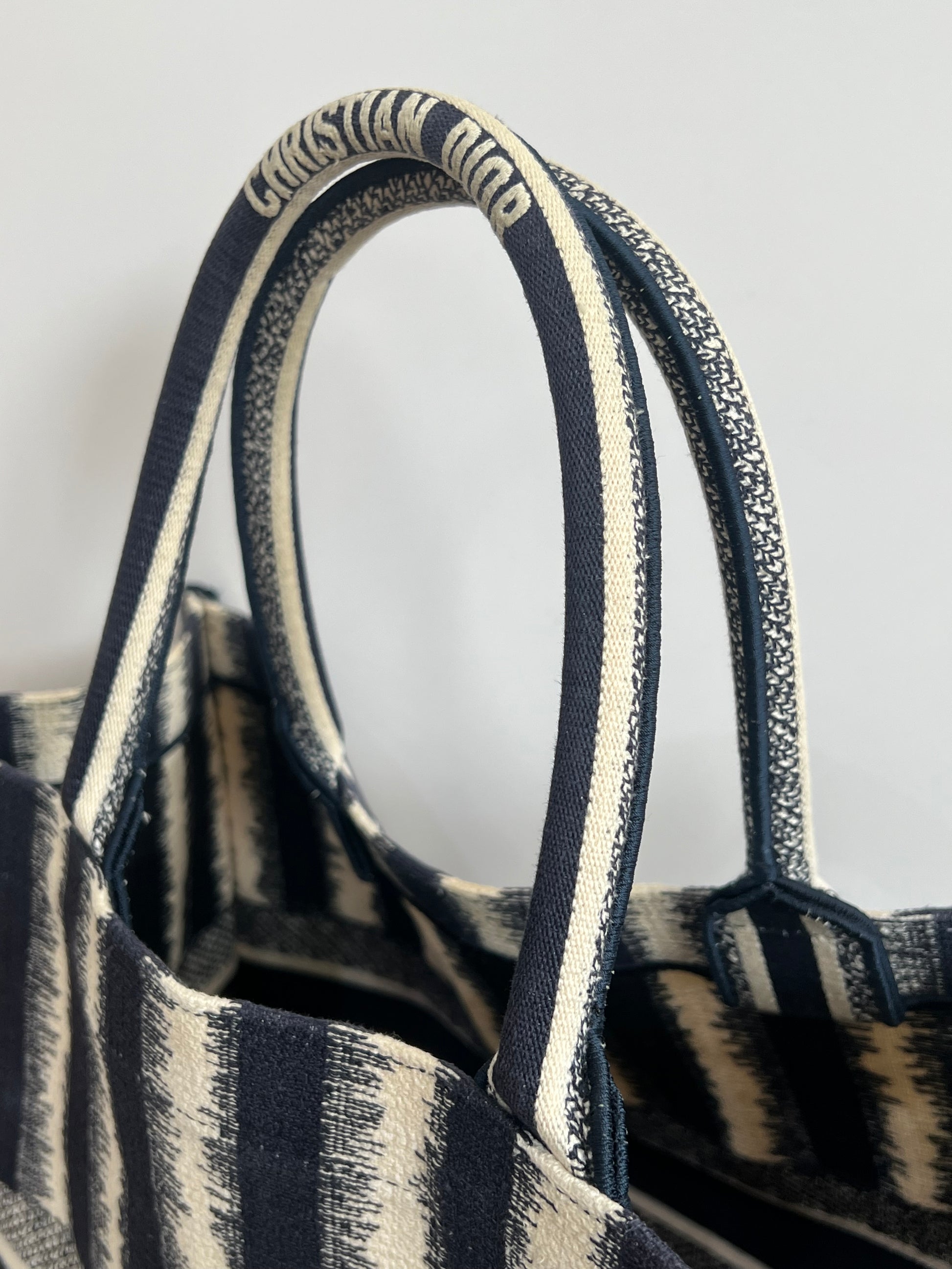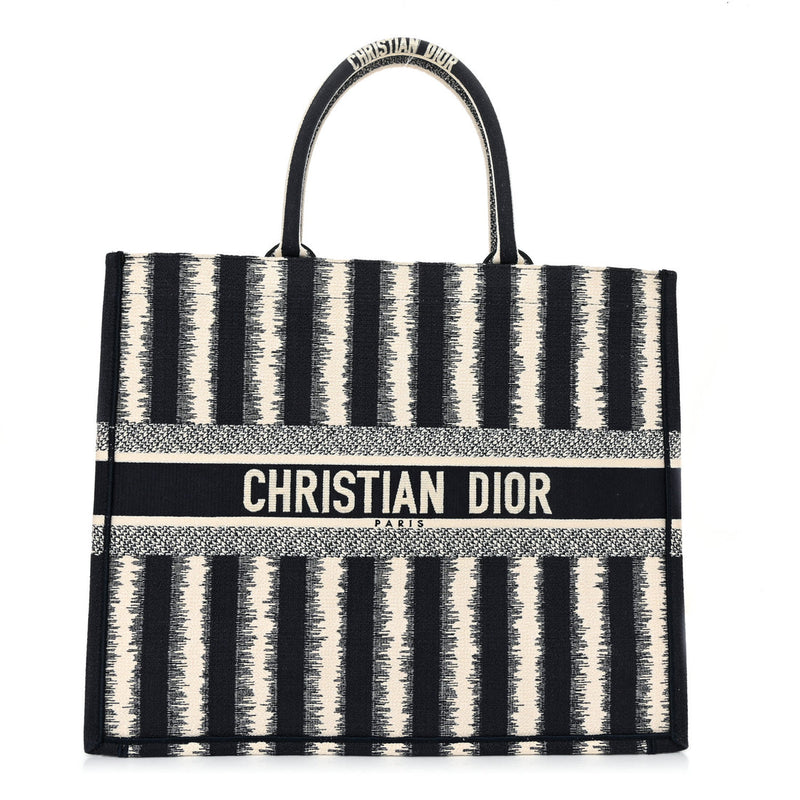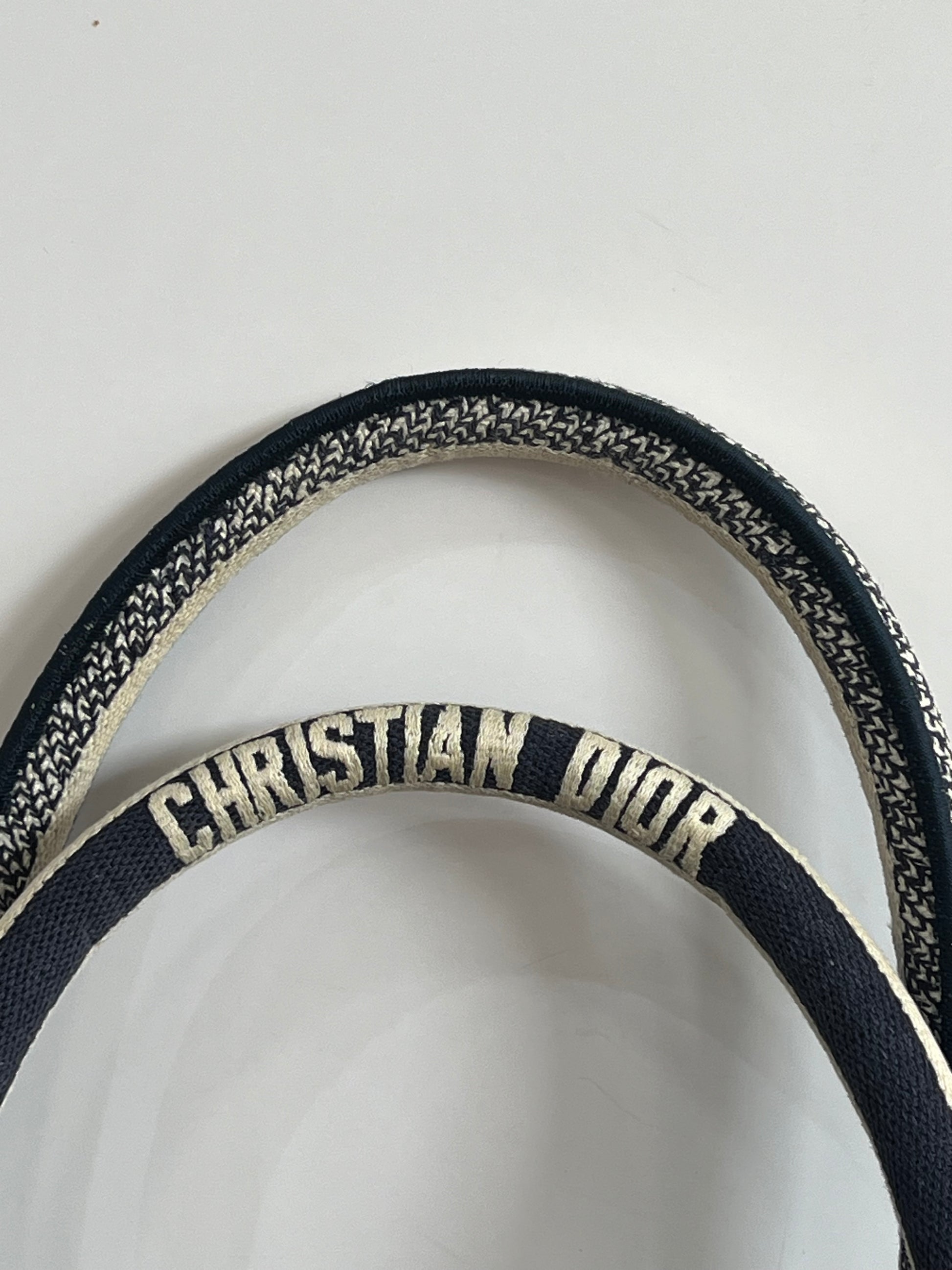 Presenta un diseño rectangular y estructura abierta, completamente bordada. En el centro, luce el icónico logo “CHRISTIAN DIOR” bordado en contraste, enmarcado por franjas horizontales. Sus asas superiores están integradas al cuerpo del bolso, permitiendo llevarla cómodamente en mano o al hombro.