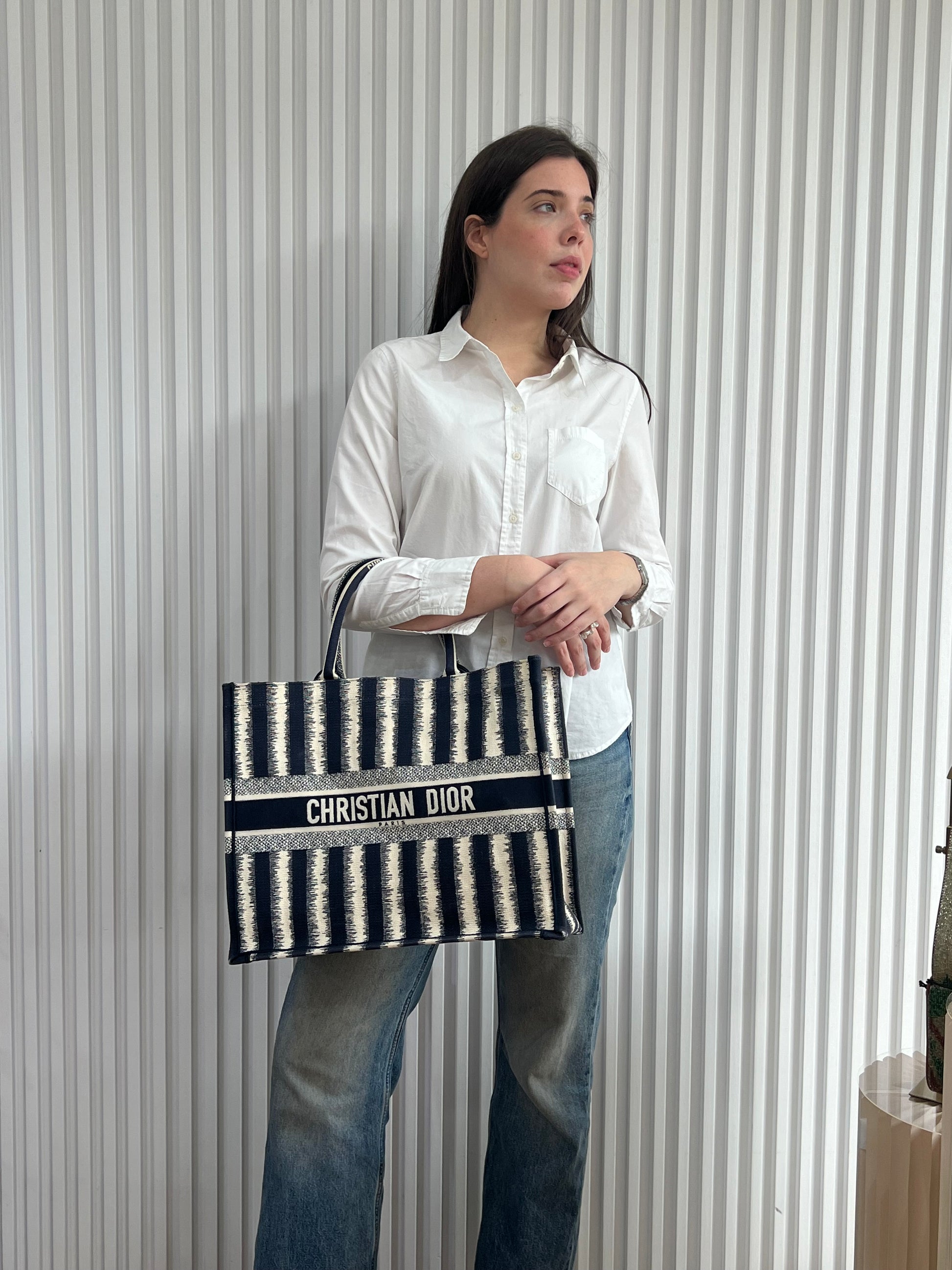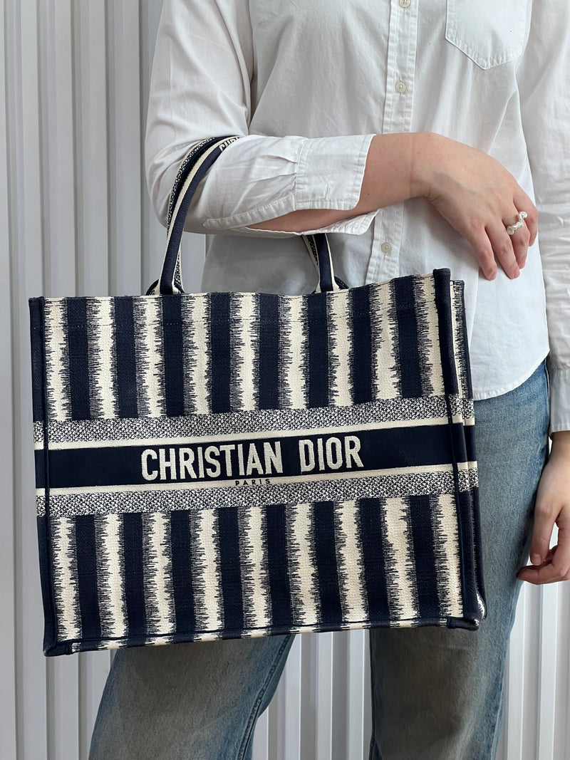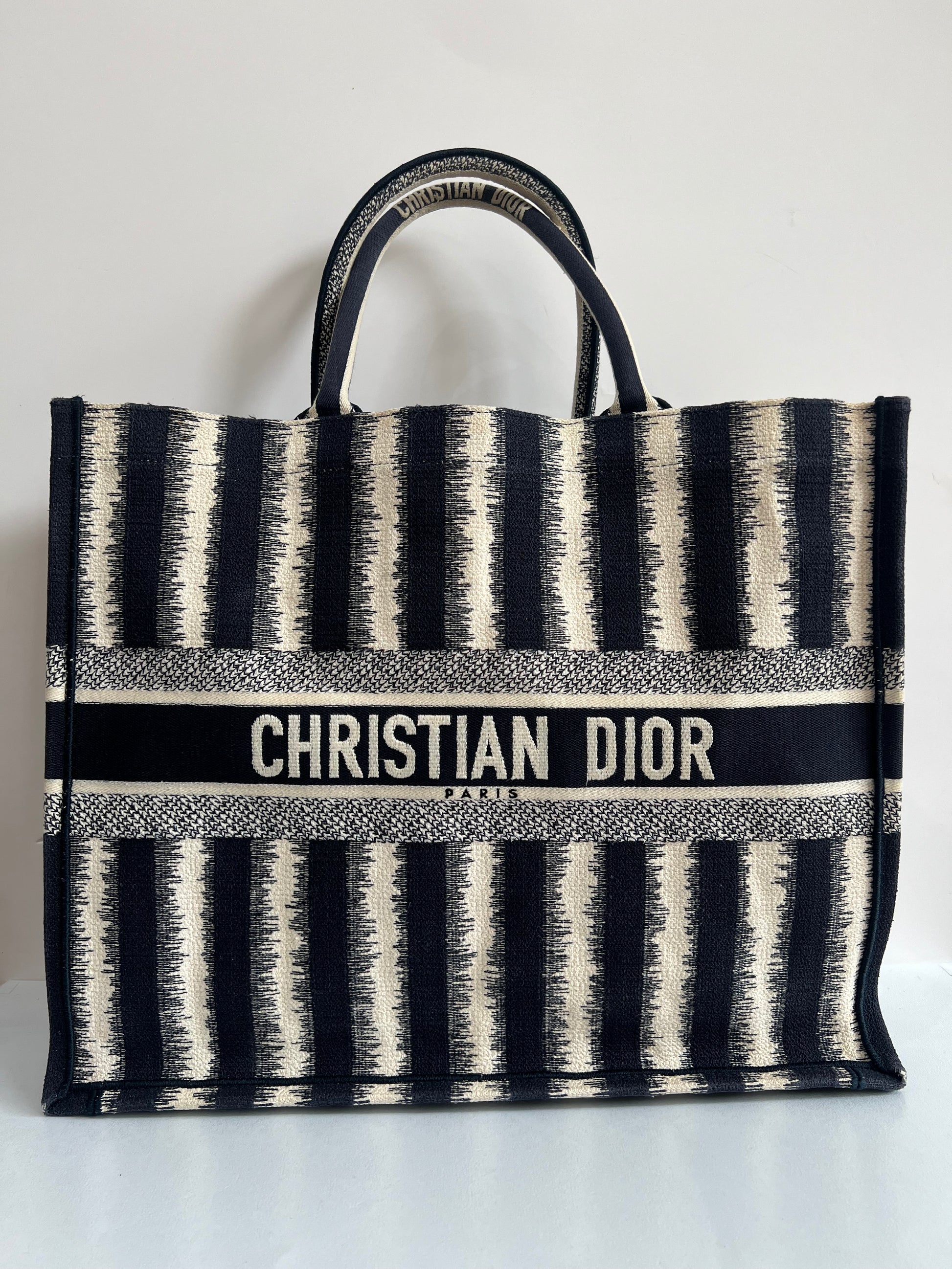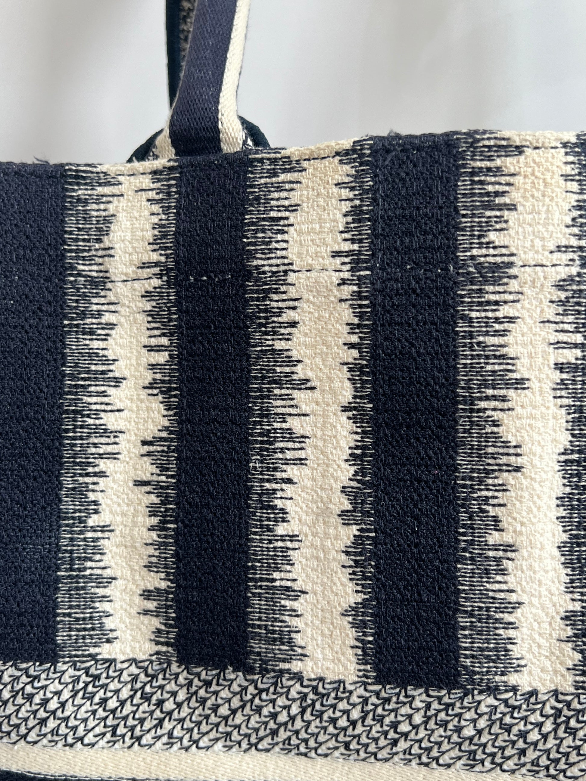 Presenta un diseño rectangular y estructura abierta, completamente bordada. En el centro, luce el icónico logo “CHRISTIAN DIOR” bordado en contraste, enmarcado por franjas horizontales. Sus asas superiores están integradas al cuerpo del bolso, permitiendo llevarla cómodamente en mano o al hombro.