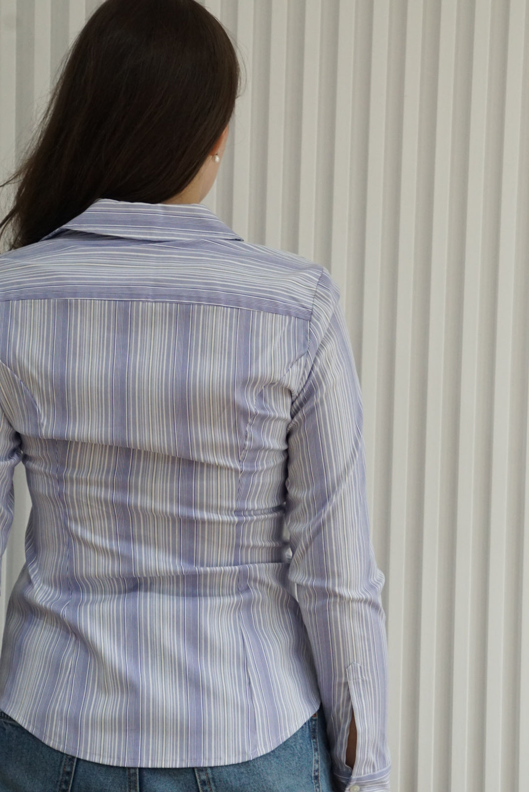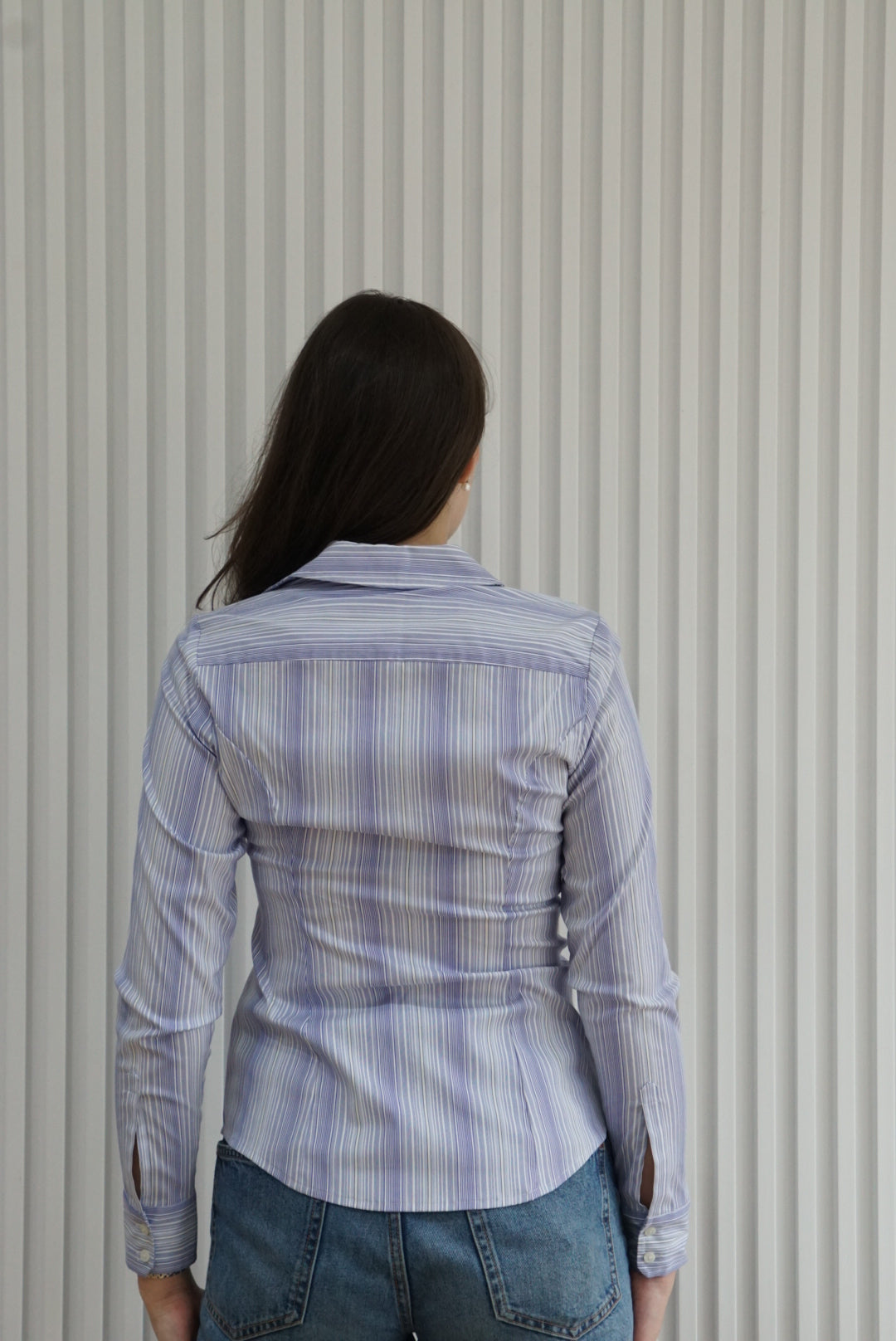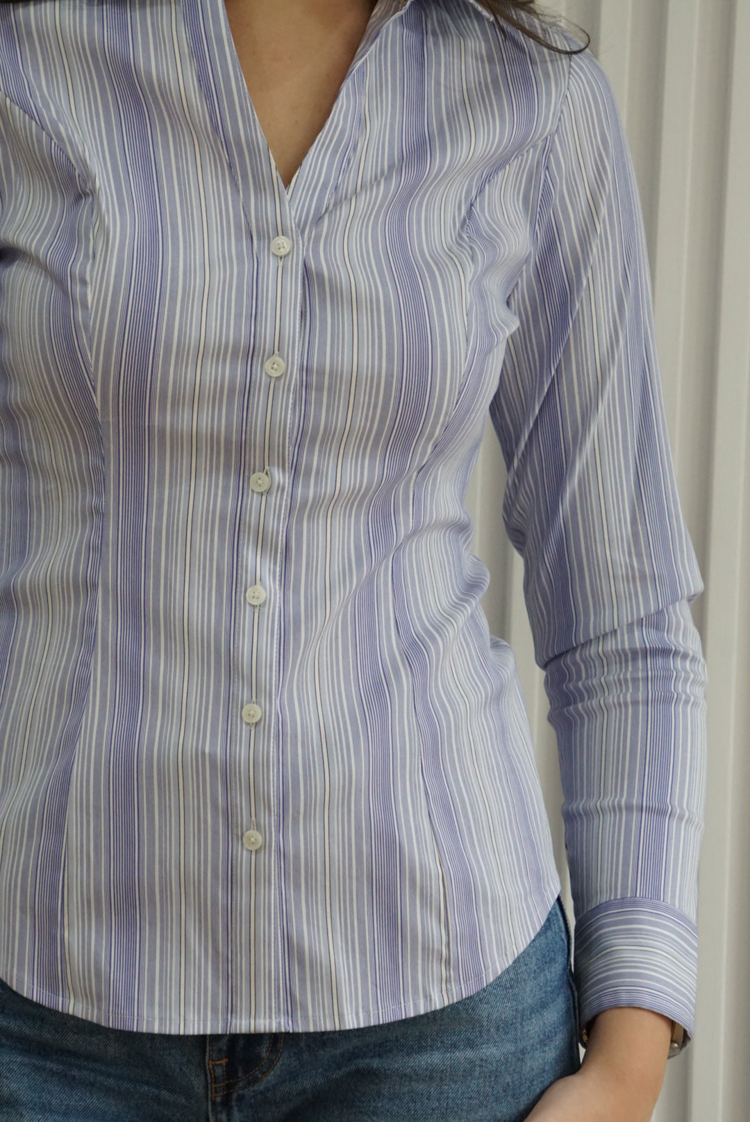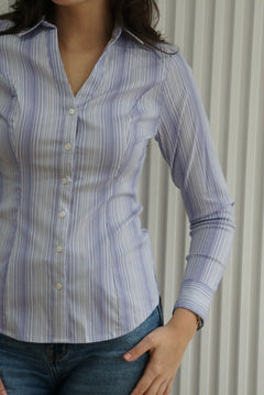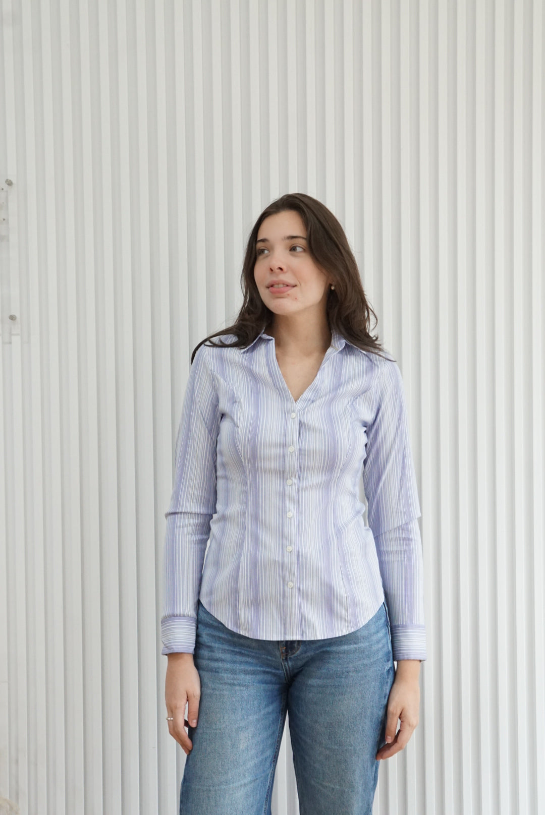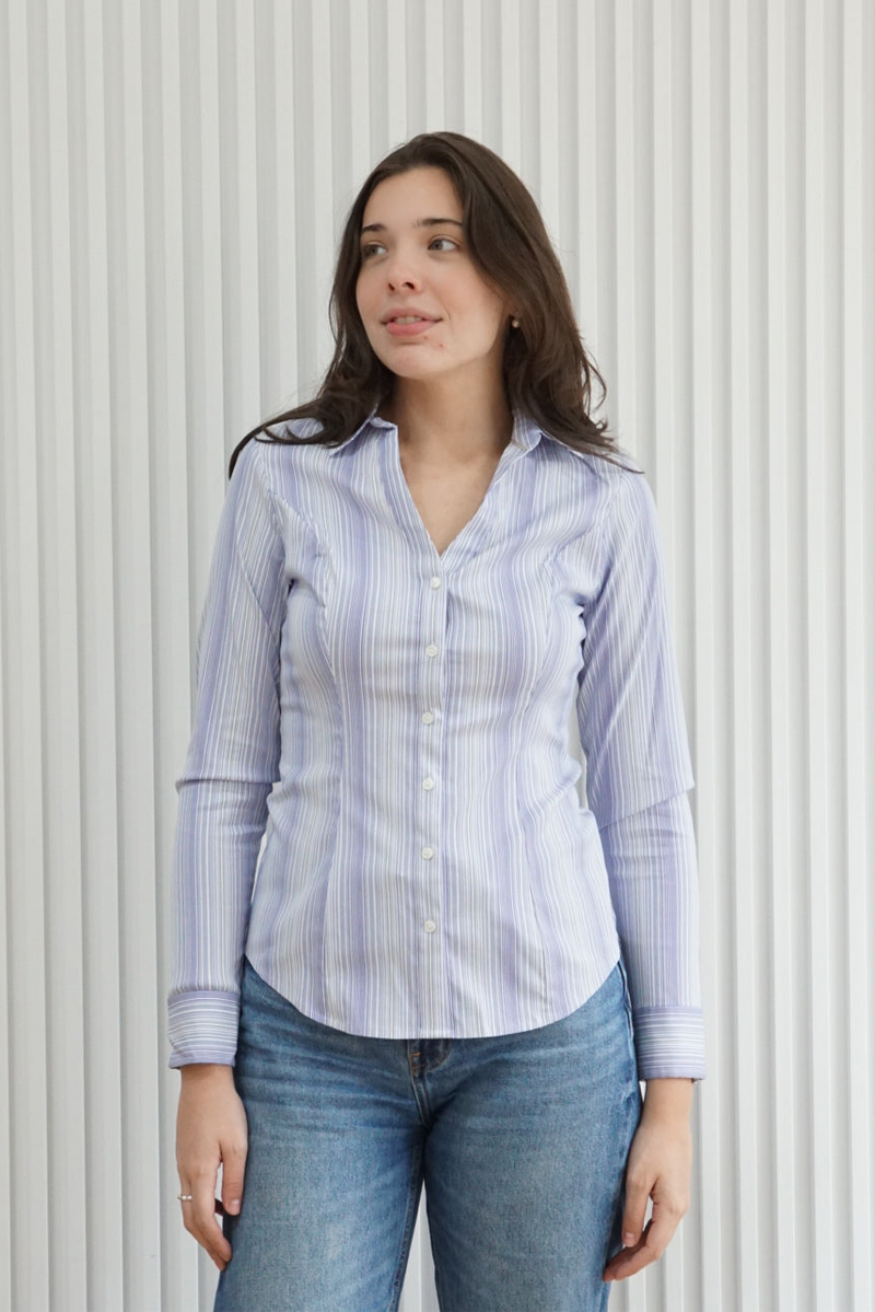 blusa manga larga de botones, con estampado rayado. Esta pieza tallada en la cintura. Ideal para usar en la oficina.
